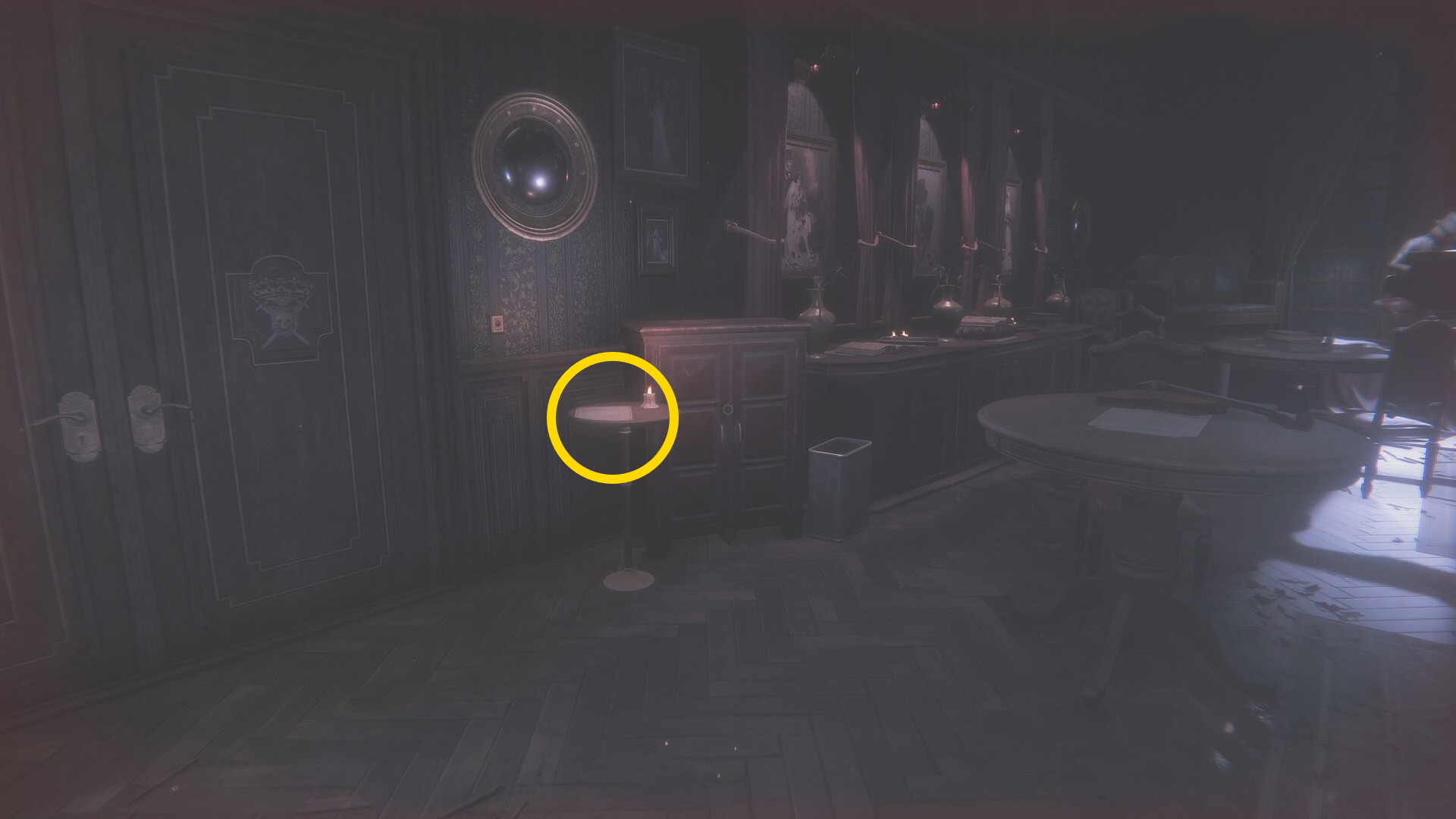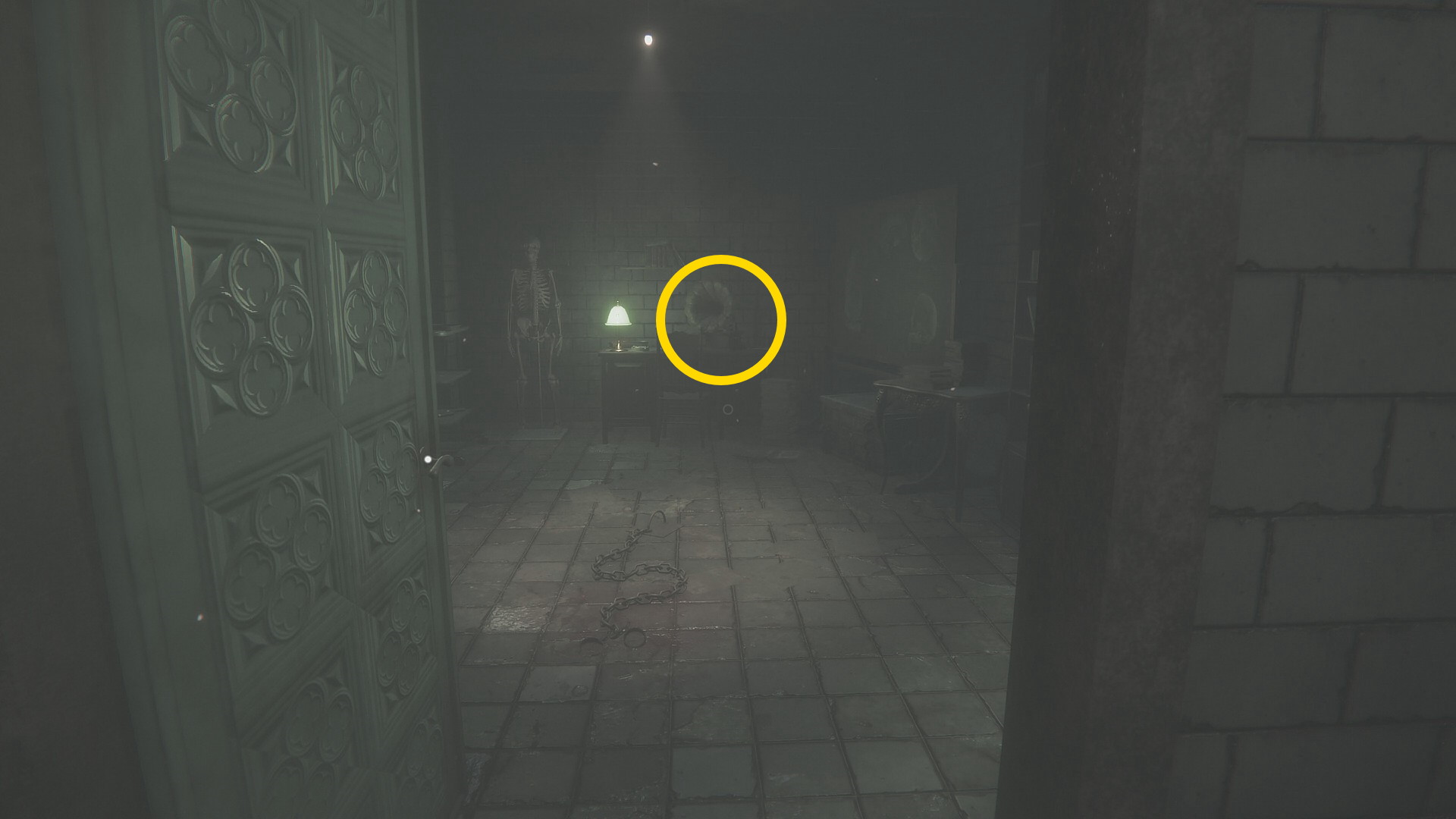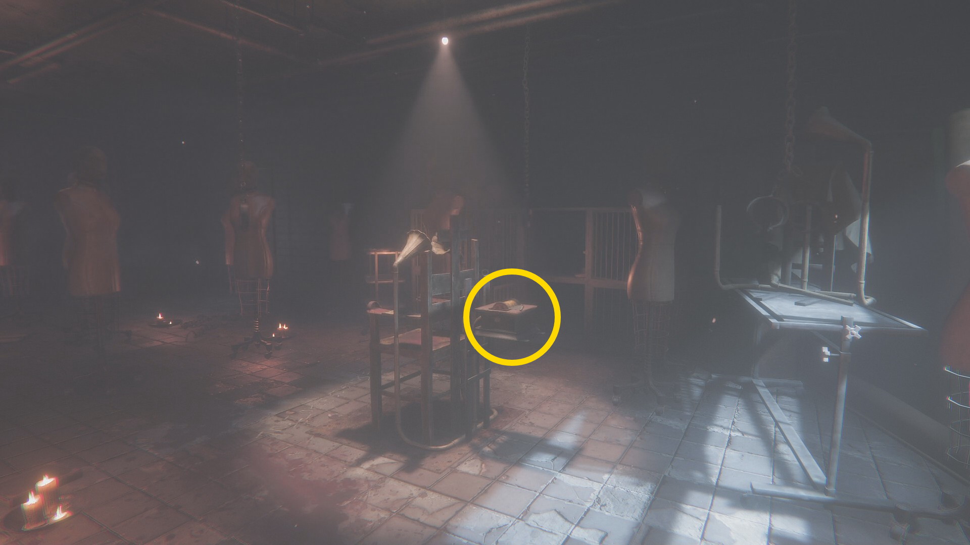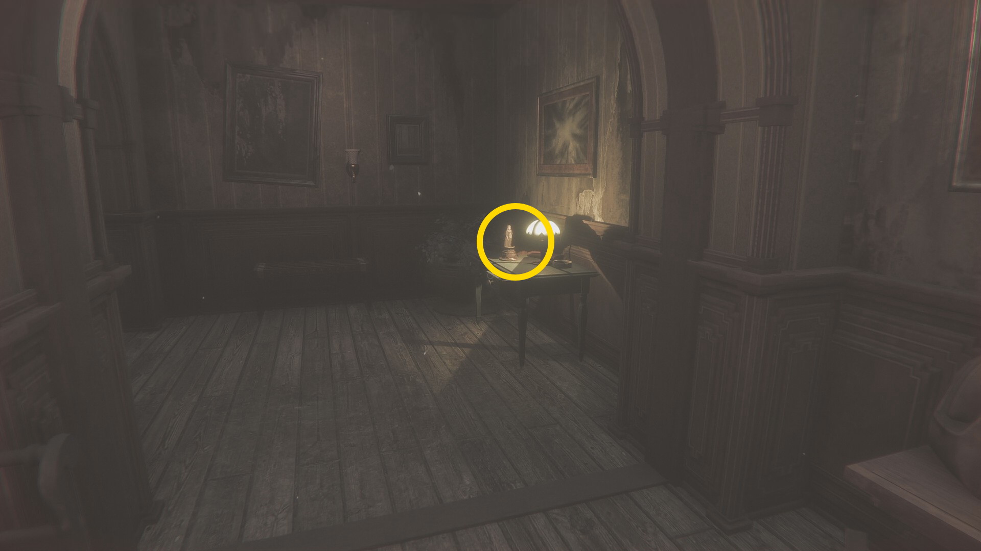 - 壊れた壁から廊下に出て左を向くとライトが灯るテーブルに オルゴール人形 (16/20)