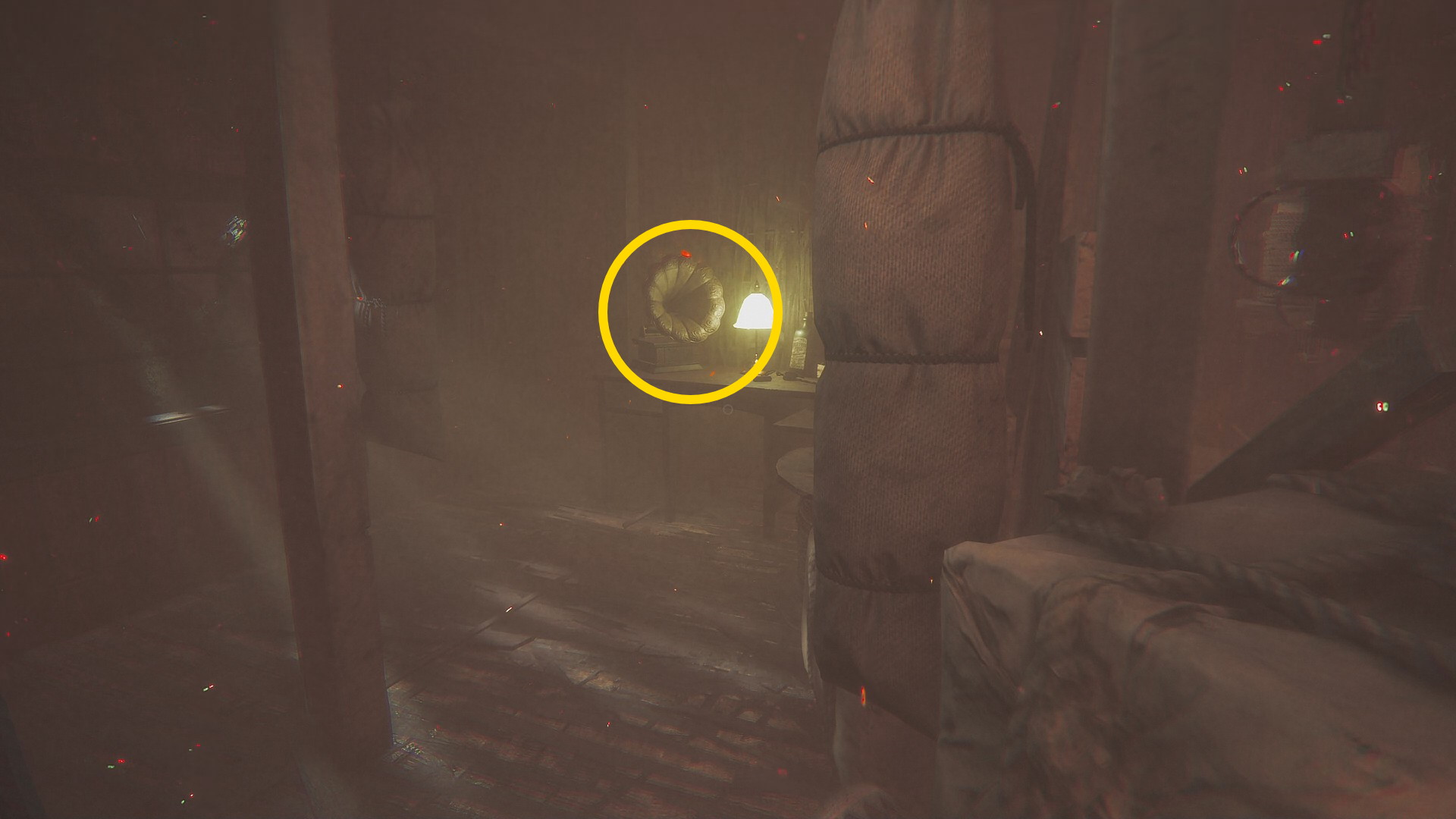 - やや右後ろに進むと小屋があり、その中に 蓄音機 (14/15) と回復薬