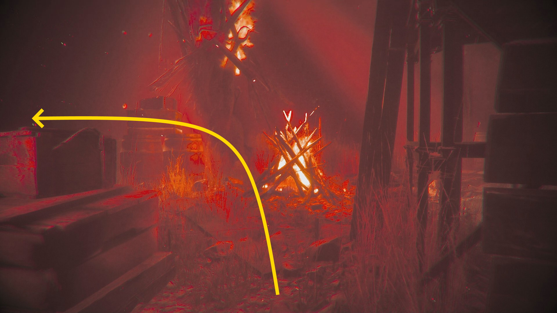 - 丁字路を右に進むと焚き火が正面に見える