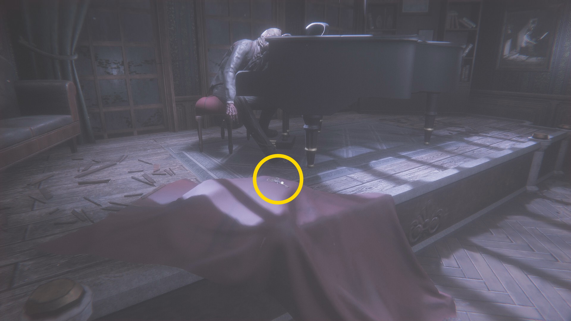 - グランドピアノのところに行くと床に 王冠の鍵 が落ちているので回収