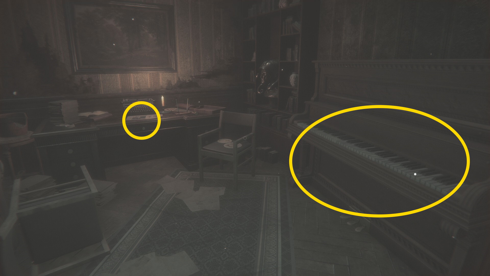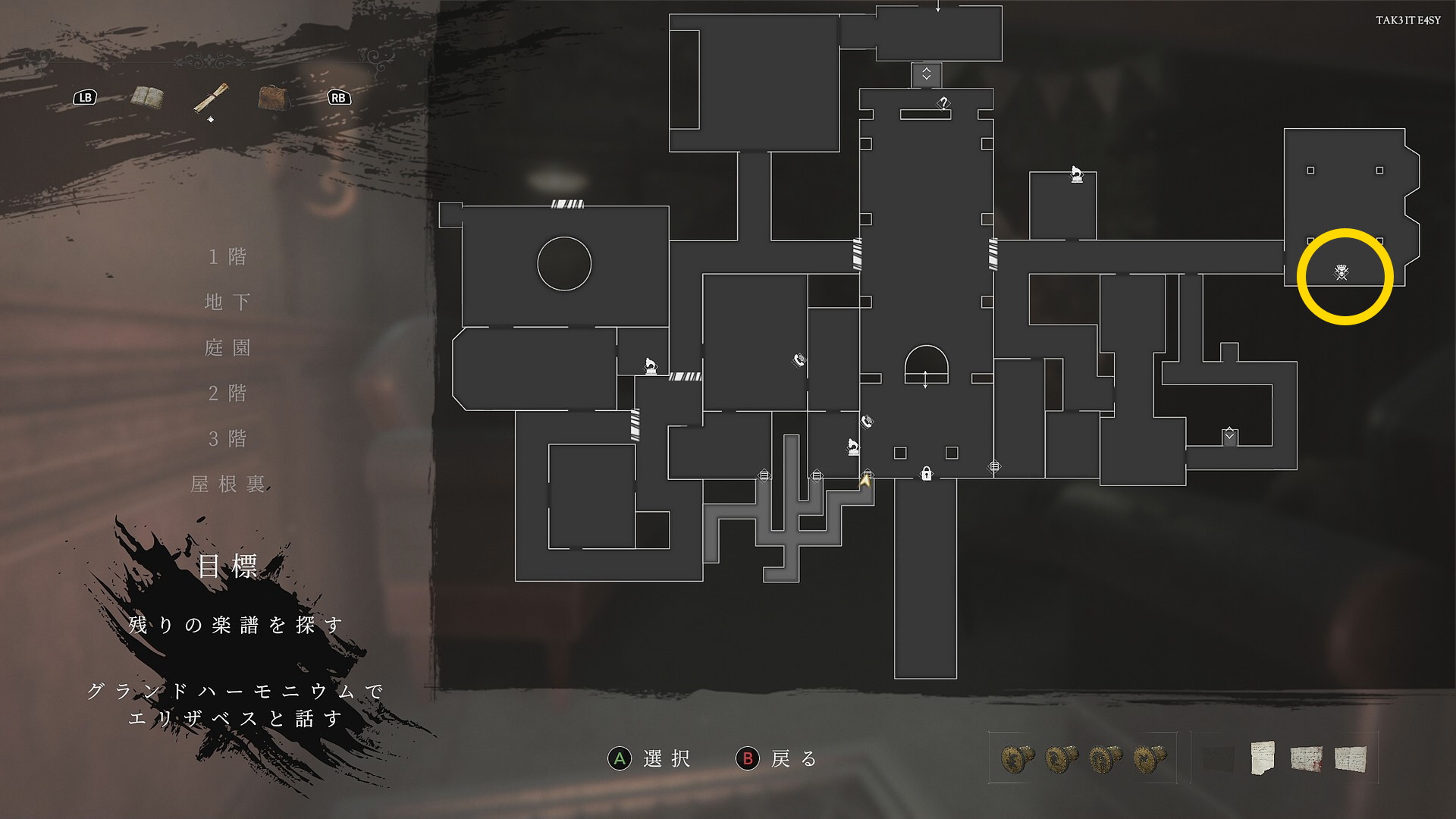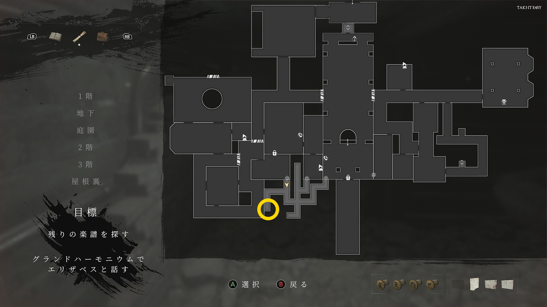 - 音楽の鍵が必要な部屋に向かう (解錠後は敵が巡回してくるので注意)
