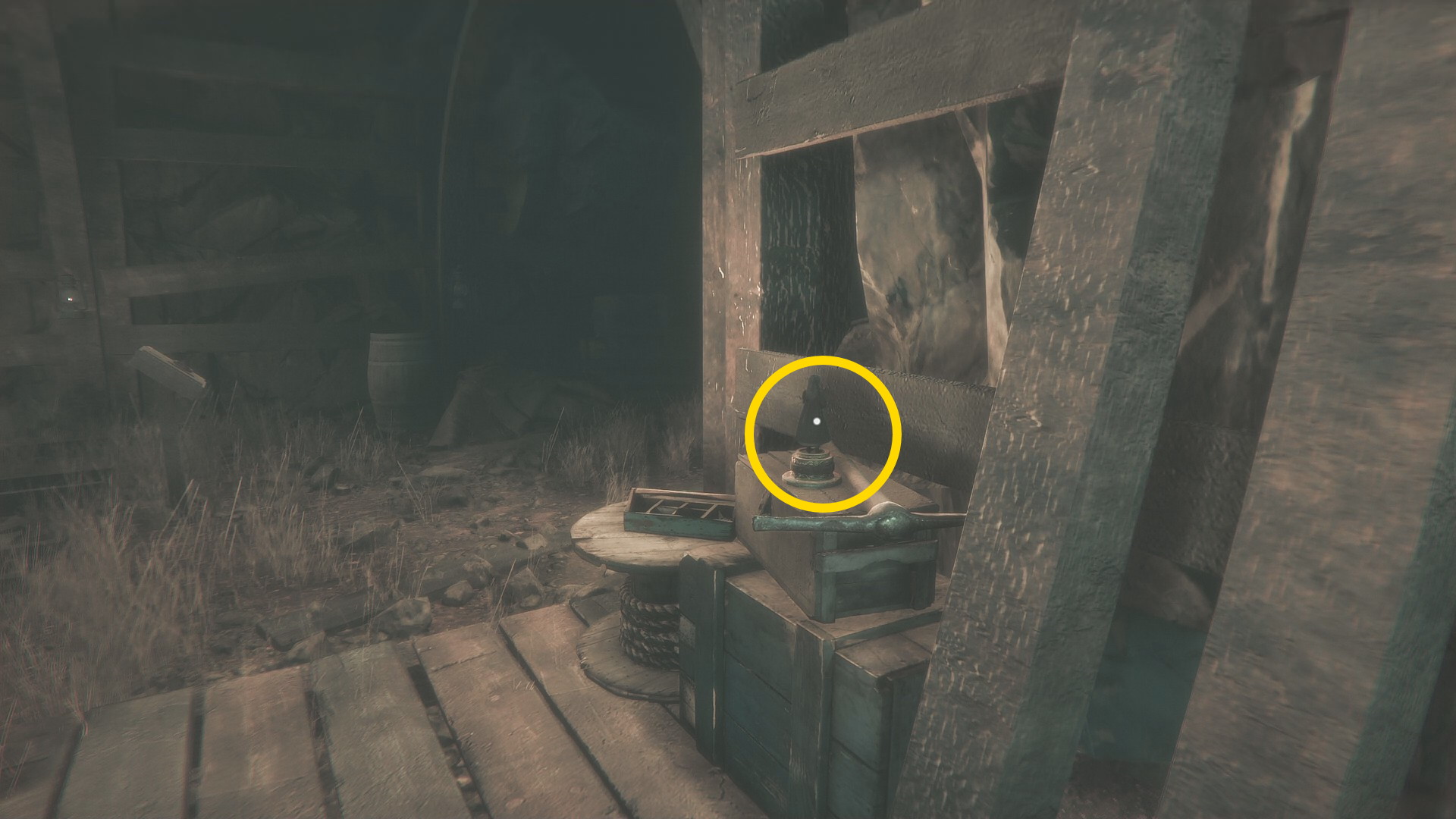 - 蓄音機の裏にある通路を進み、小屋から出る