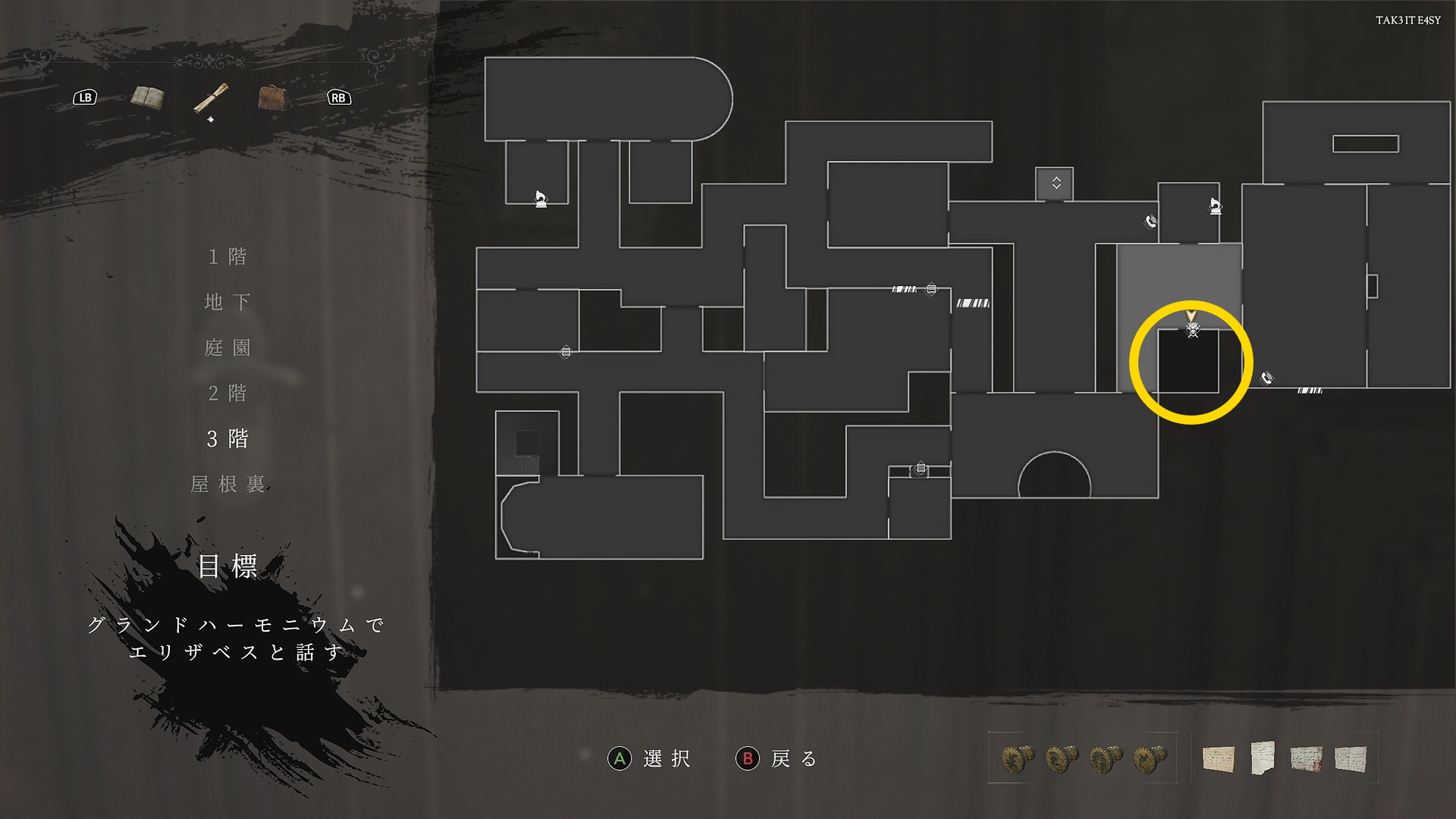 - 屋根裏部屋から下りてきたら、ダッシュで3階東側のセーブ部屋を目指す