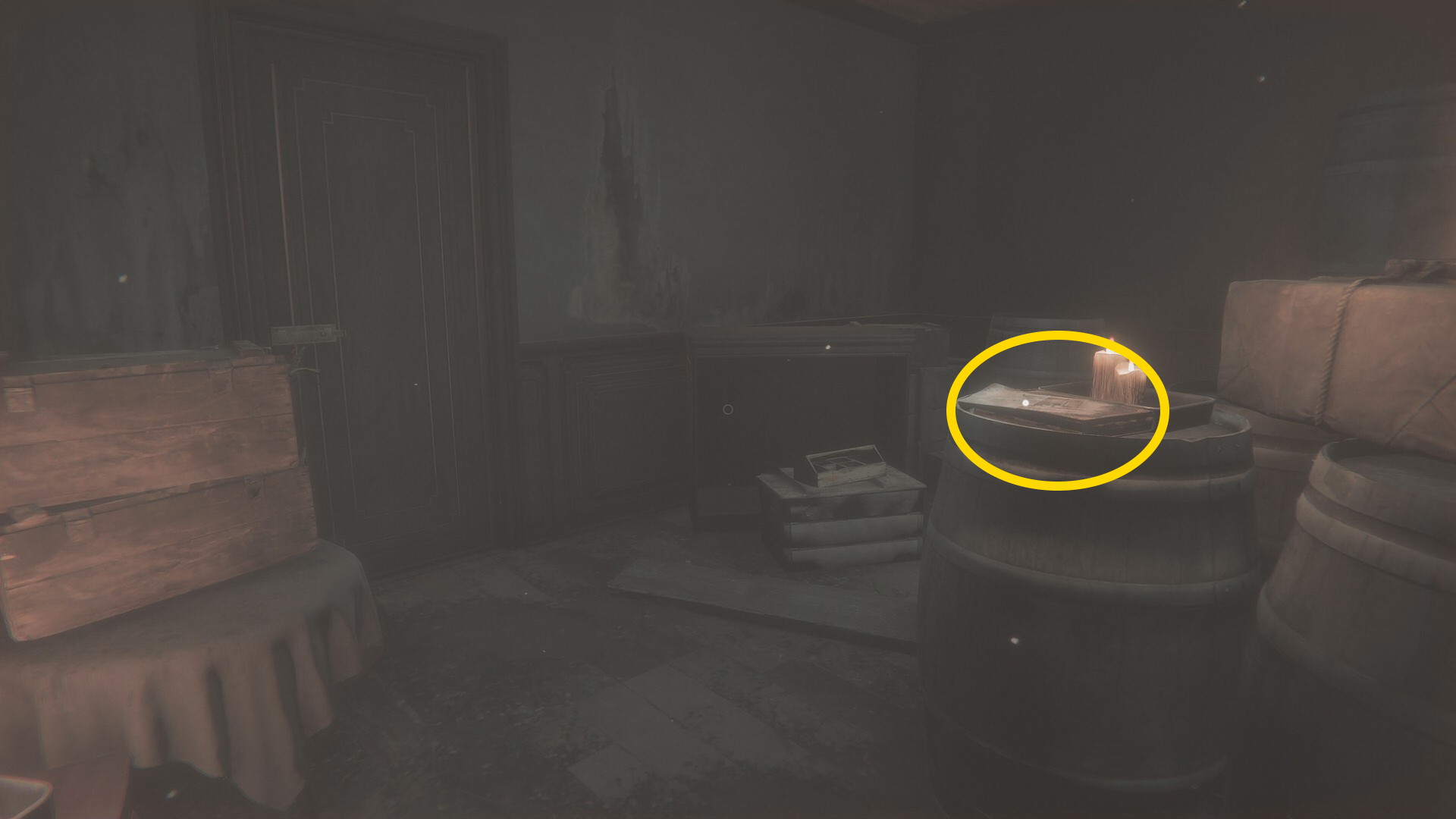 - ドアの近く、木樽の上に「俺はなにをしたのだ?」 ⇒ メモ (28/30)