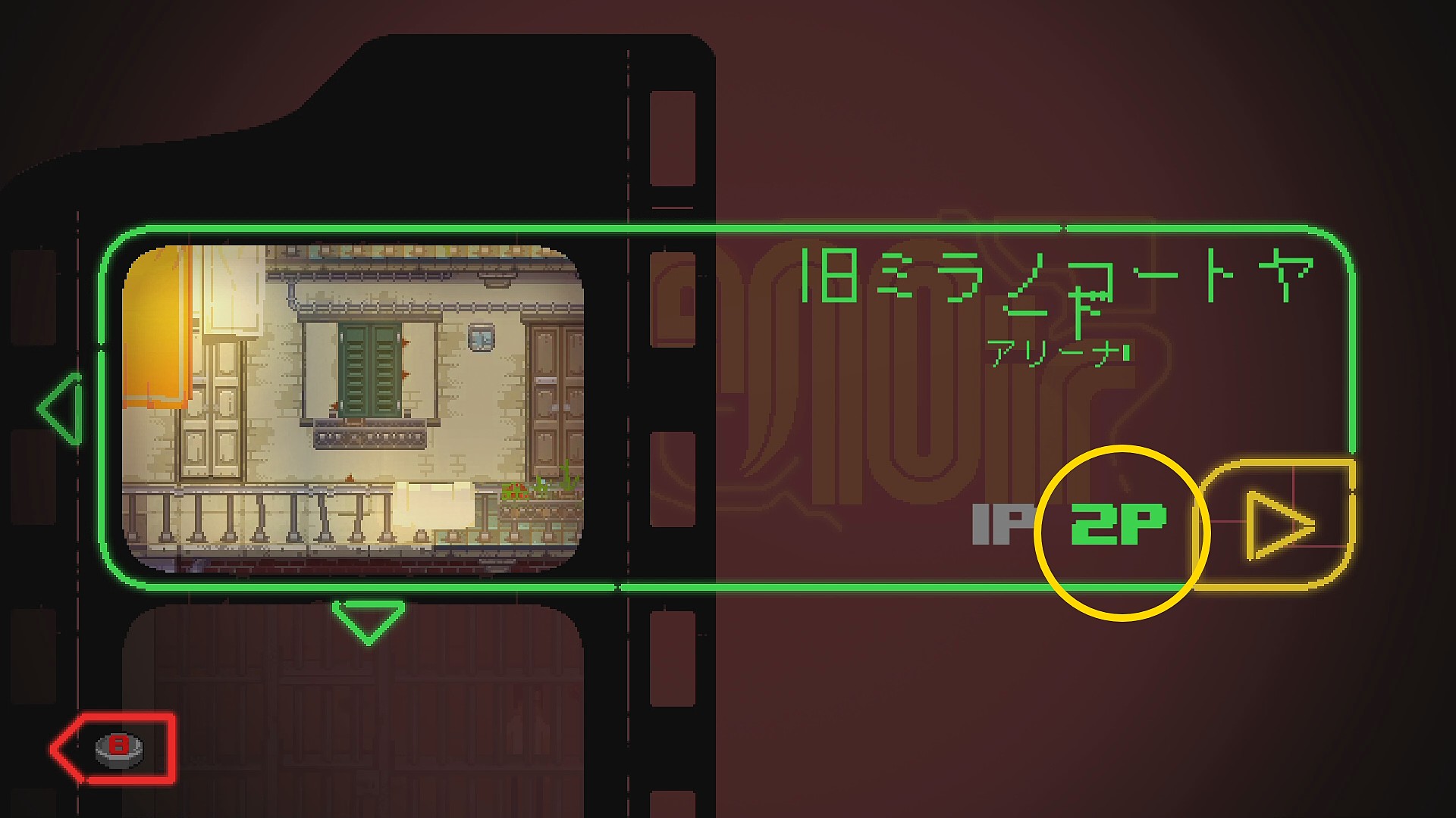 - アリーナモードのアリーナ選択画面で2コンを起動し、LS を右に動かして 2P の表示を緑にしてから A ボタン。次いで、2コン側の A ボタンを押してアリーナモードを開始 (ステージはどこでもよい。下画像の場合は「旧ミラノコートヤード」)