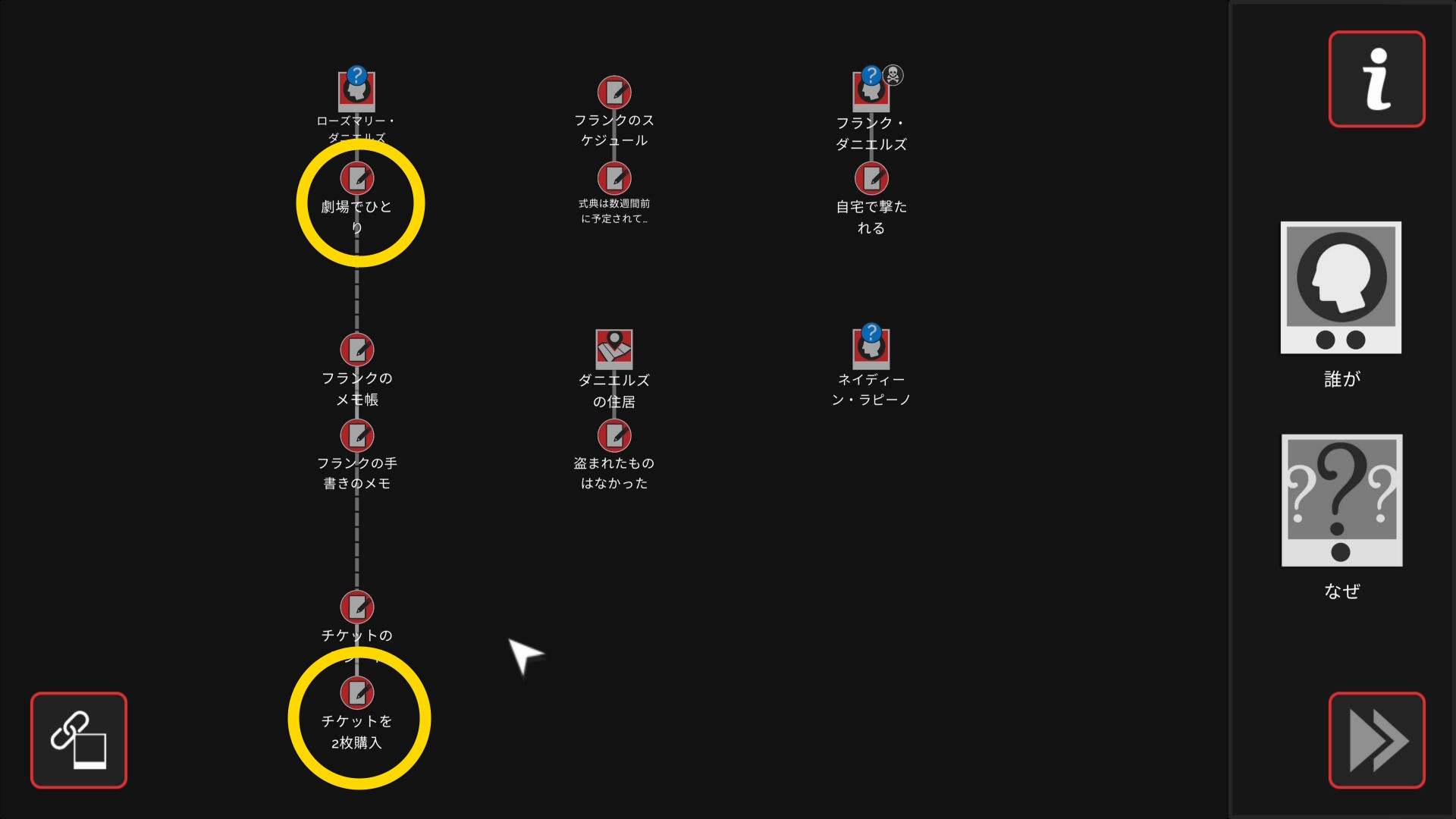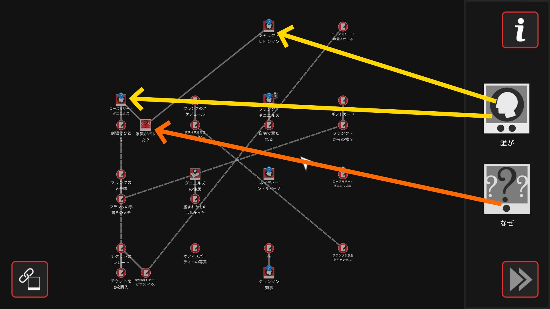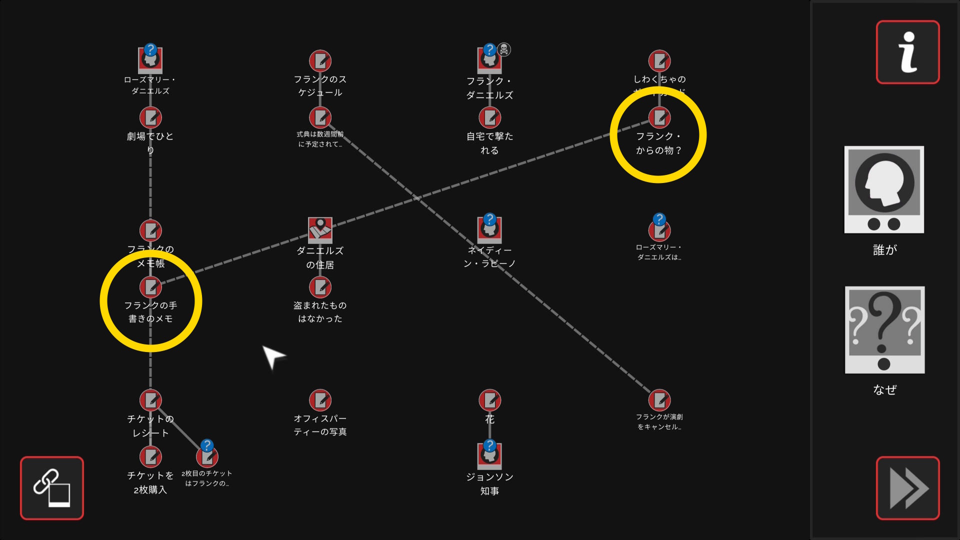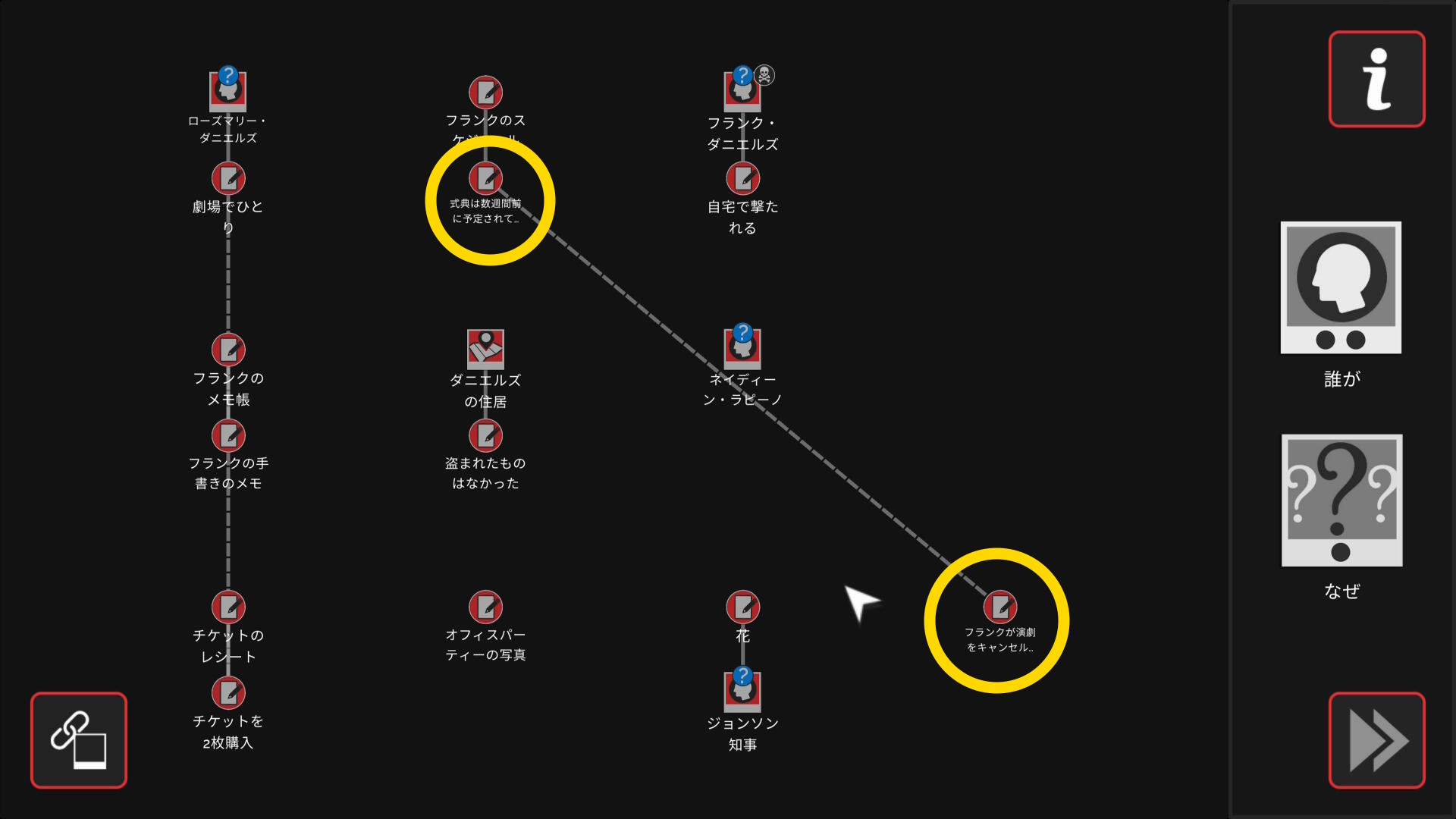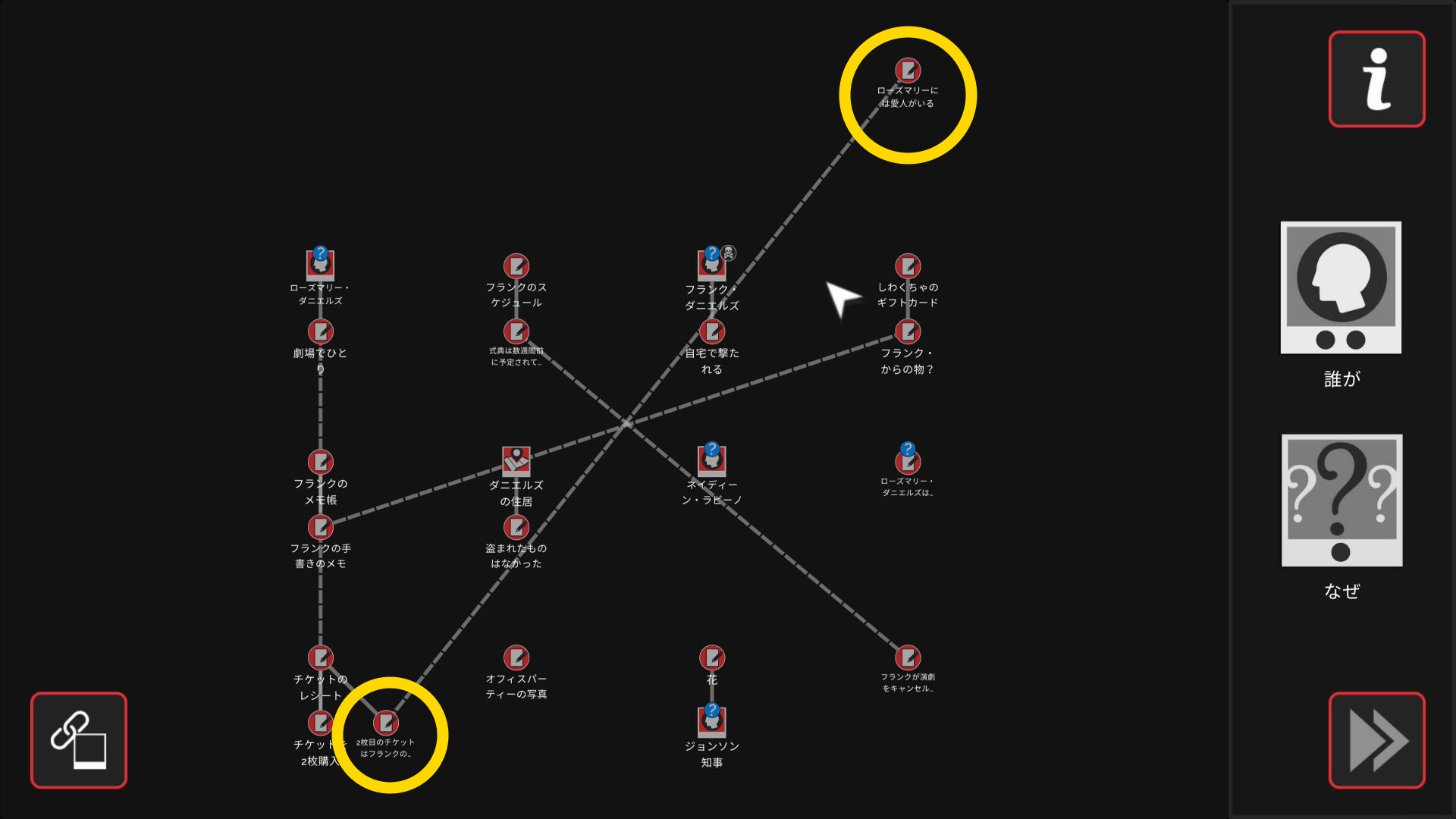 - 会話後、ワークスペースに遷移し、以下の証拠を結ぶ(結論関連付け:2/4)