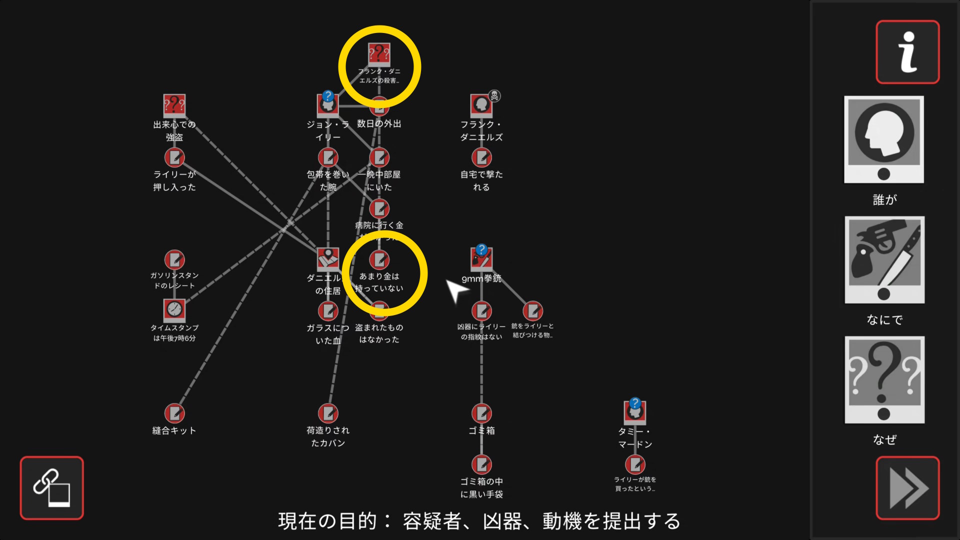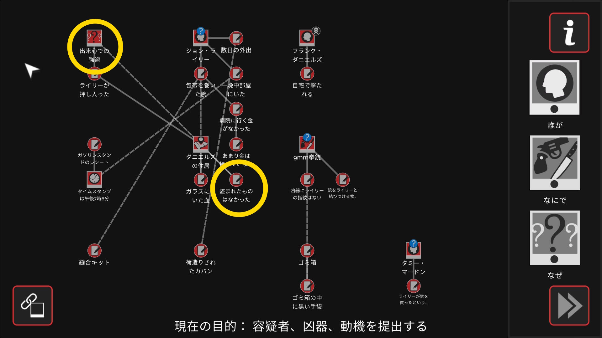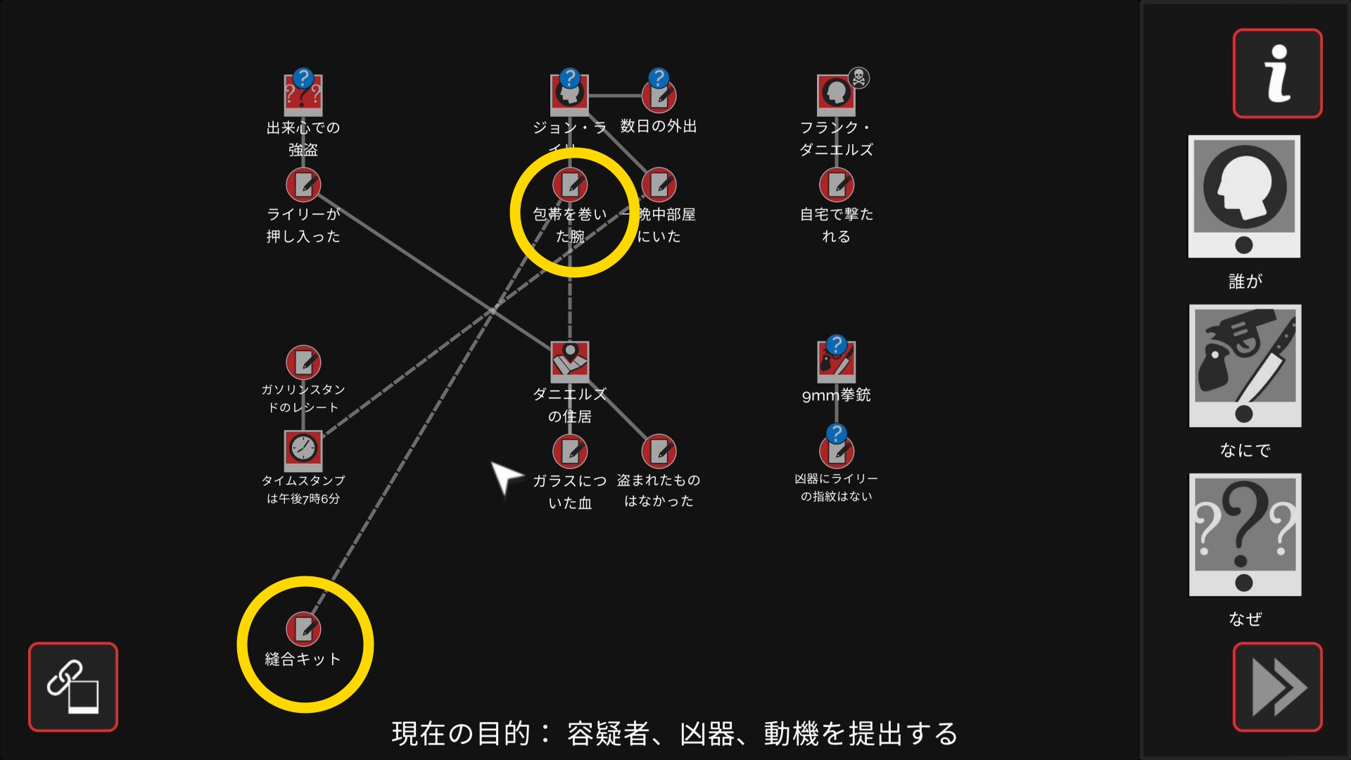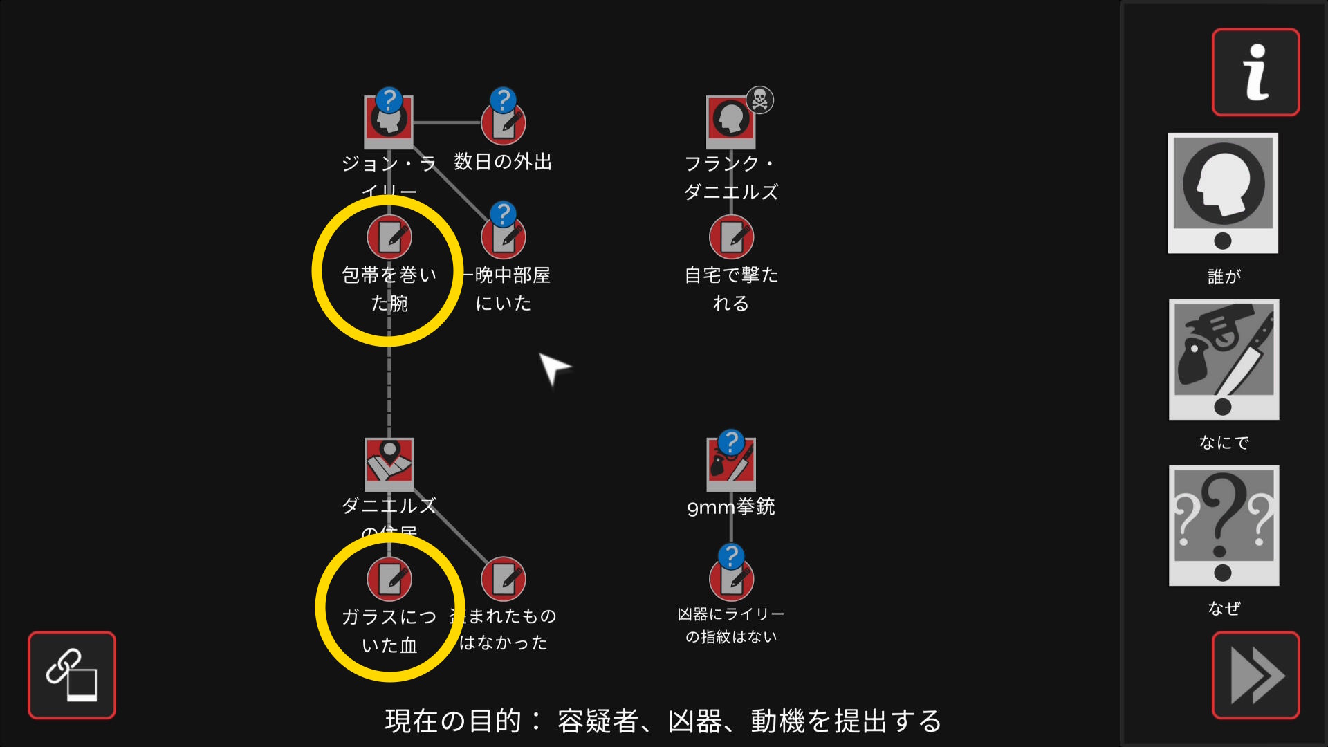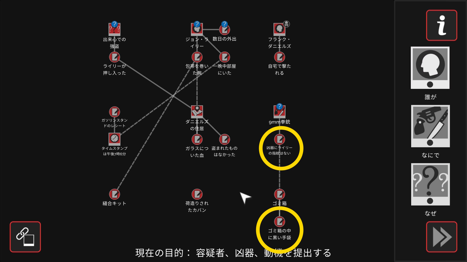 - 会話後、ワークスペースに遷移するので「誰が」「なにで」「なぜ」と証拠を結ぶ