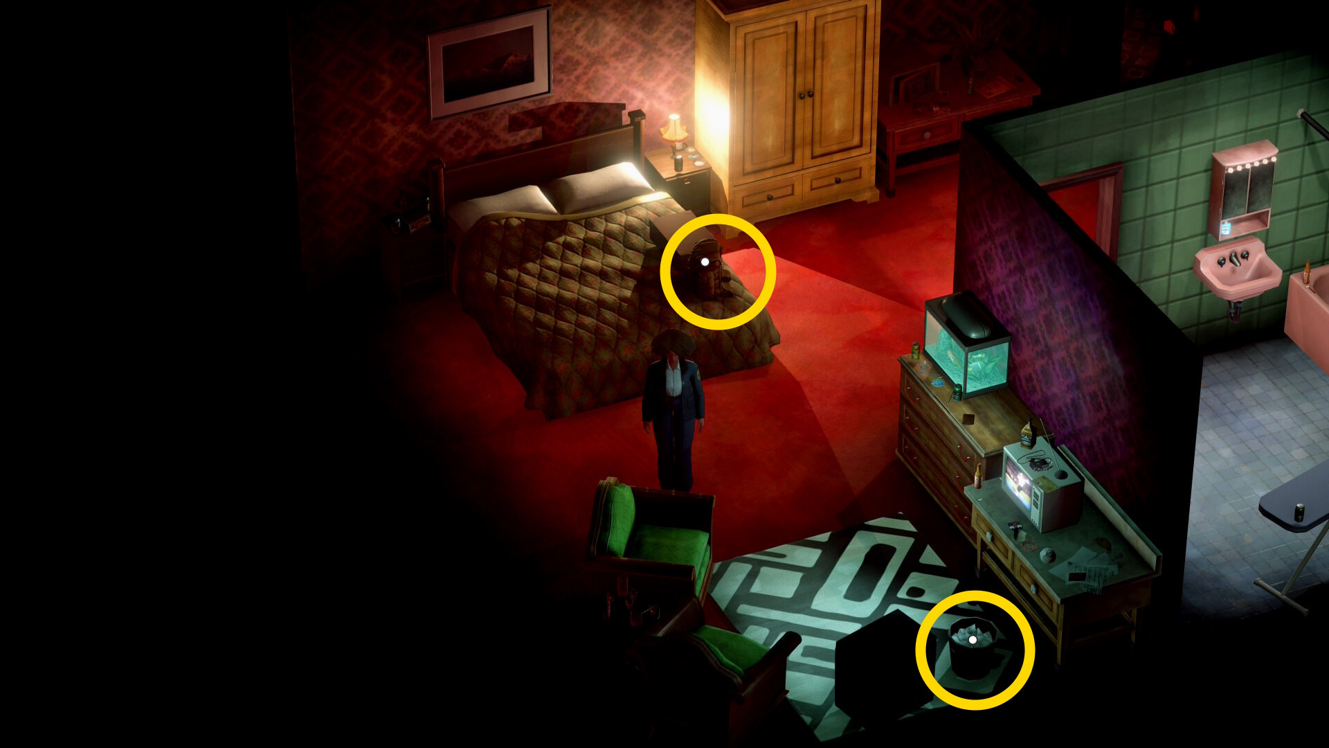 - ベッドの上の 荷造りされたカバン と 部屋の隅の ゴミ箱 を調べる