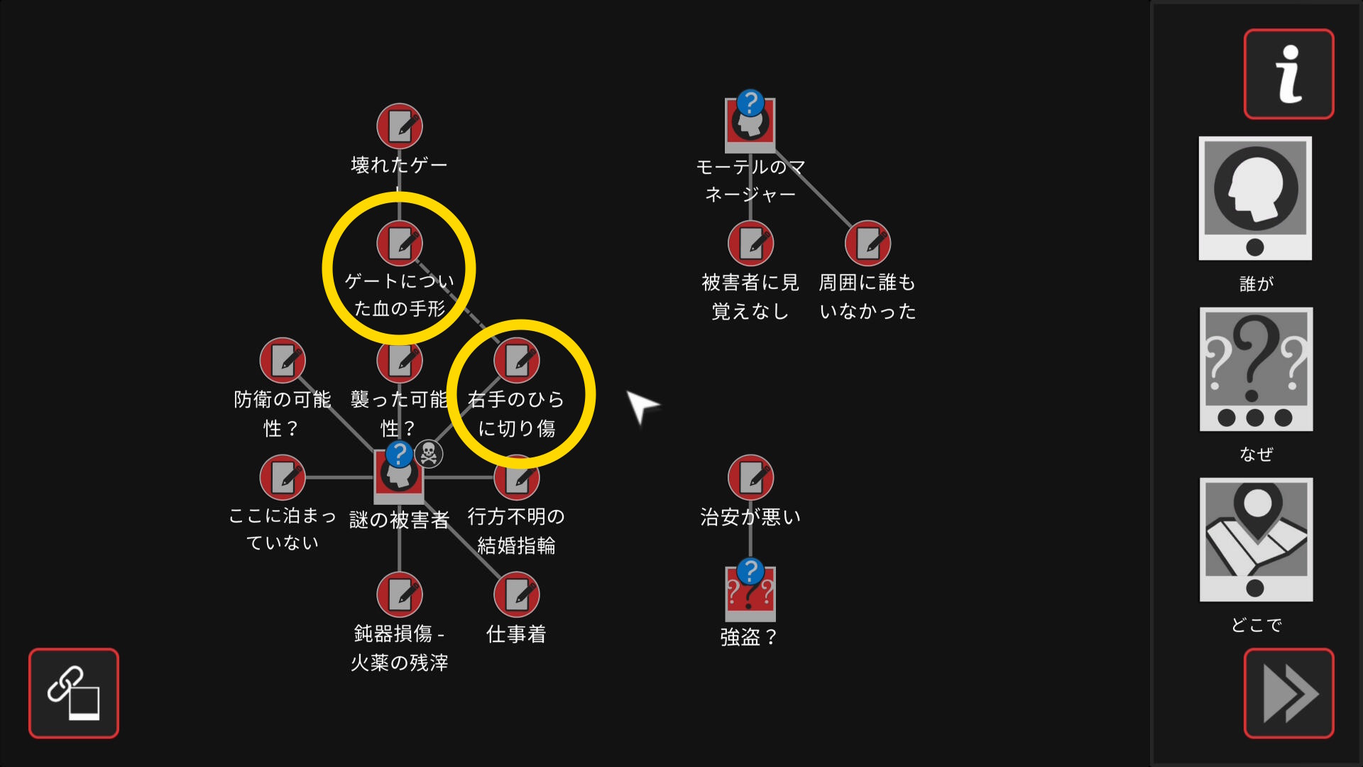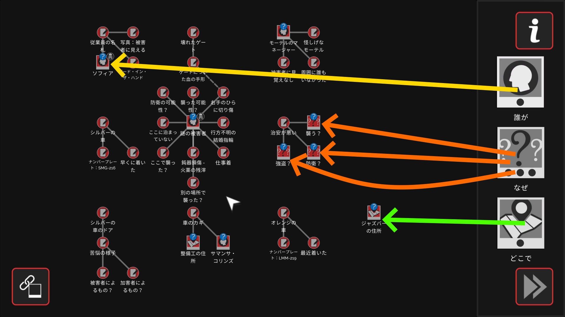 - 会話後、ワークスペースに遷移するので「誰が」「なぜ」「どこで」と証拠を結ぶ