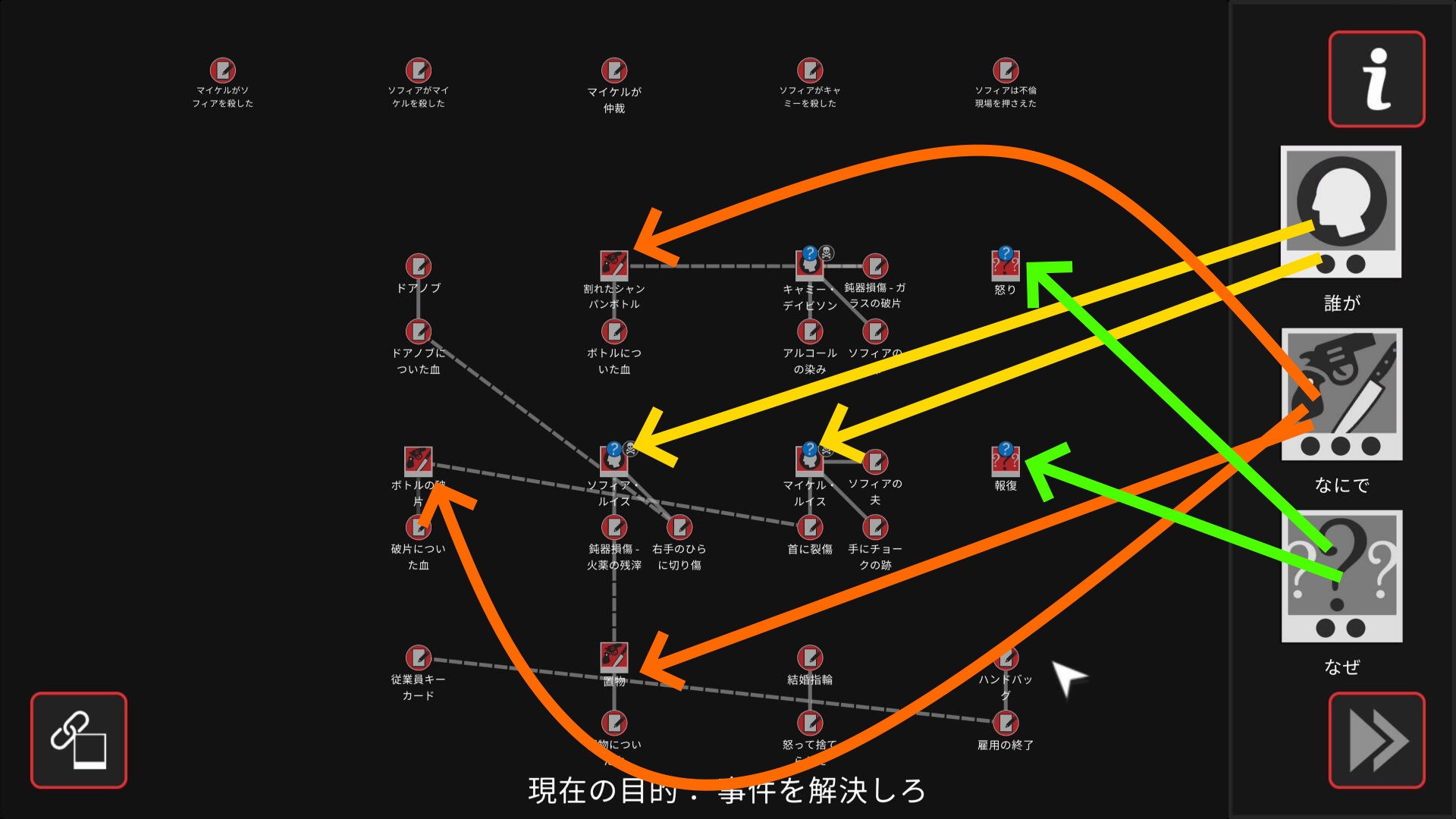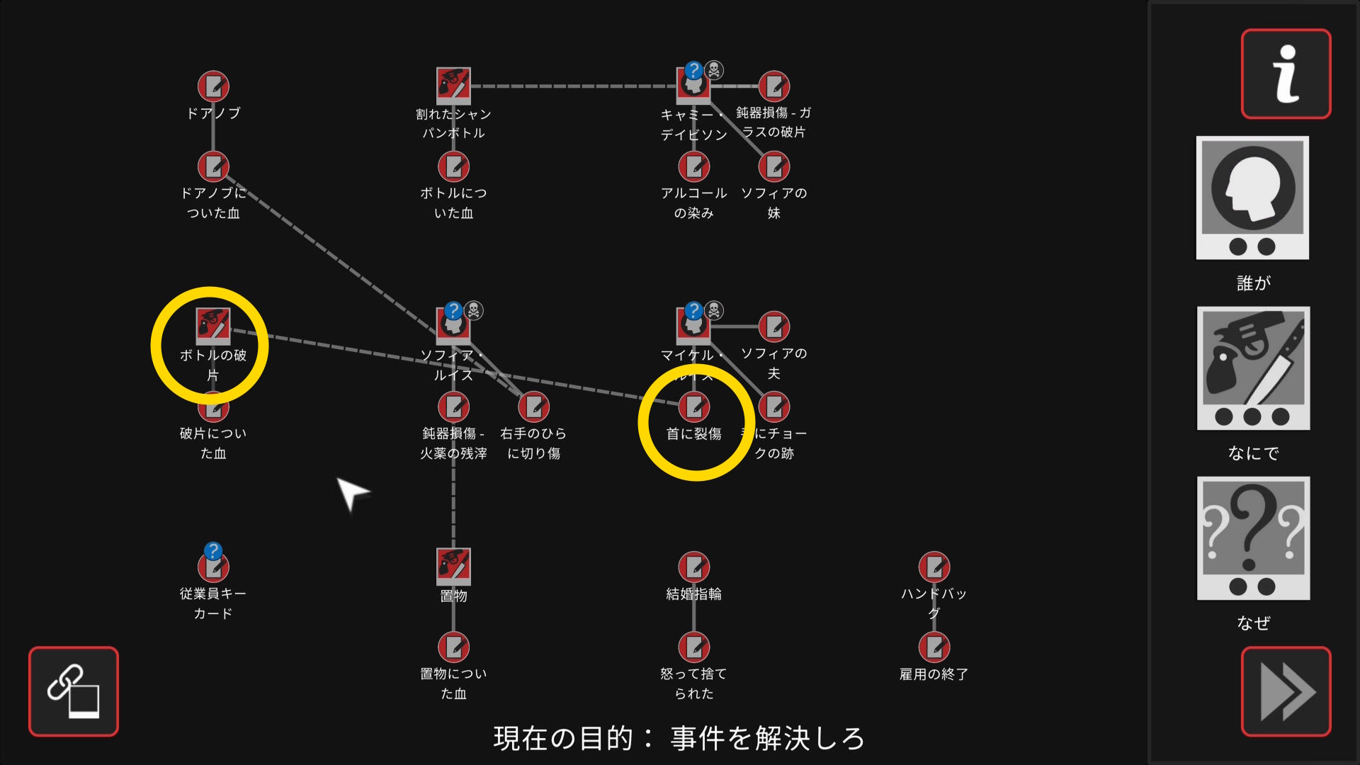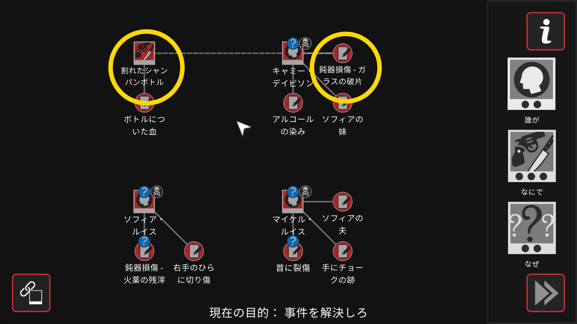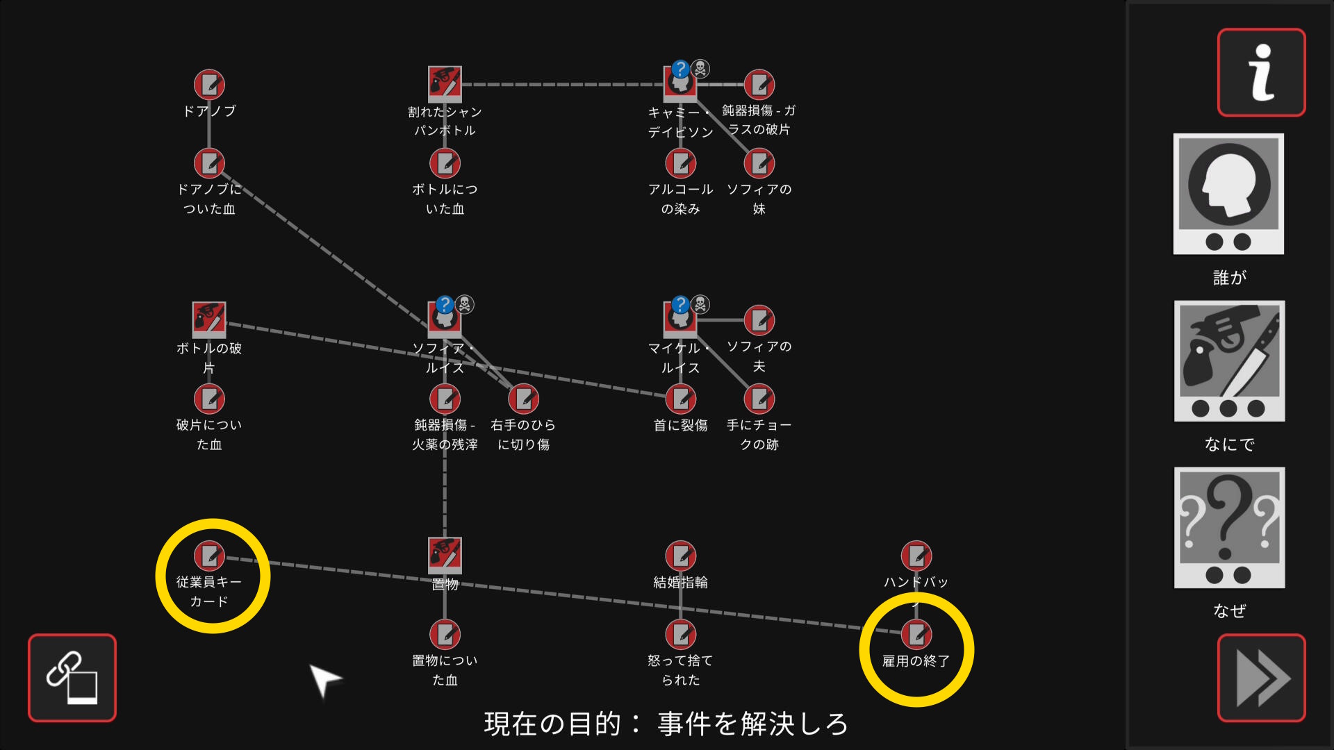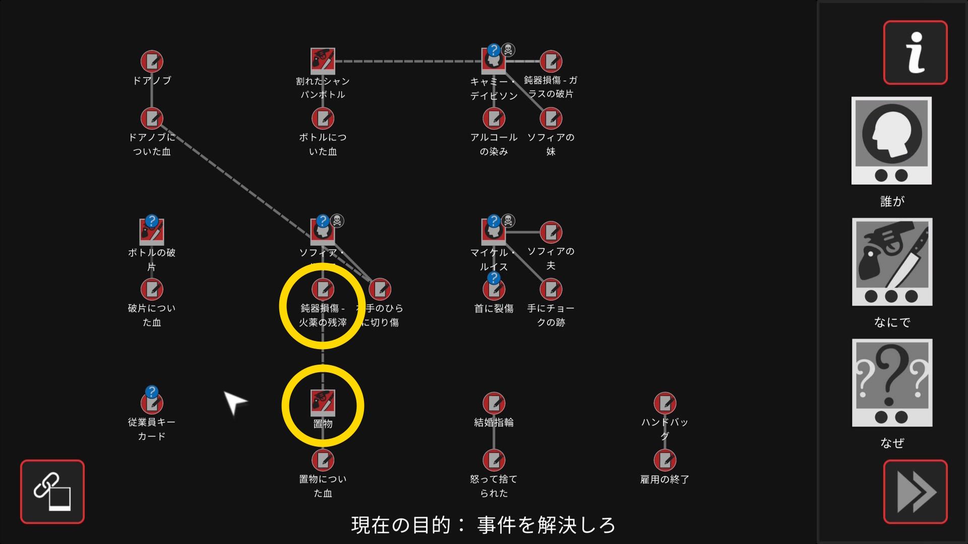 • 6個目のアイテムを調べ終わり、ワークスペースに遷移したら、以下の証拠を結ぶ(結論関連付け:2~5/5)