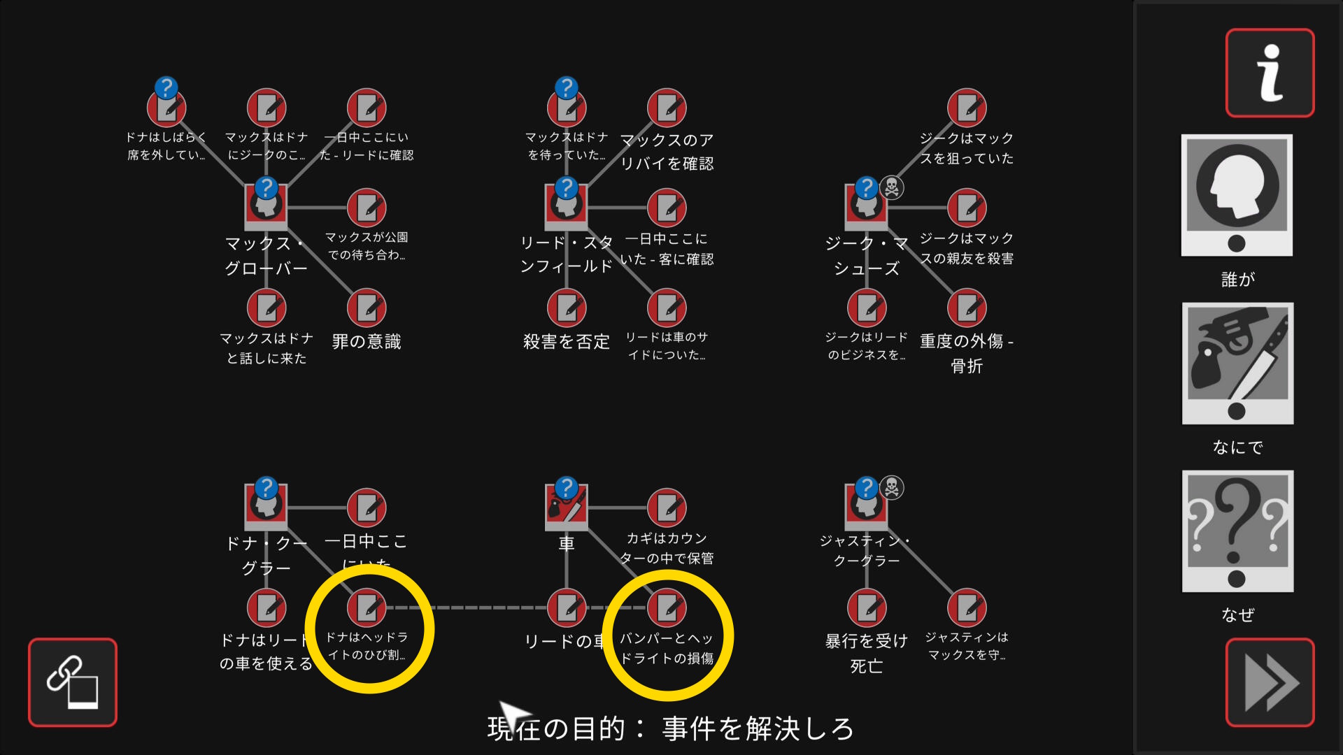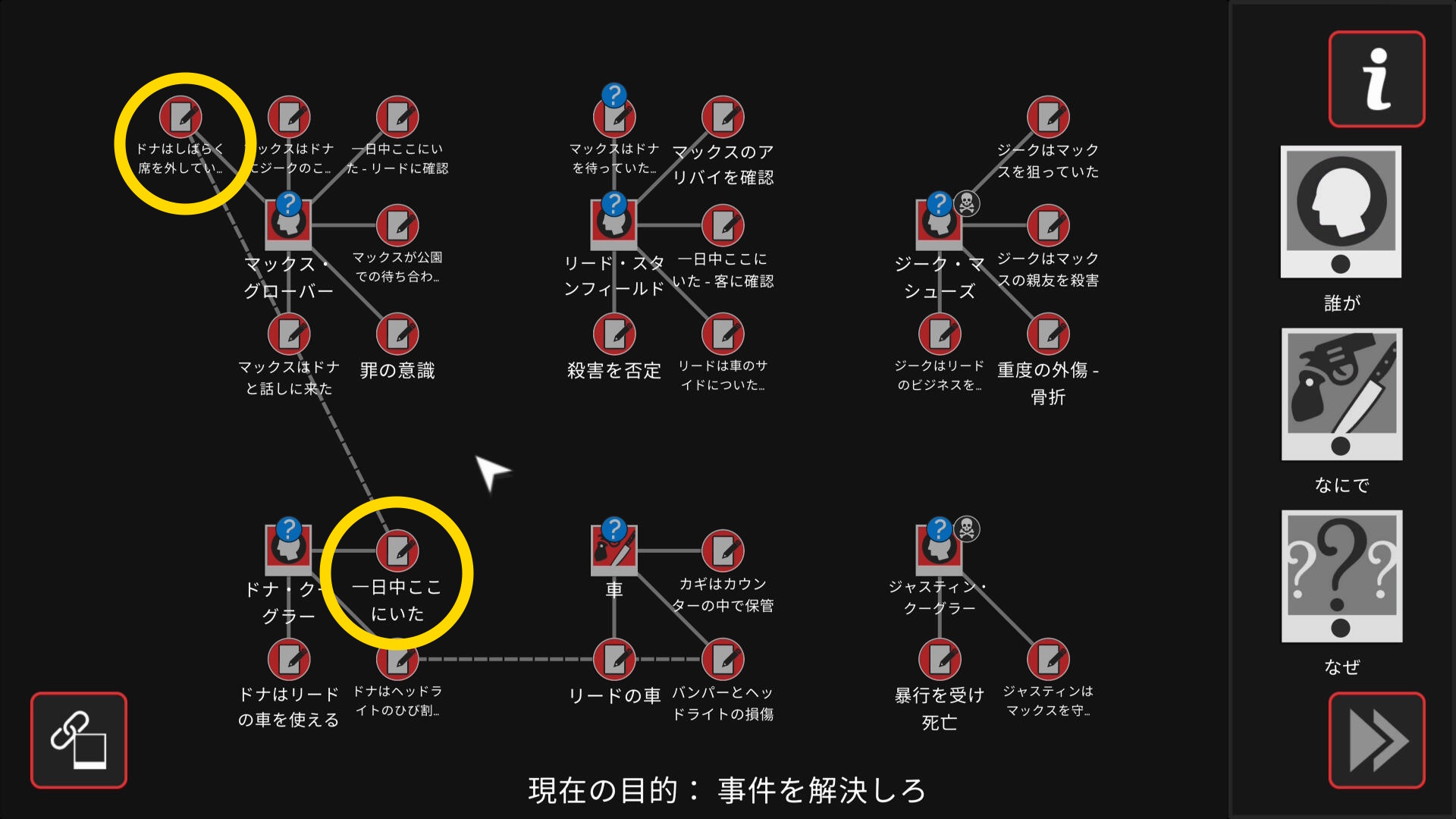 - ドナと会話後、ワークスペースに遷移するので、以下の証拠を結ぶ(結論関連付け:1~3/3)