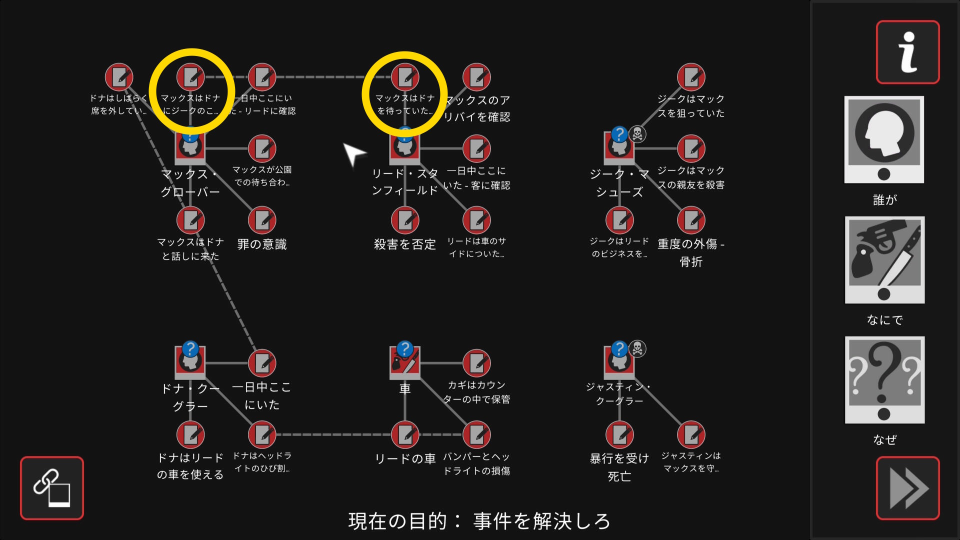 - 会話後、ワークスペースに遷移するので「誰が」「なにで」「なぜ」と証拠を結ぶ