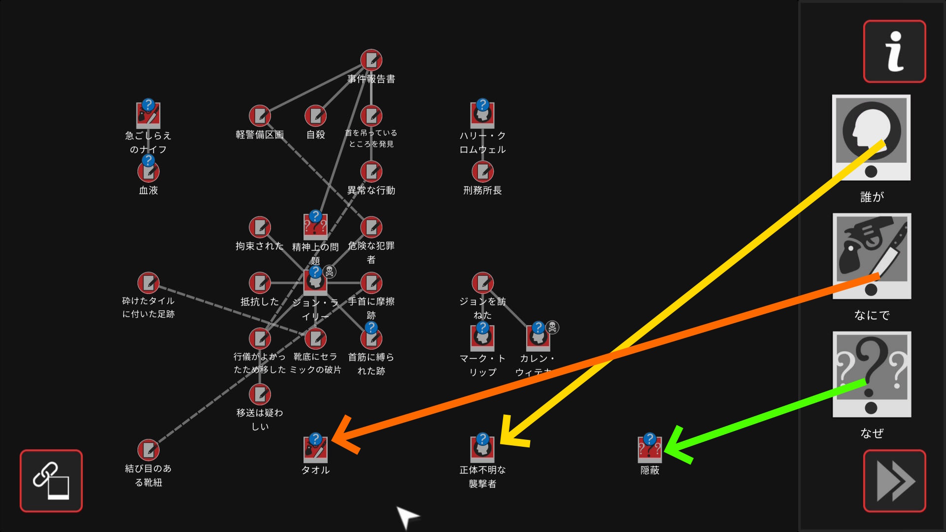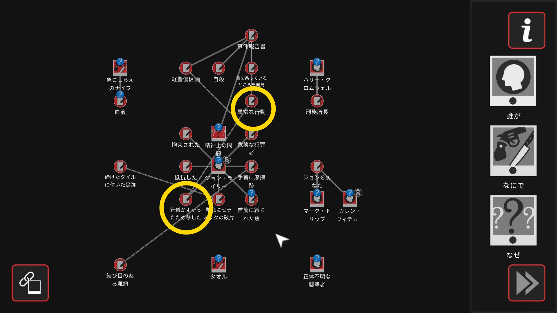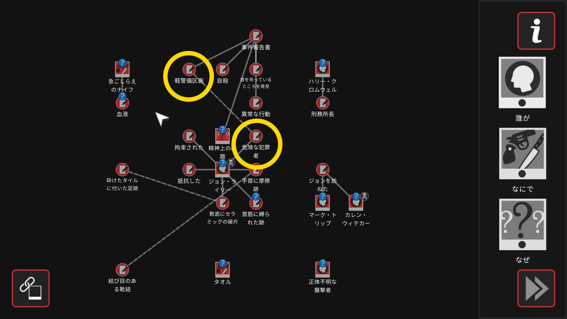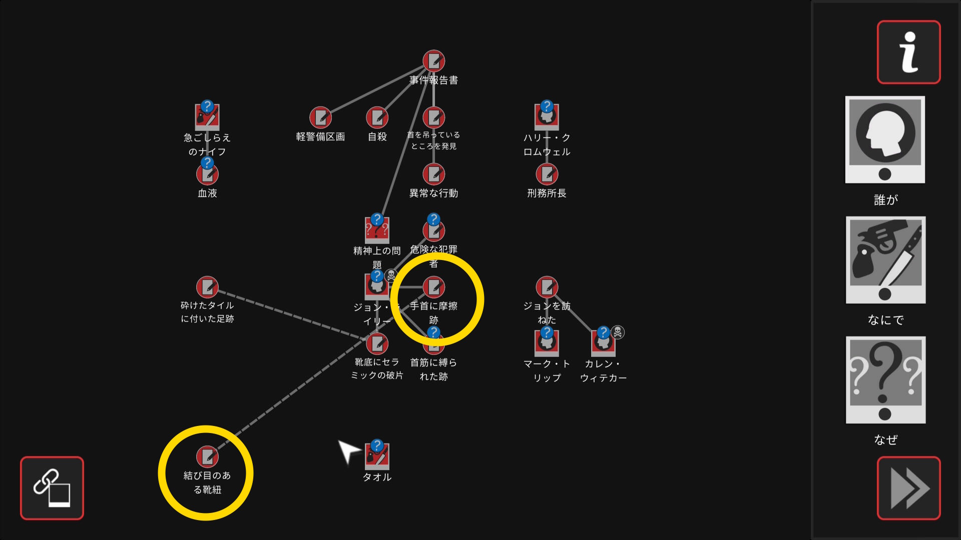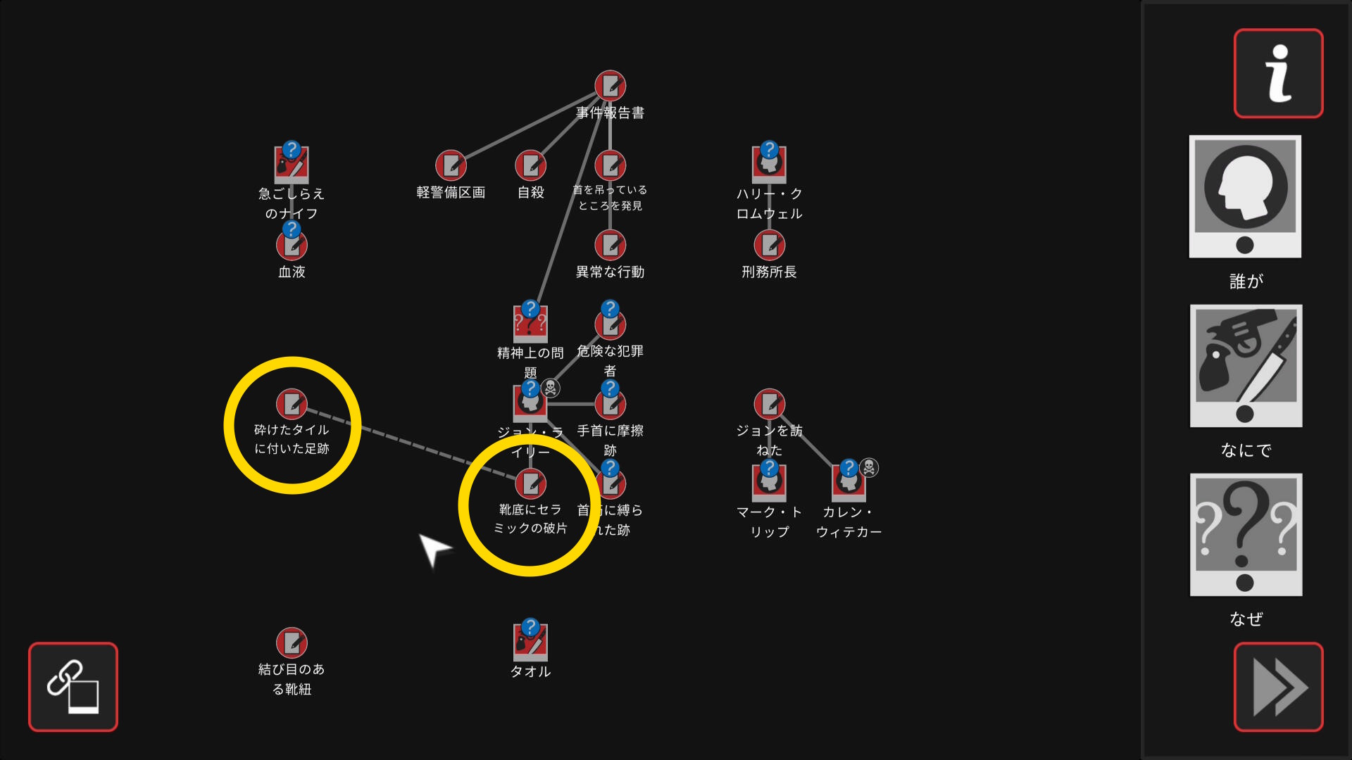 - 5個目のアイテムを調べたあと、ワークスペースに遷移するので、以下の証拠を結ぶ(結論関連付け:1,2/4)
