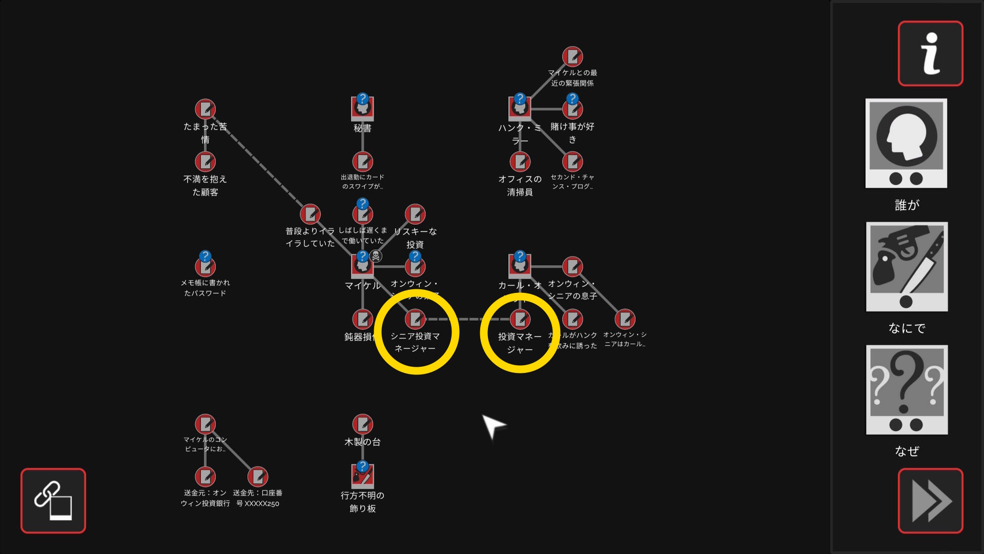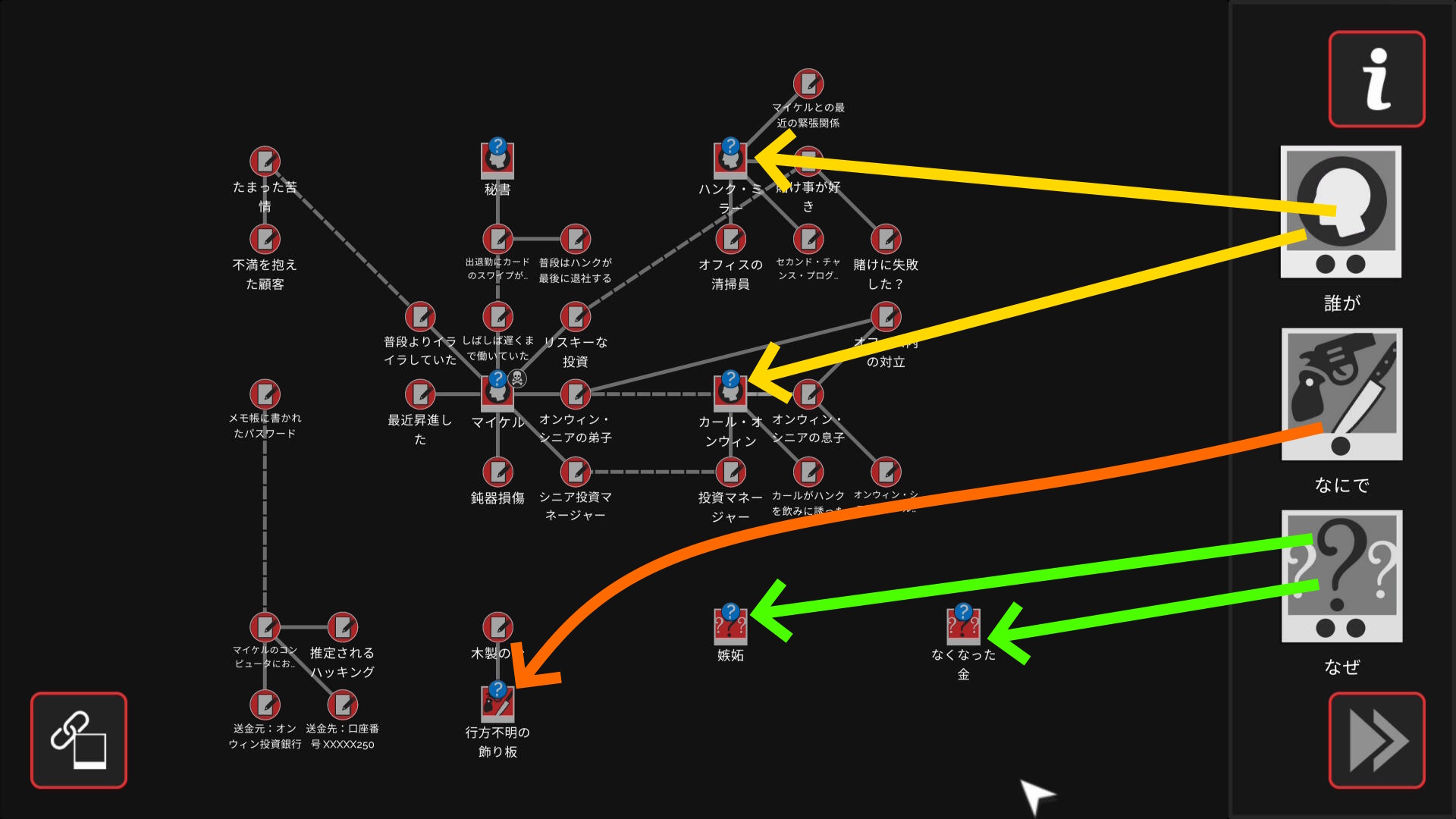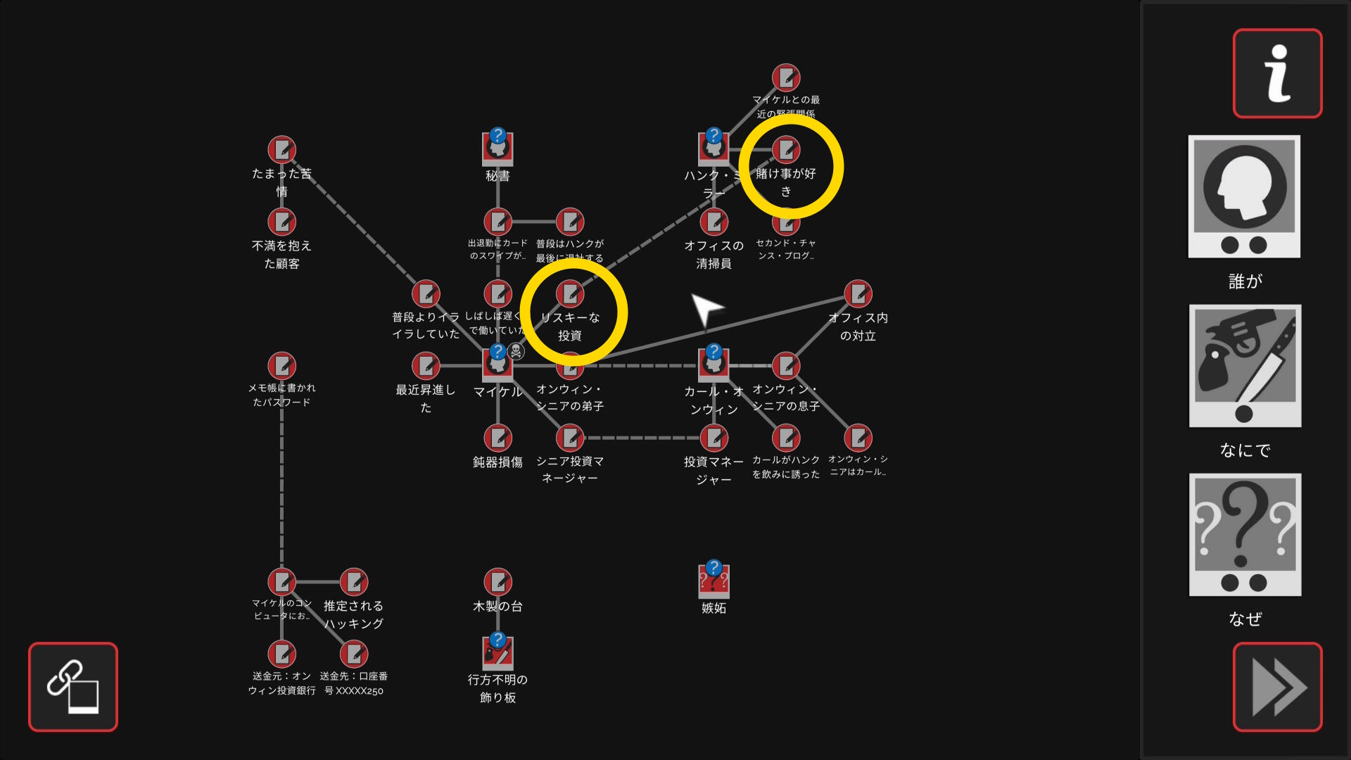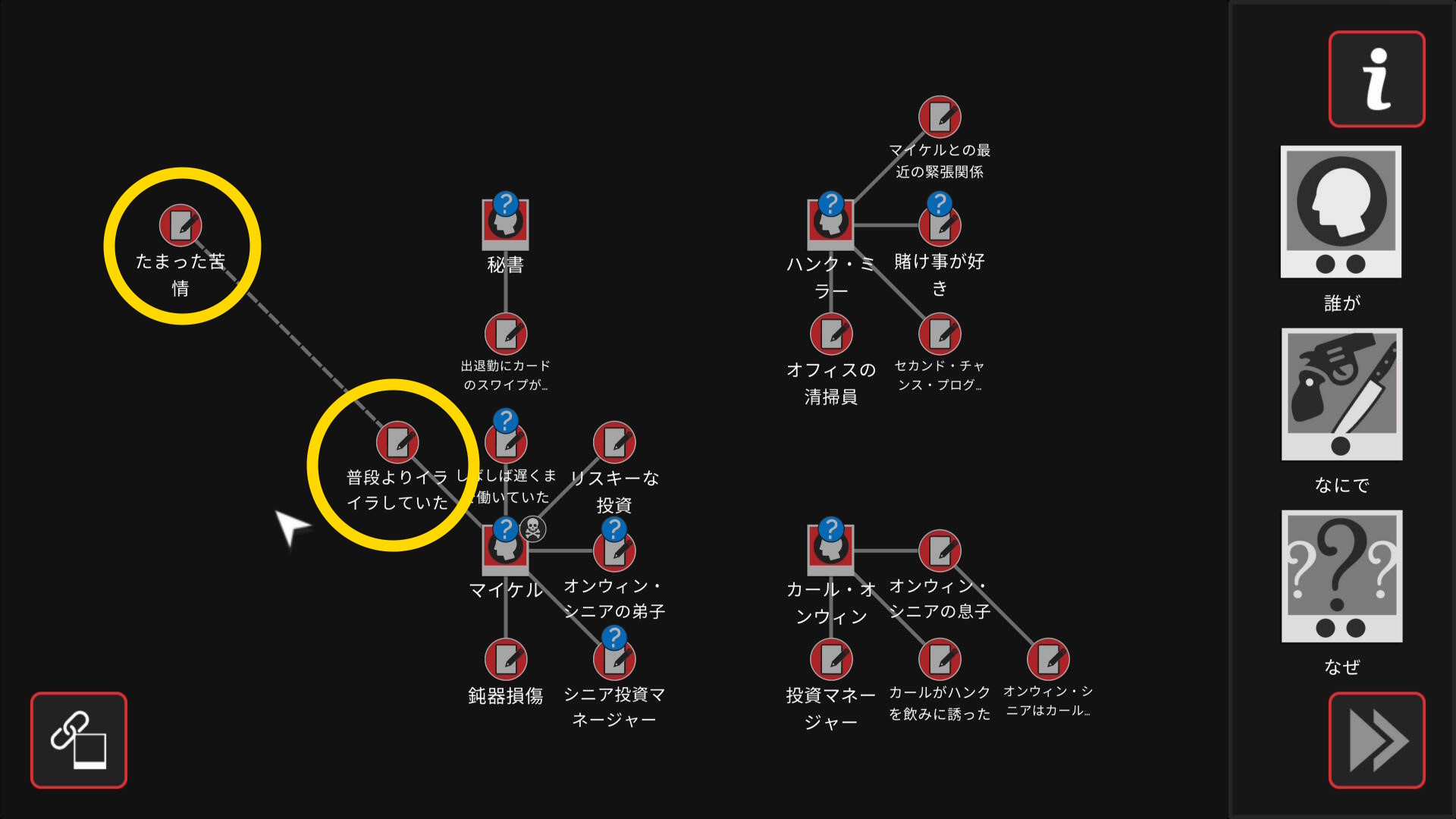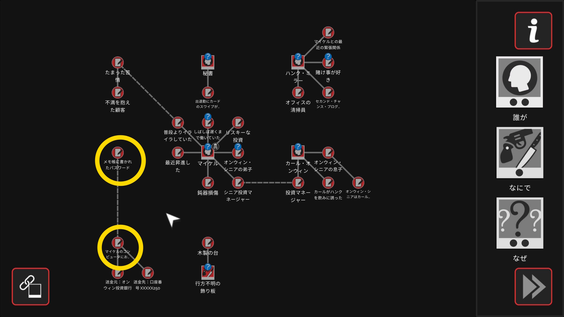 - 会話後、ワークスペースに遷移するので「誰が」「なにで」「なぜ」と証拠を結ぶ