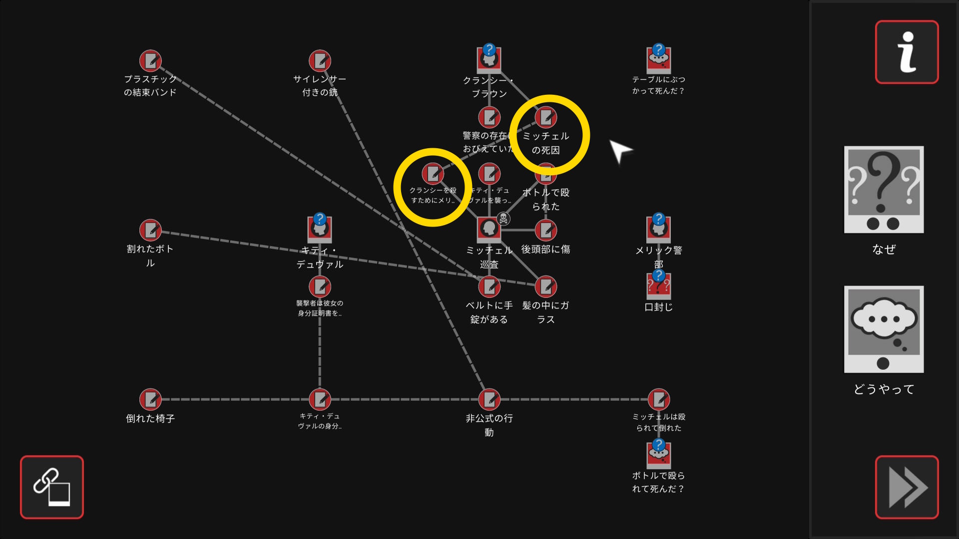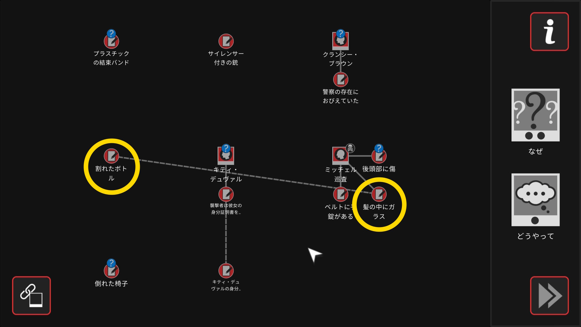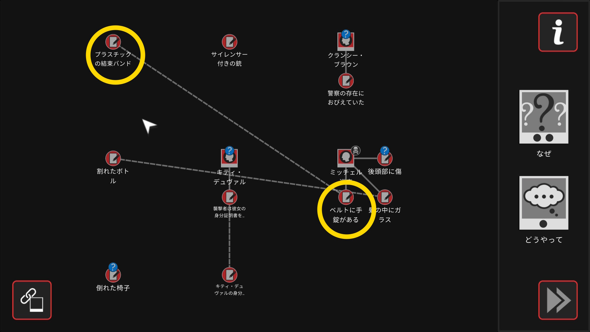 - 4個目のアイテムを調べたあと、ワークスペースに遷移し、以下の証拠を結ぶ(結論関連付け:1~3/7)