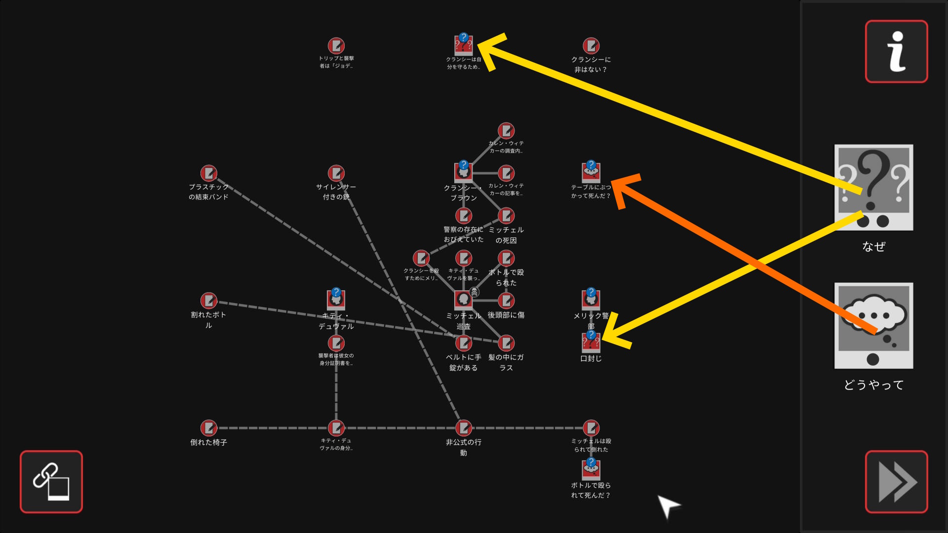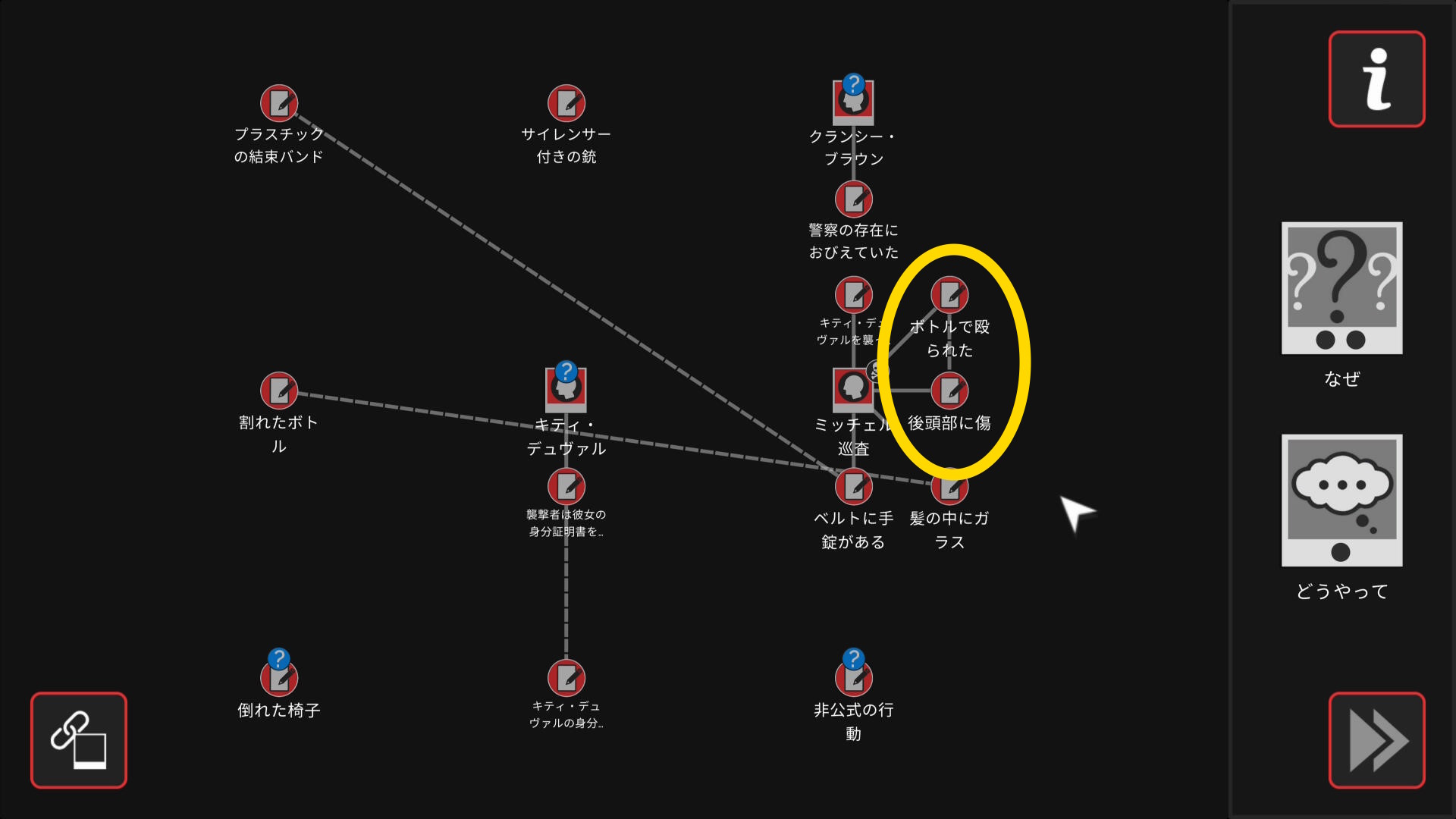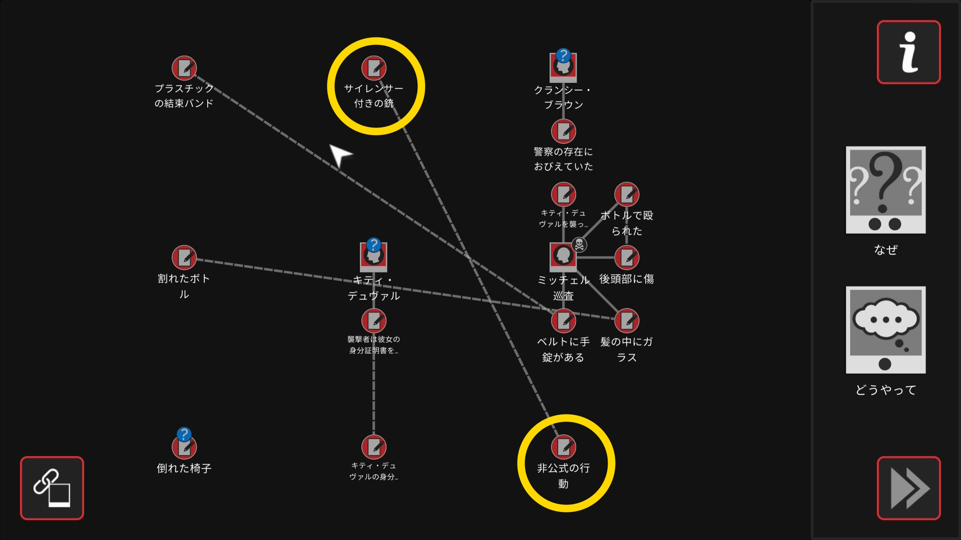 - 4個目のアイテムを調べたあと、ワークスペースに遷移し、以下の証拠を結ぶ(結論関連付け:1~3/7)