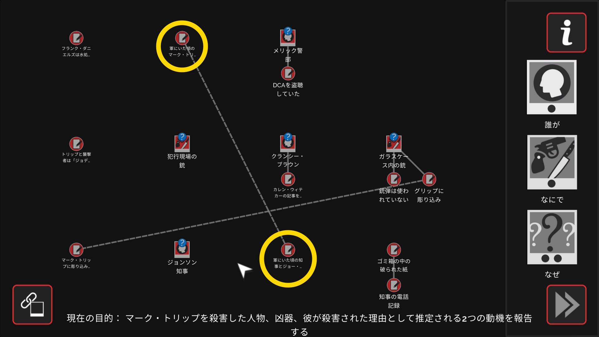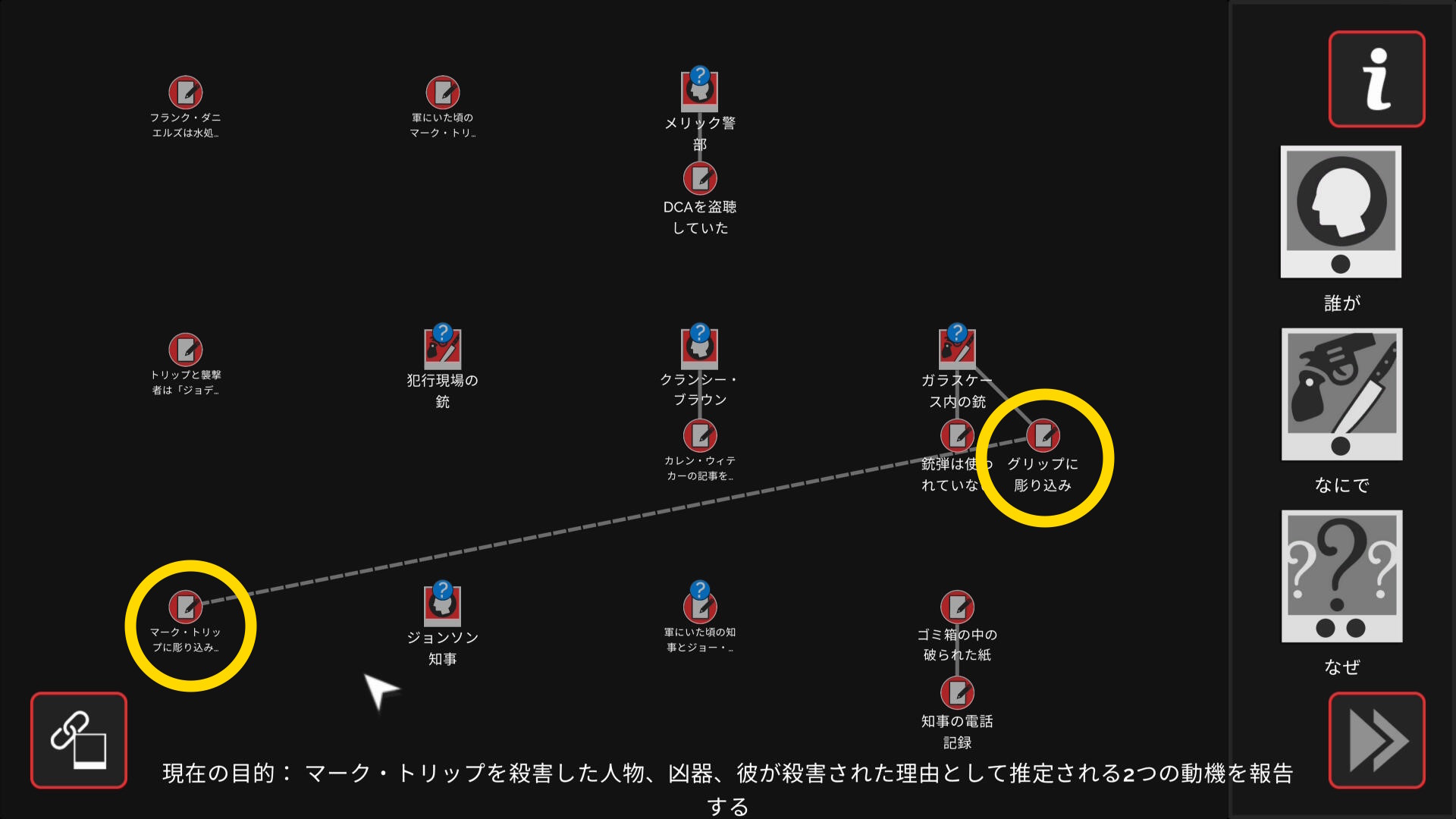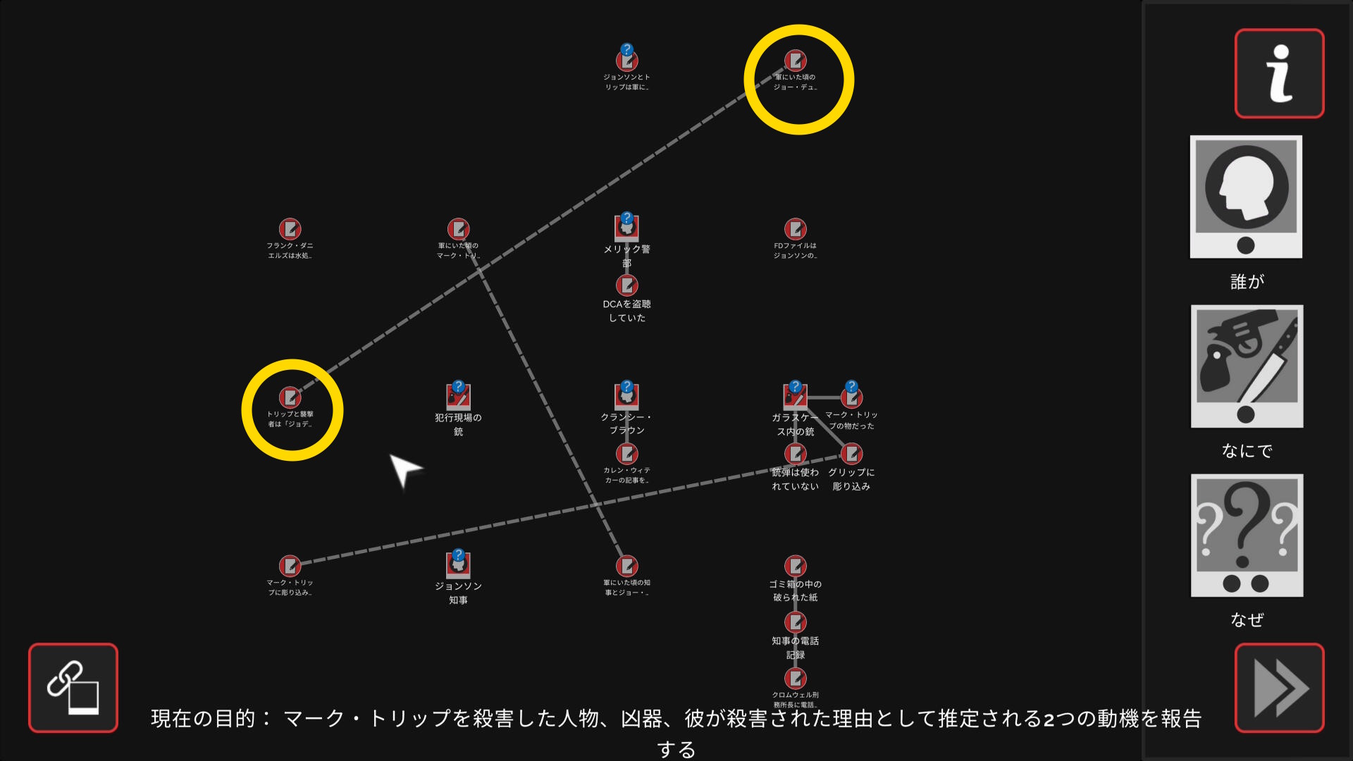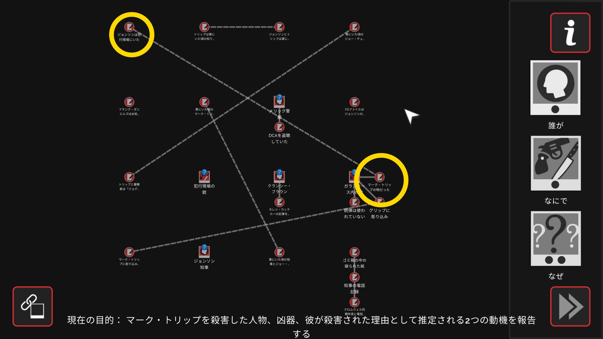 • 3個のアイテムを調べたあとワークスペースに遷移するので、以下の証拠を結ぶ(結論関連付け:1,2/9)