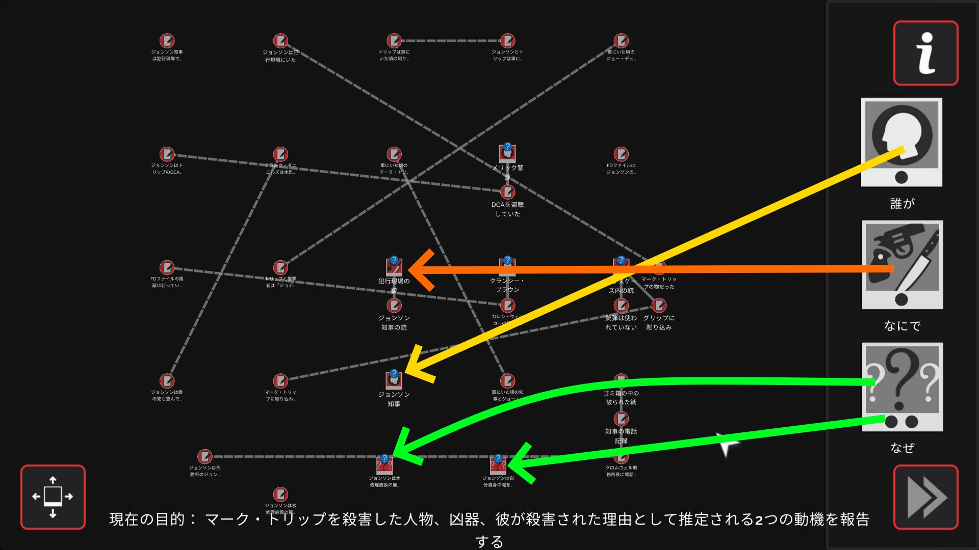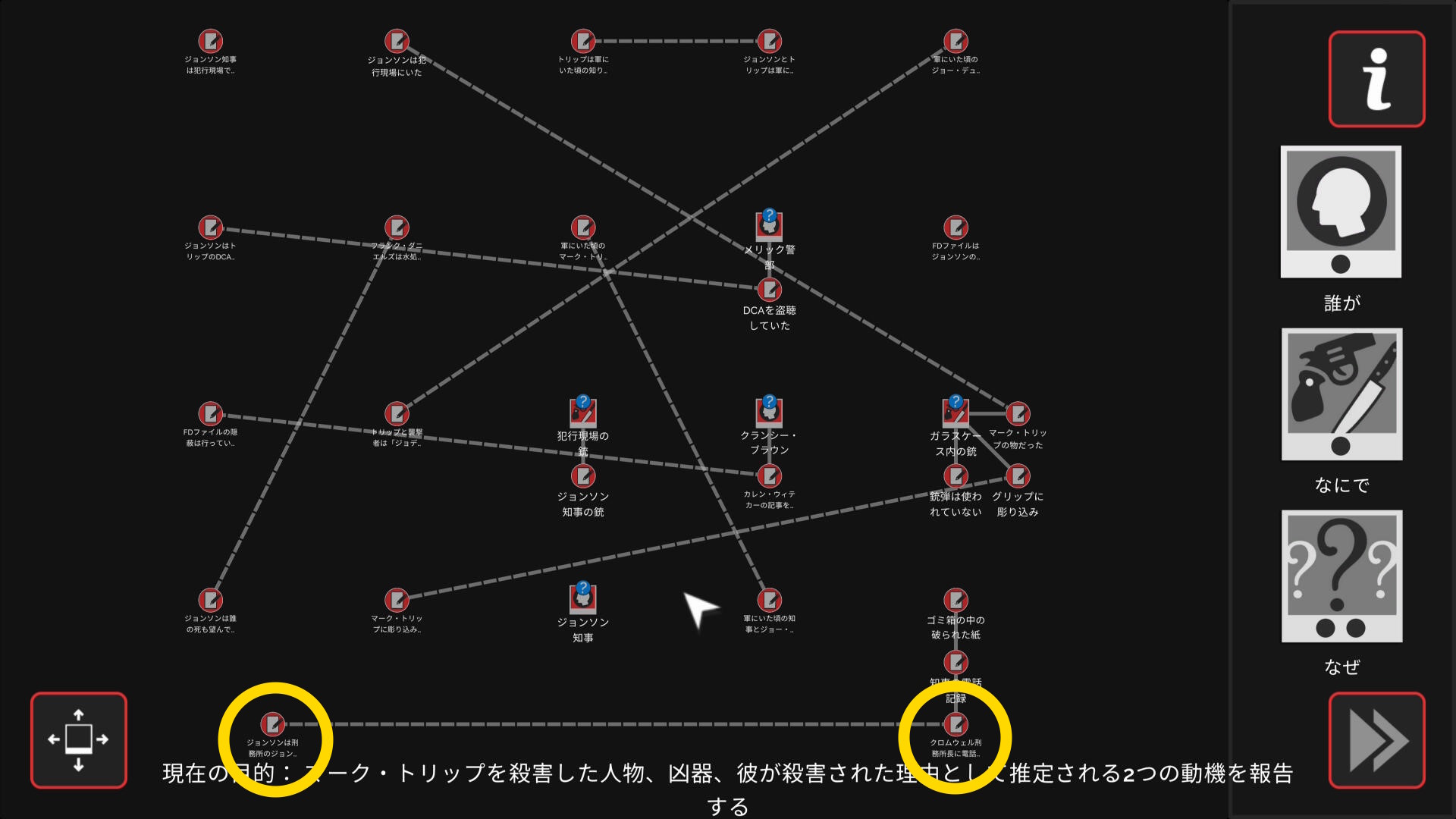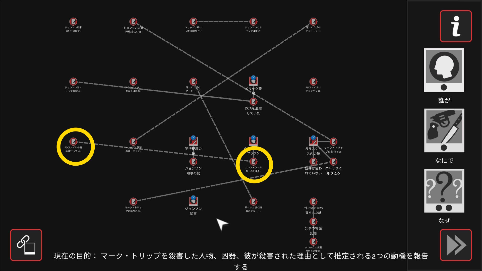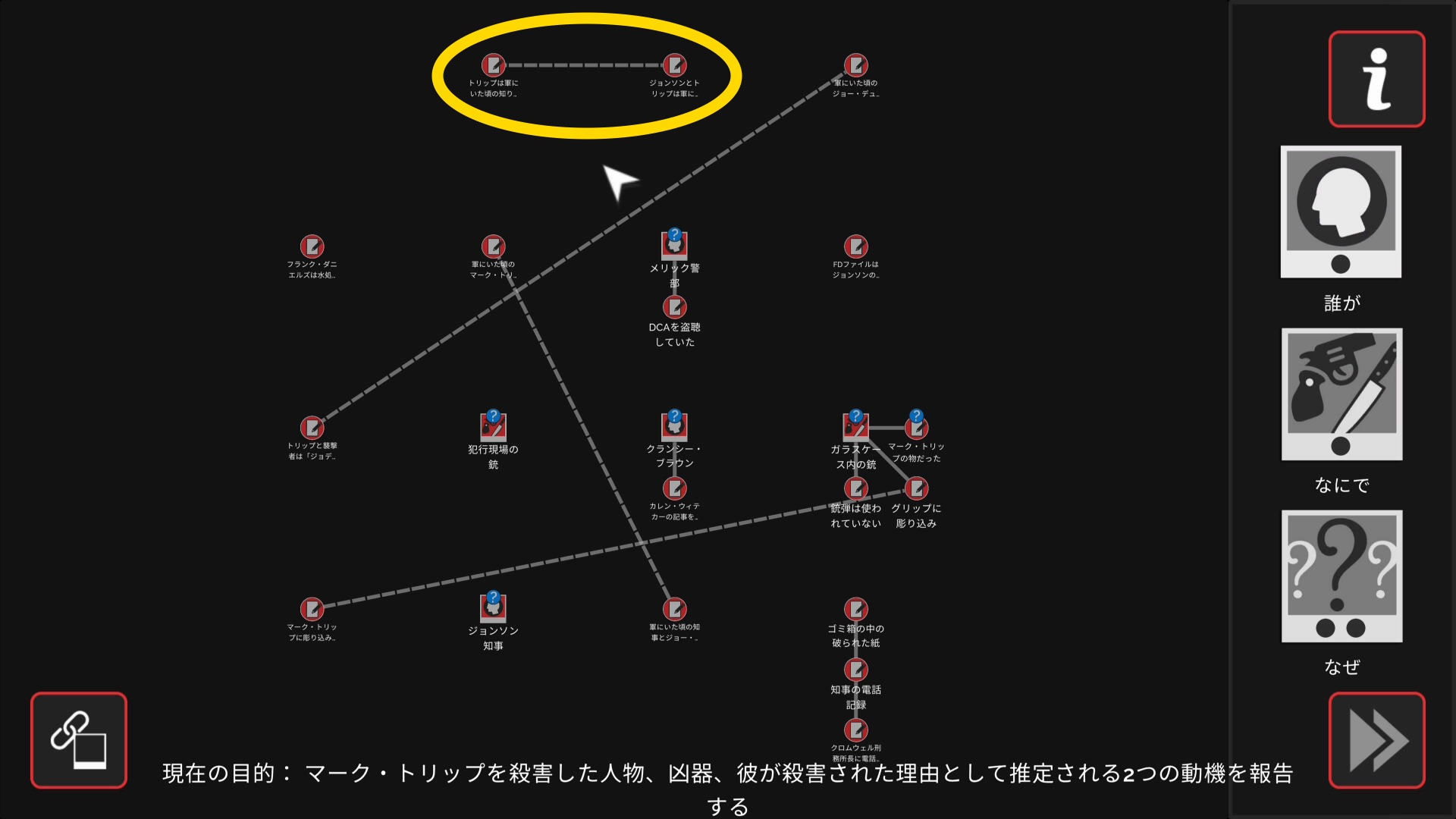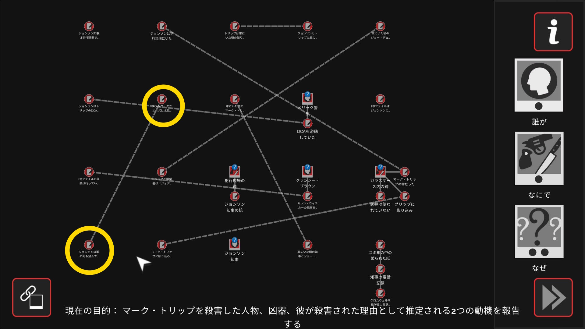 • 3個のアイテムを調べたあとワークスペースに遷移するので、以下の証拠を結ぶ(結論関連付け:1,2/9)