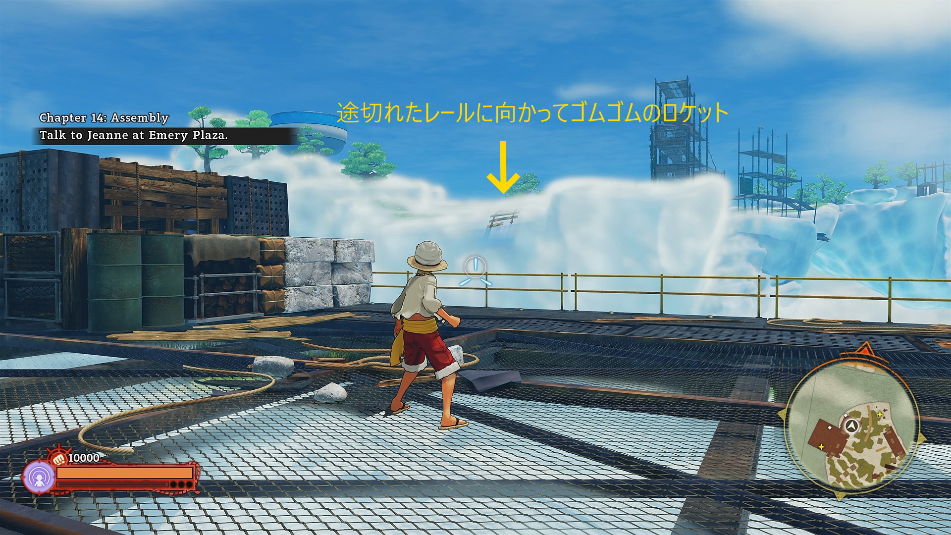 • スタート地点に戻るにはやや強引だが、下画像の位置から途切れたレールに向かってゴムゴムのロケット ⇒ ゴムゴムの UFO でなんとか上陸できる