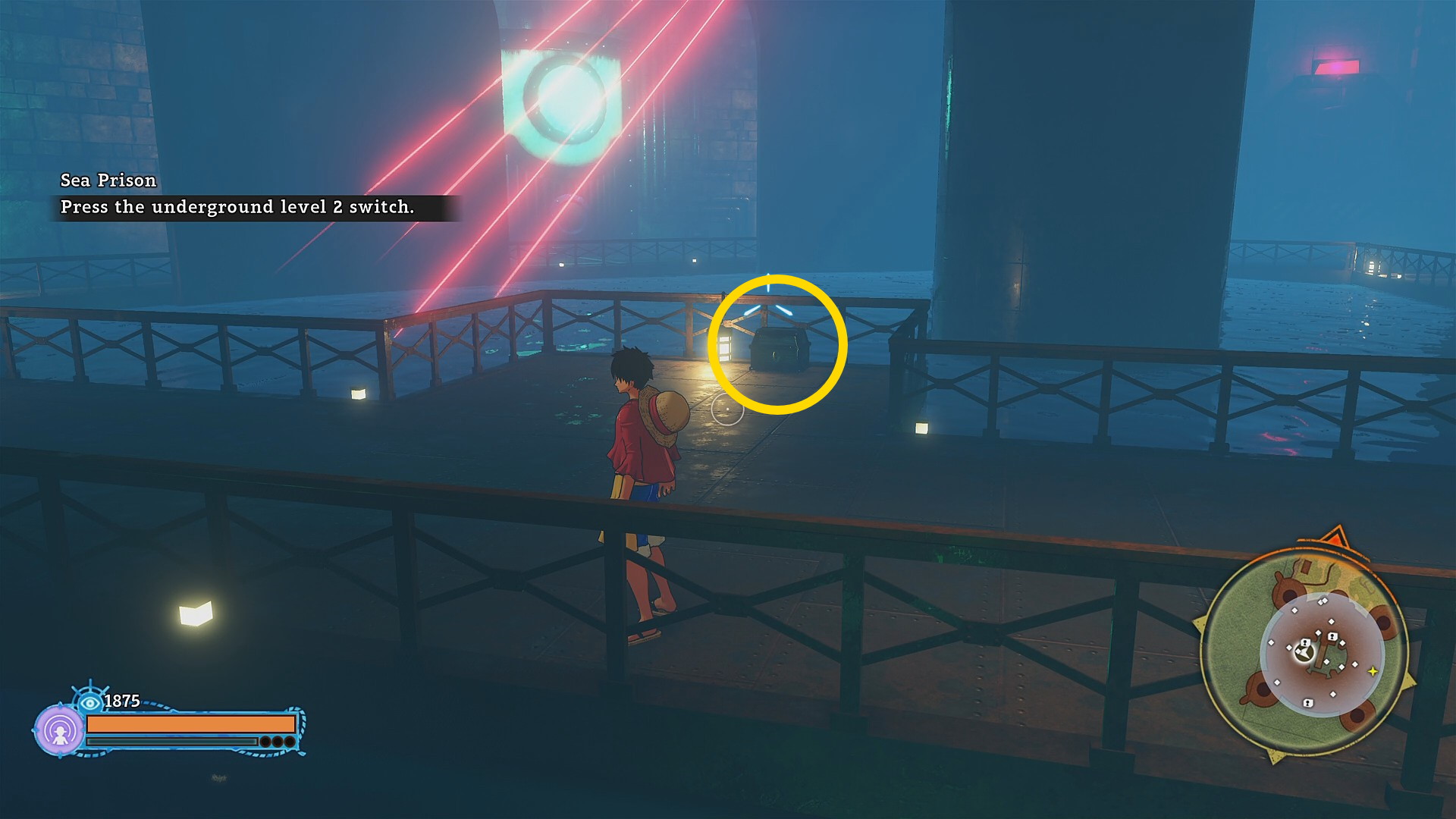 - すぐ目の前にスイッチがあり、またスイッチの左側 (レーザーセキュリティが監視しているところ)に 宝箱 ( Sea Prison – Aquamarine:4/7)