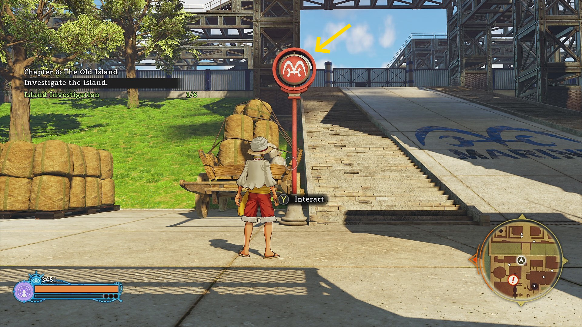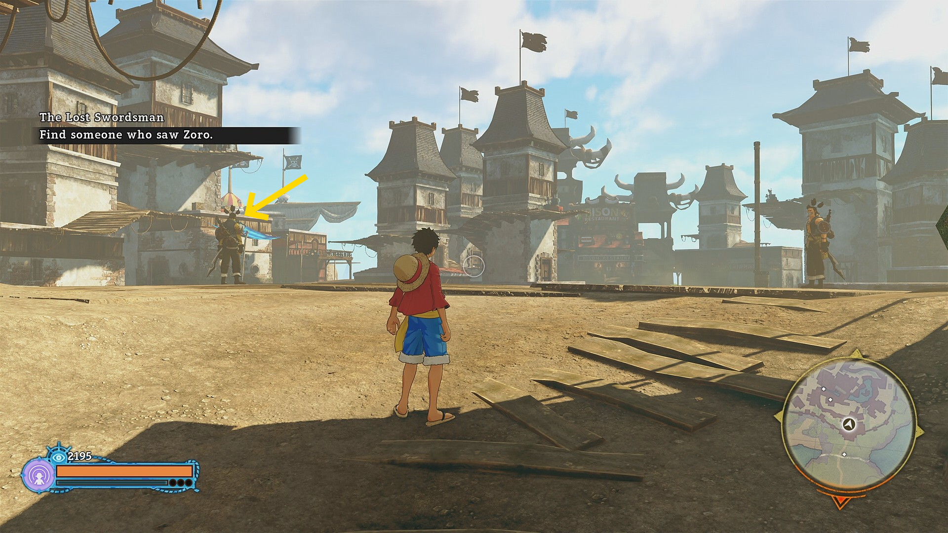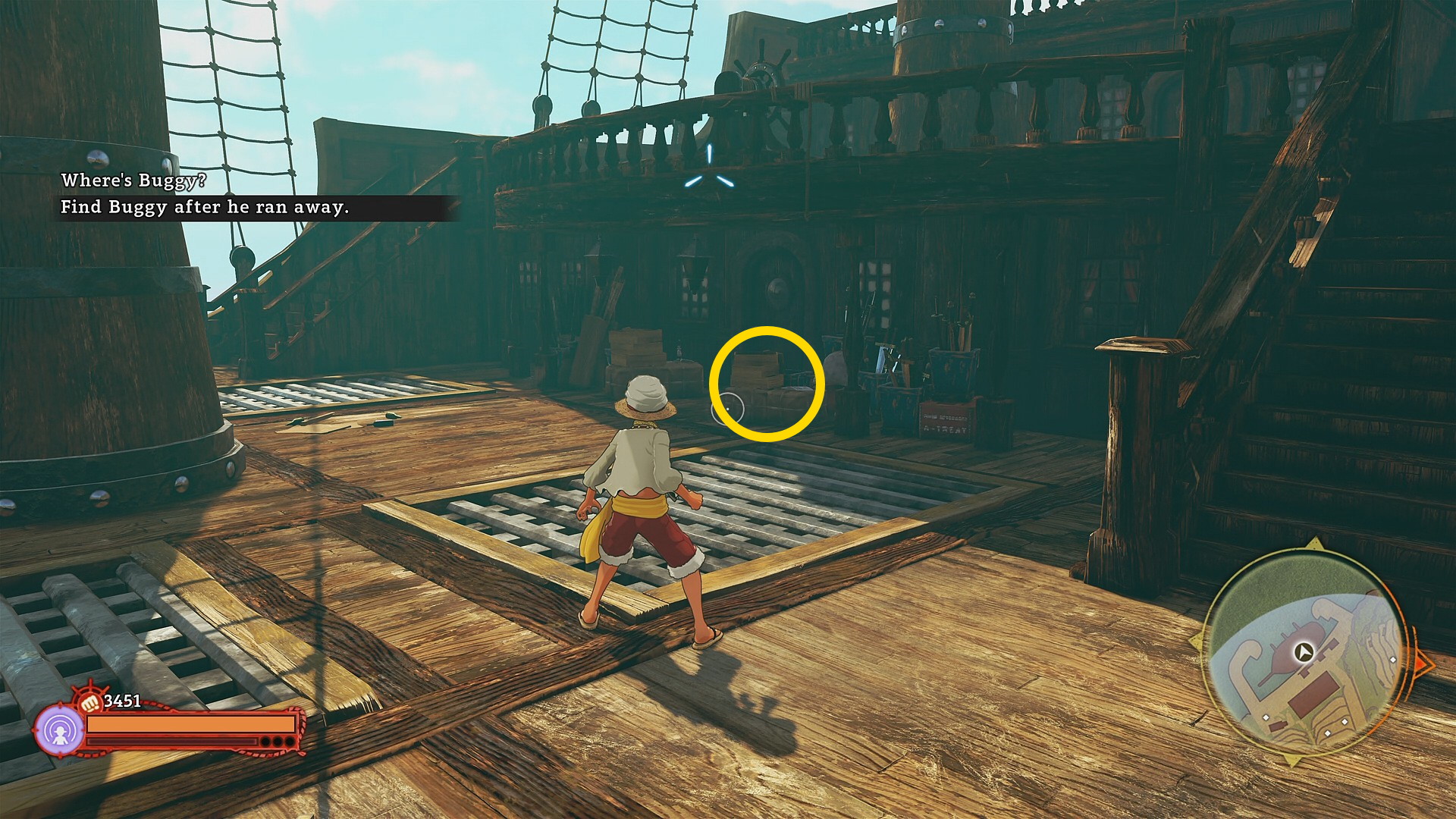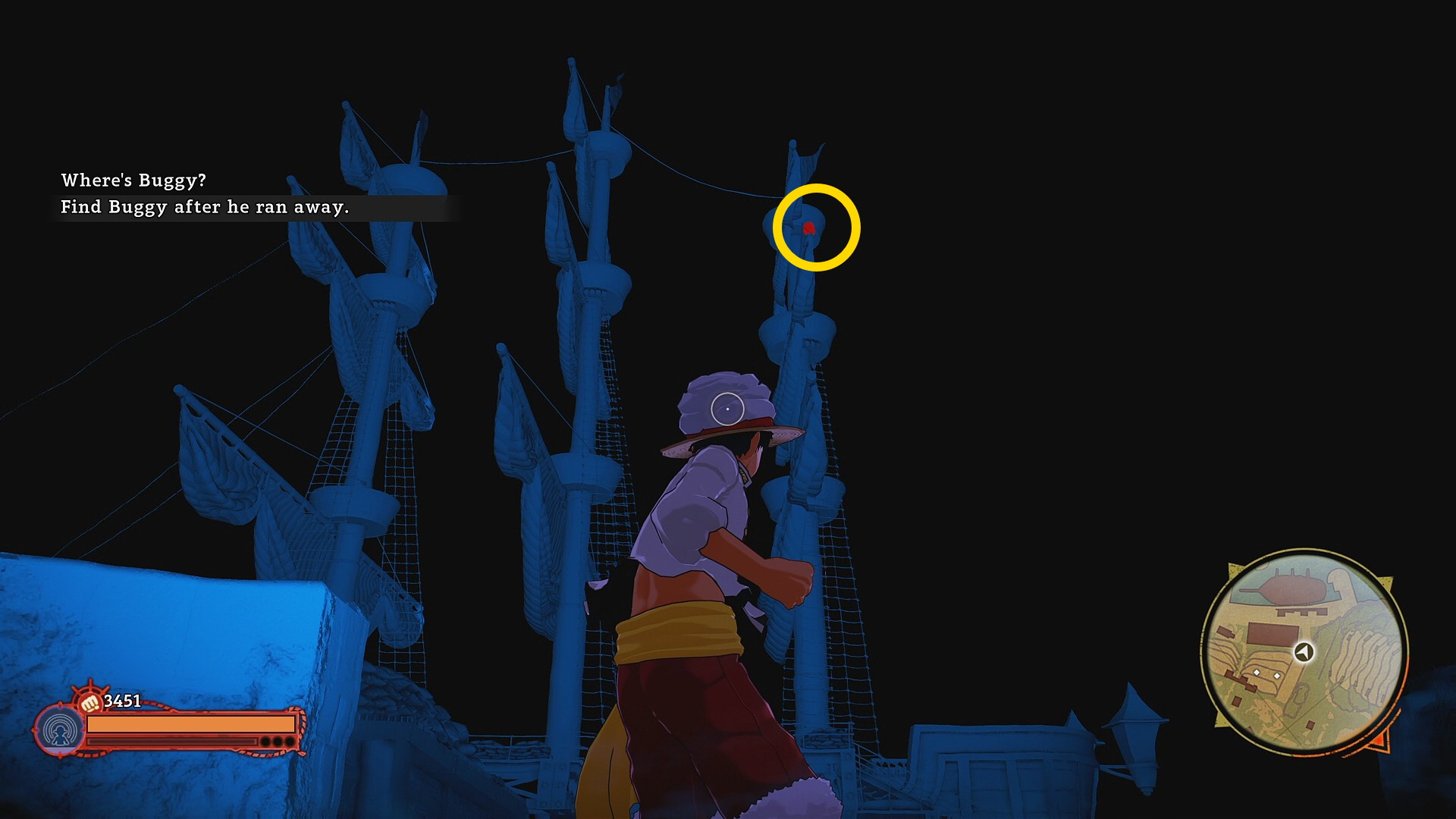 • 港の海賊を始末し (しなくてもいいけど)、右側のマストの一番上にバギーが隠れているので見つける