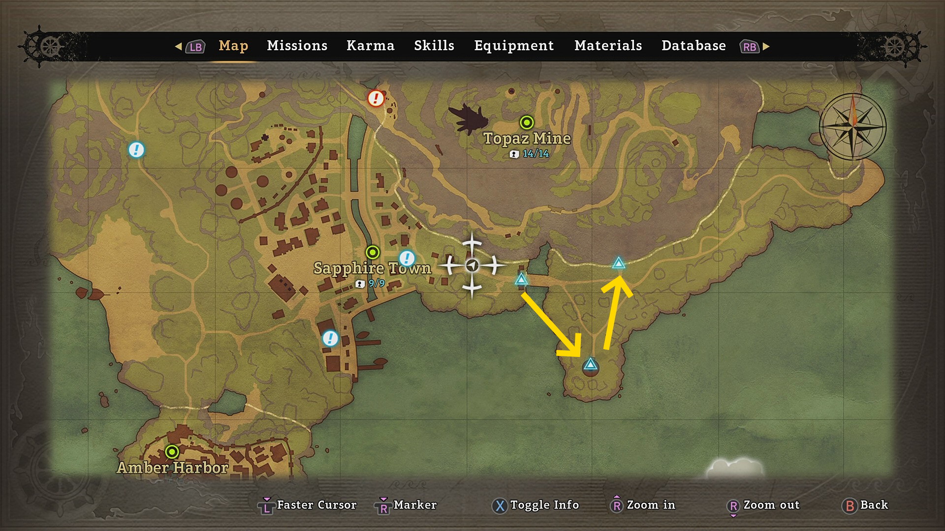 • Sapphire Town Plaza の東の川を渡ると2つの「青い!」があり、その内の南側のマーカー。男性と会話するとサイドミッション開始