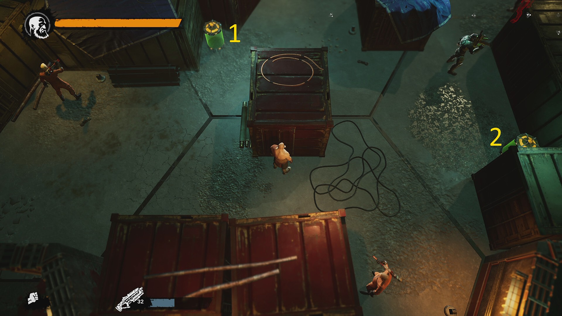 - 左に強化兵 (ファイター)が止まっているのでこちらに誘導し、ダウンさせて液体でキル ⇒ 10