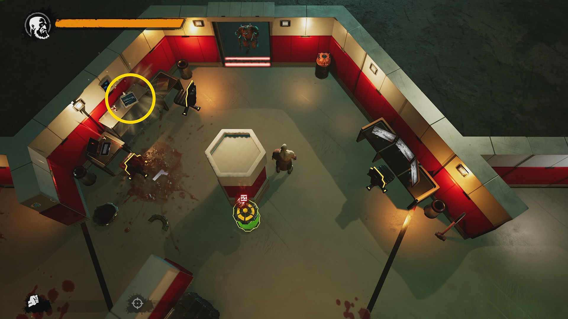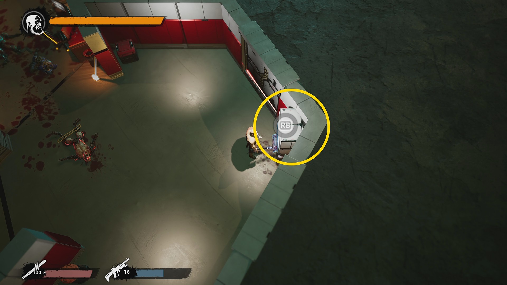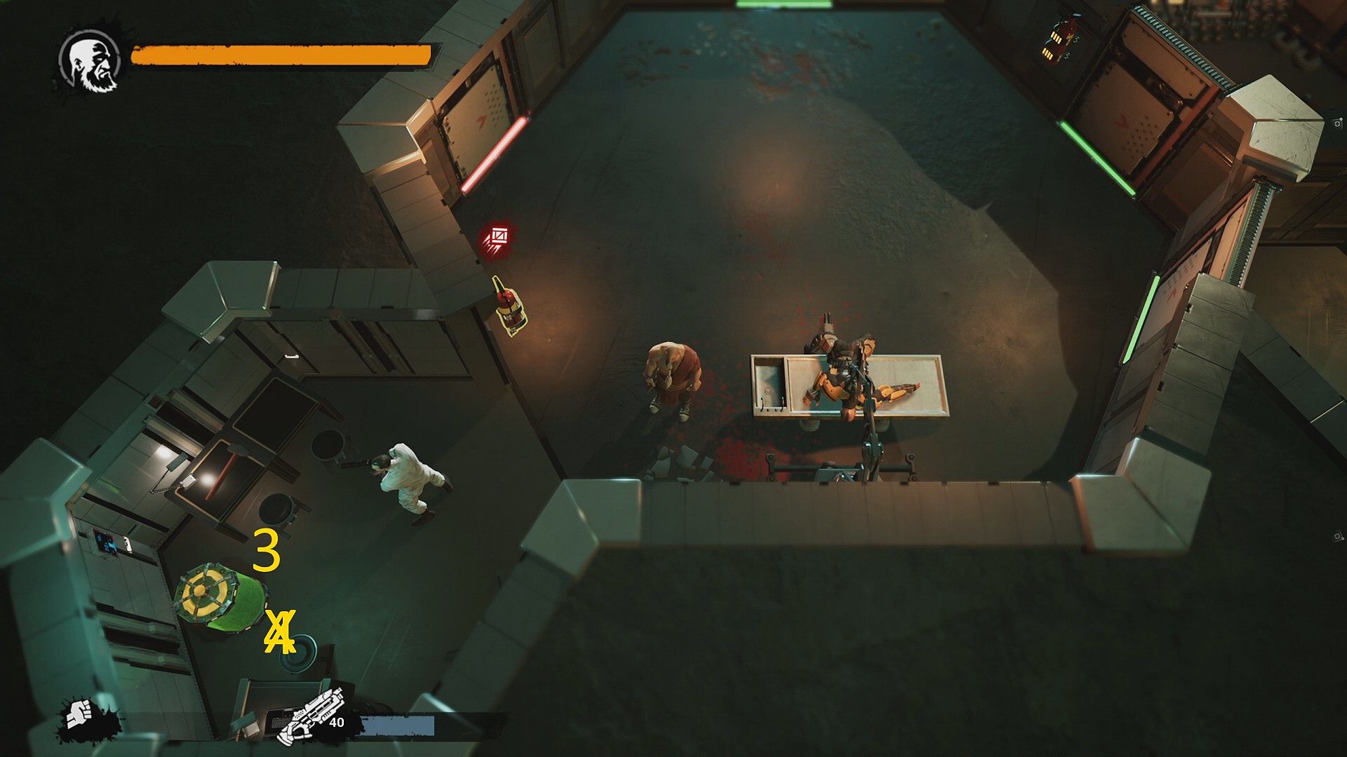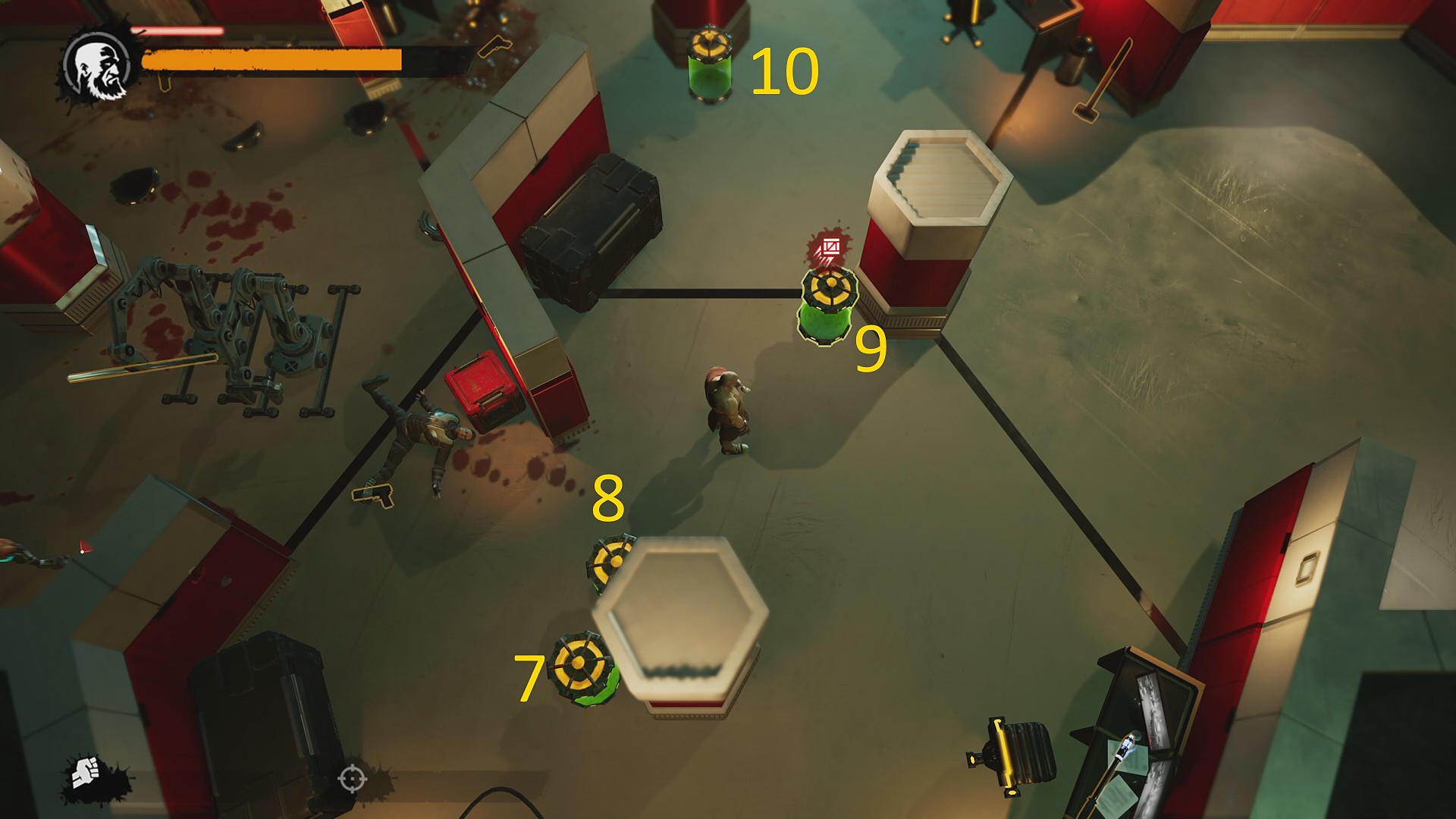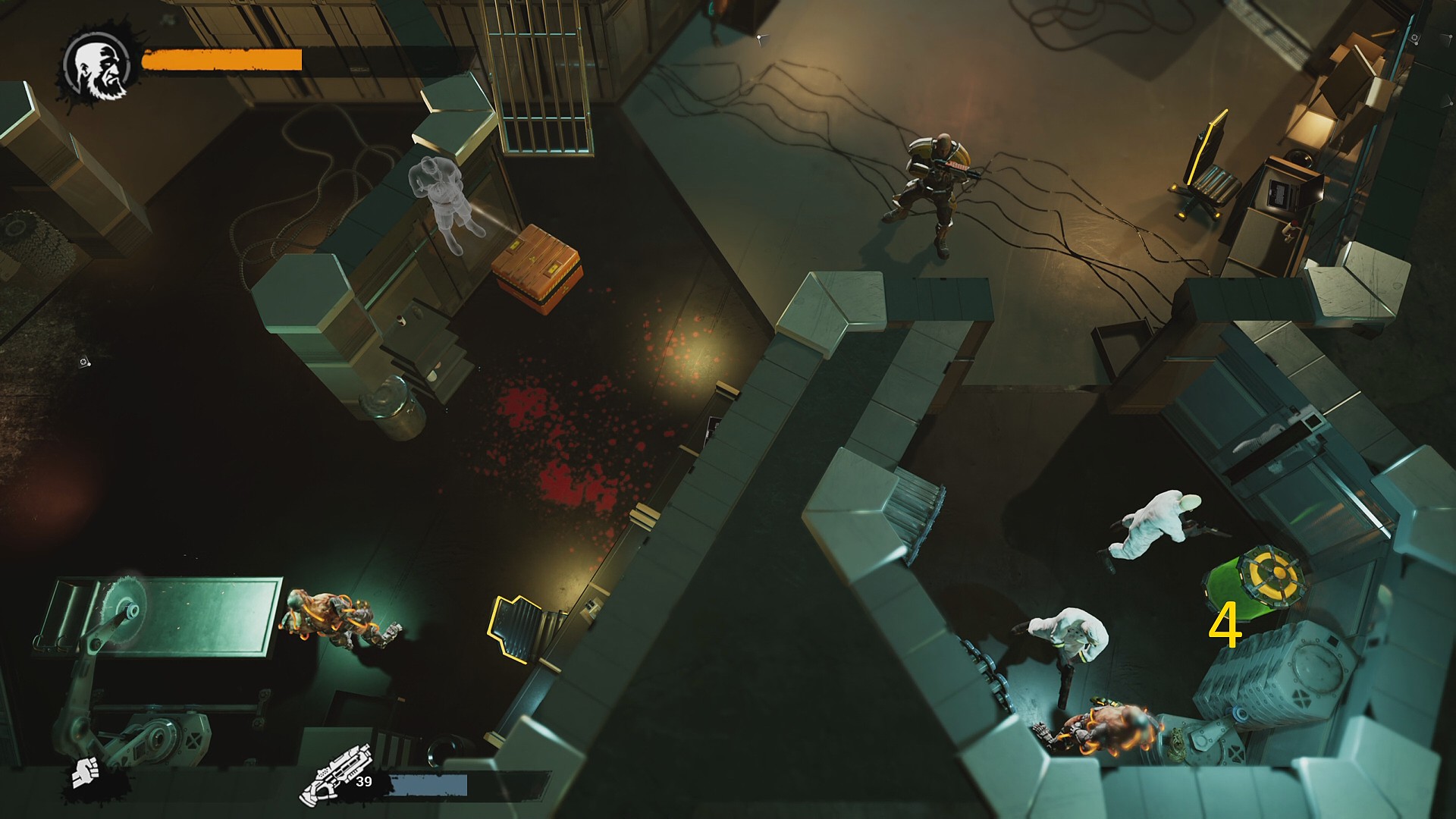 - 右上で巡回している黄色鎧が背を向けている間に一気に走り込み、白色の研究員を液体でキル