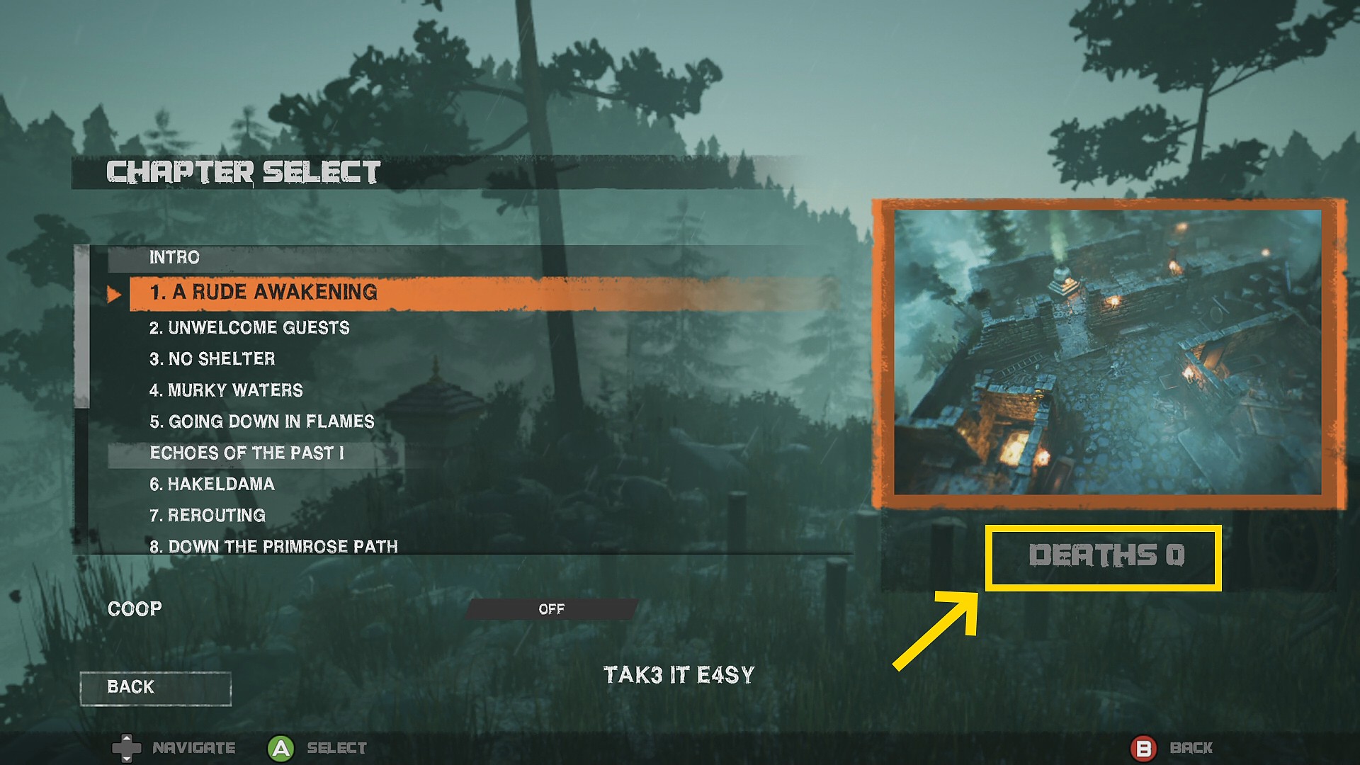 - 各章を選ぶ際、下画像のように Death 0 の表記がある章はプレイする必要なし
