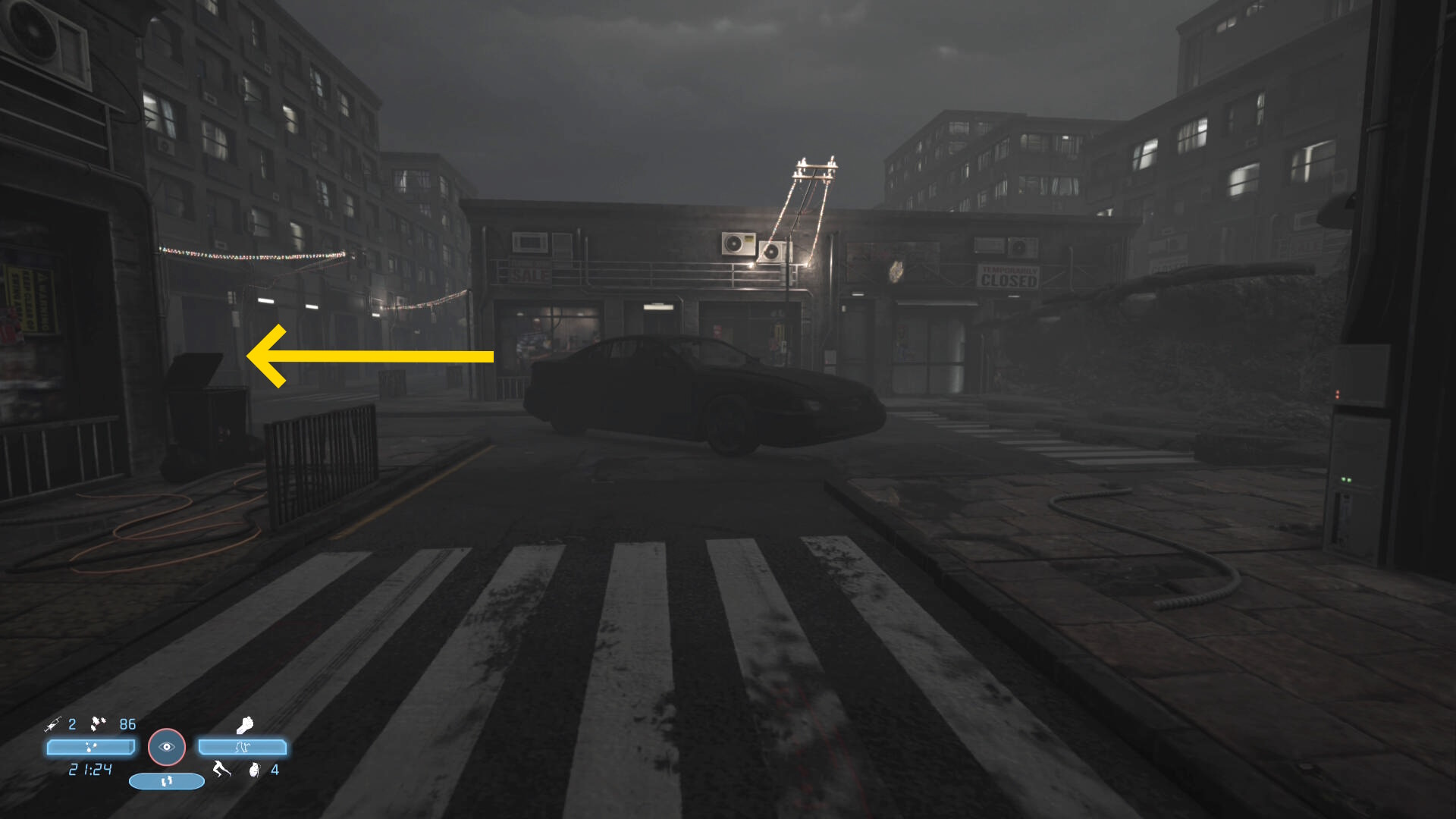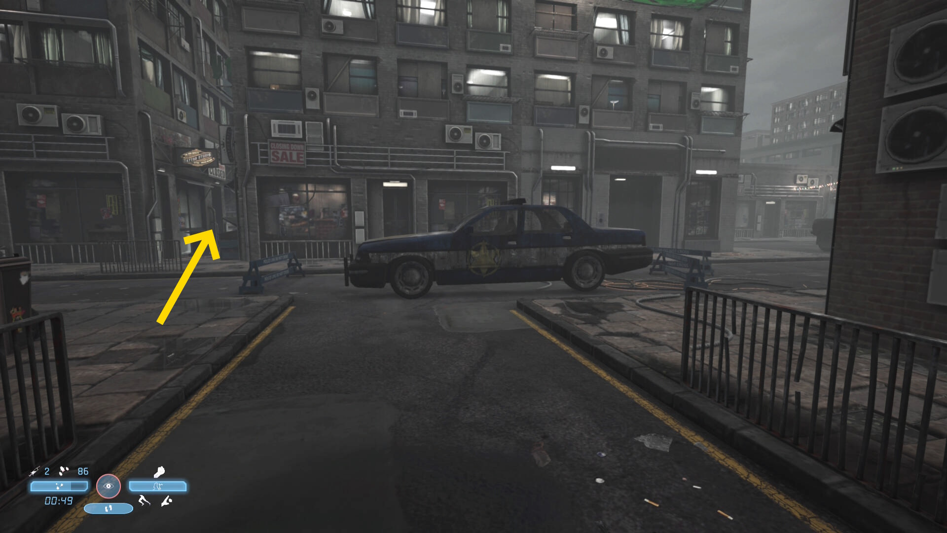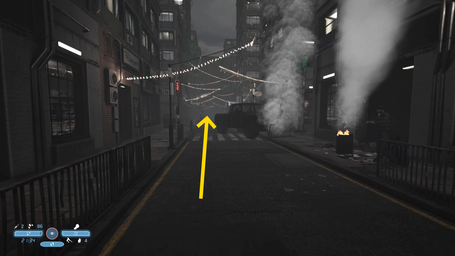 - 少し進むと1台の車がバリケードに突っ込んで停まっている(煙が出ている)のが見える