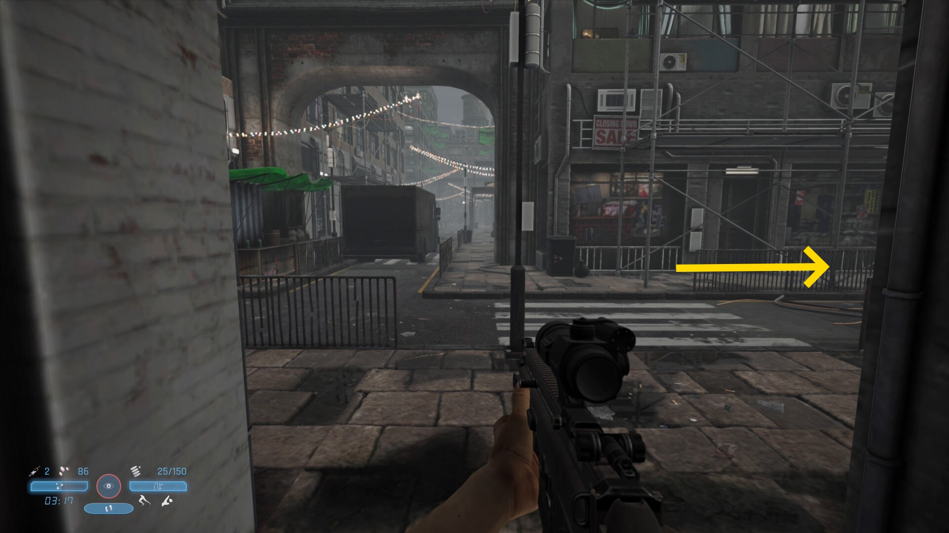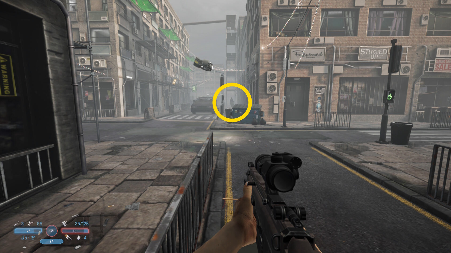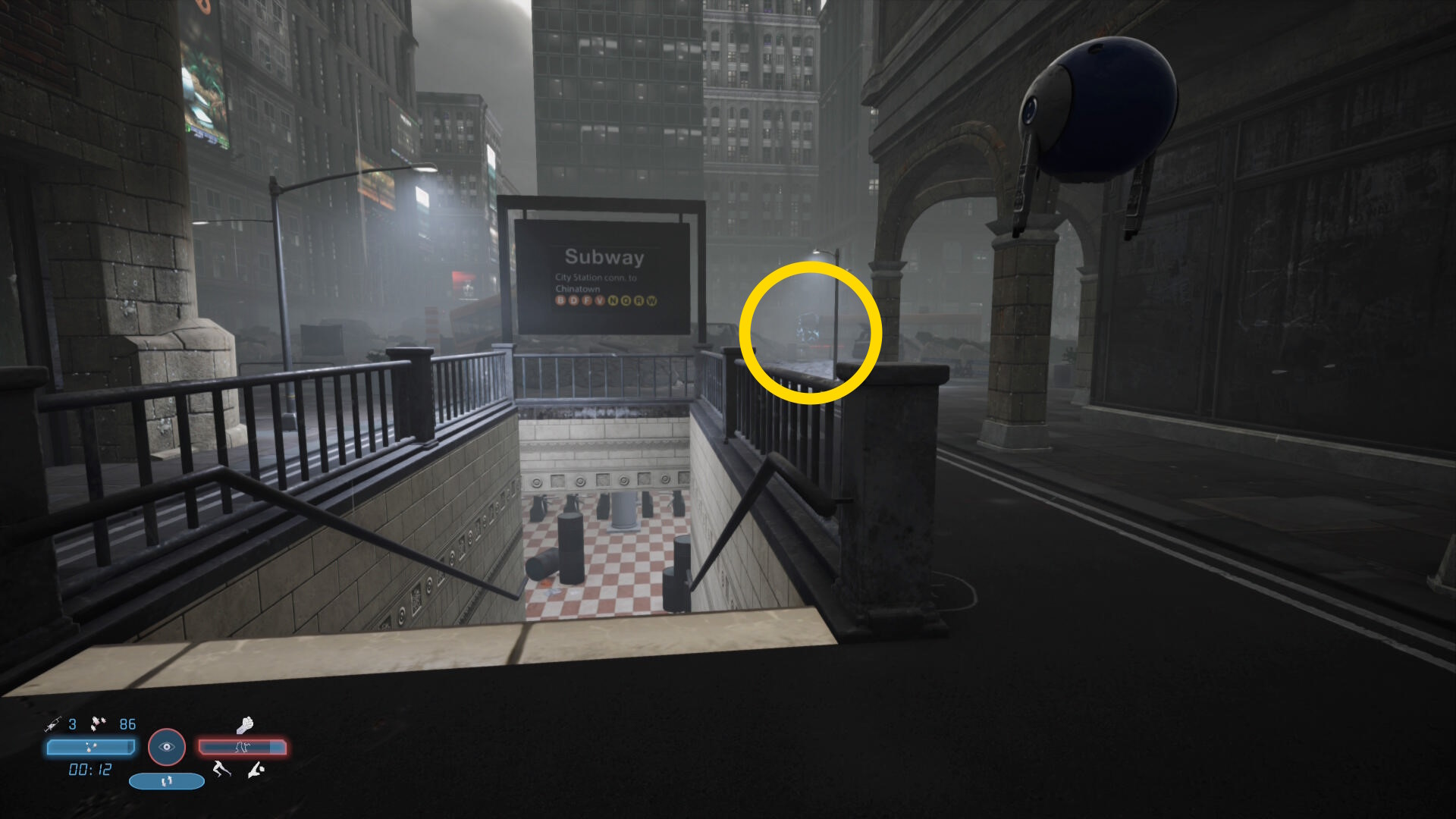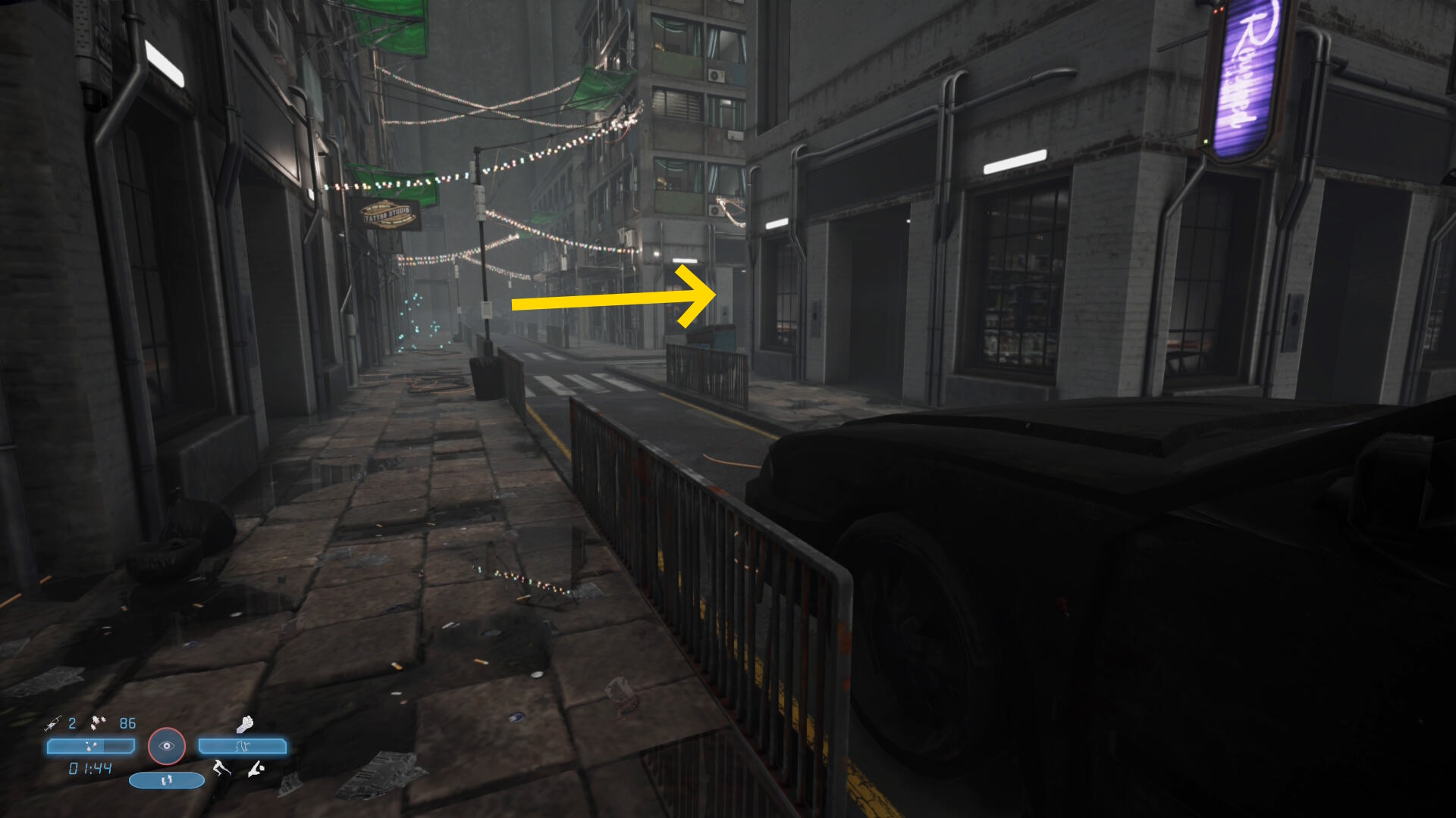 - 少し進むと1台の車がバリケードに突っ込んで停まっている(煙が出ている)のが見える