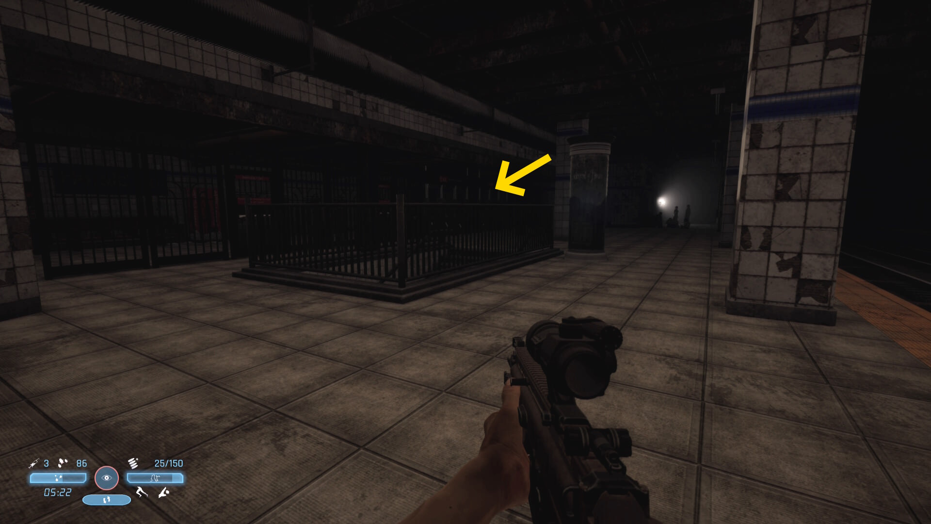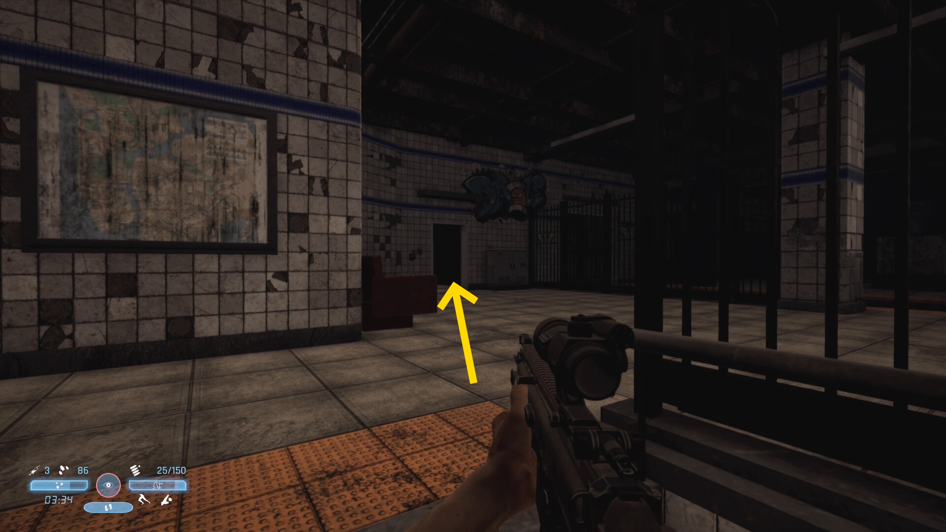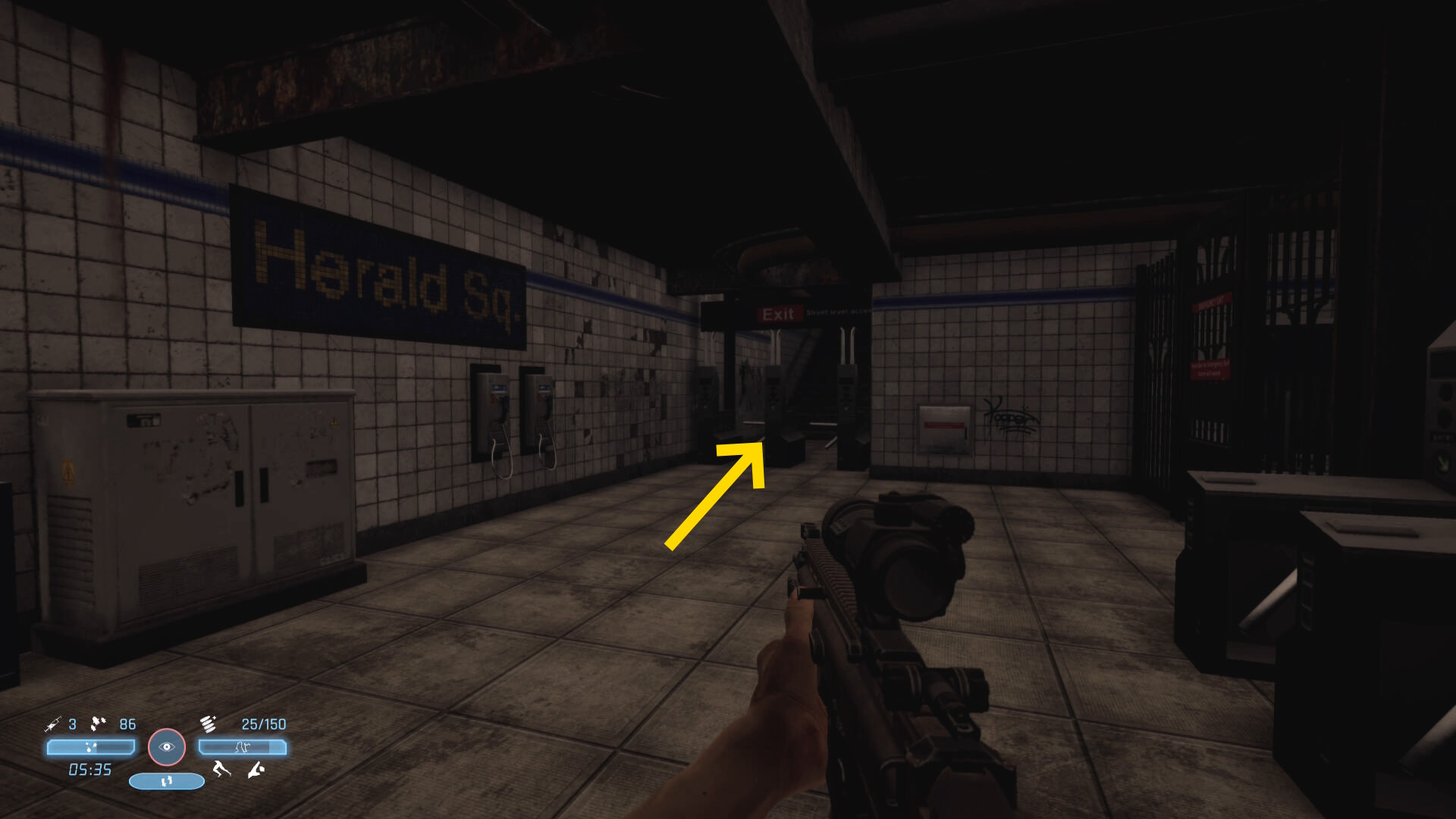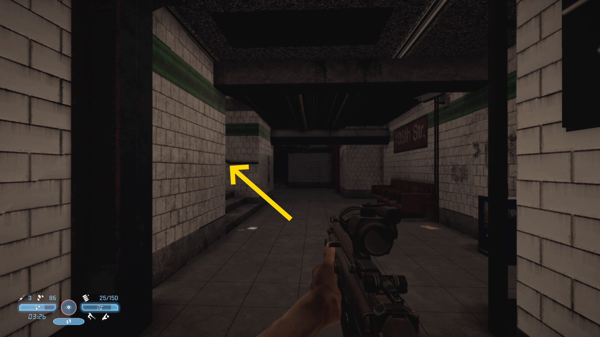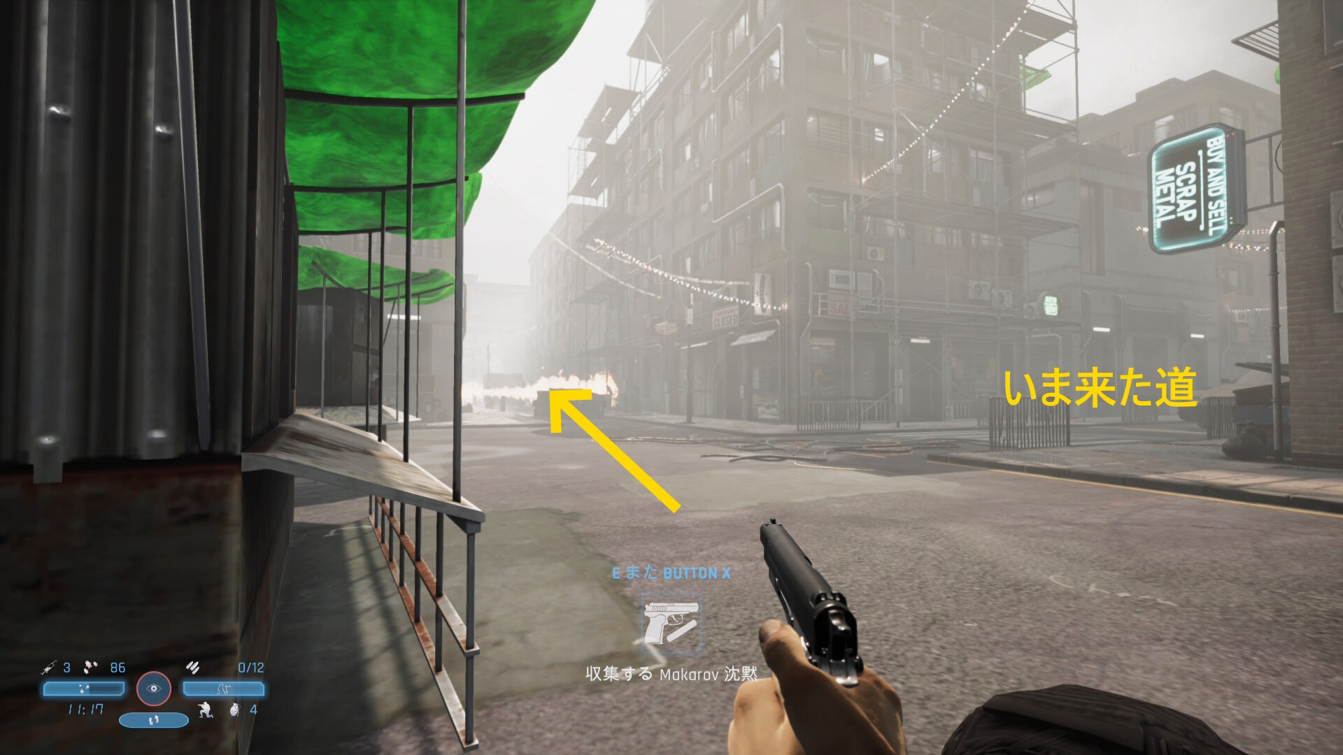 - 弾薬補給箱のところから、いま来た道のほうを向く(上画像矢印)