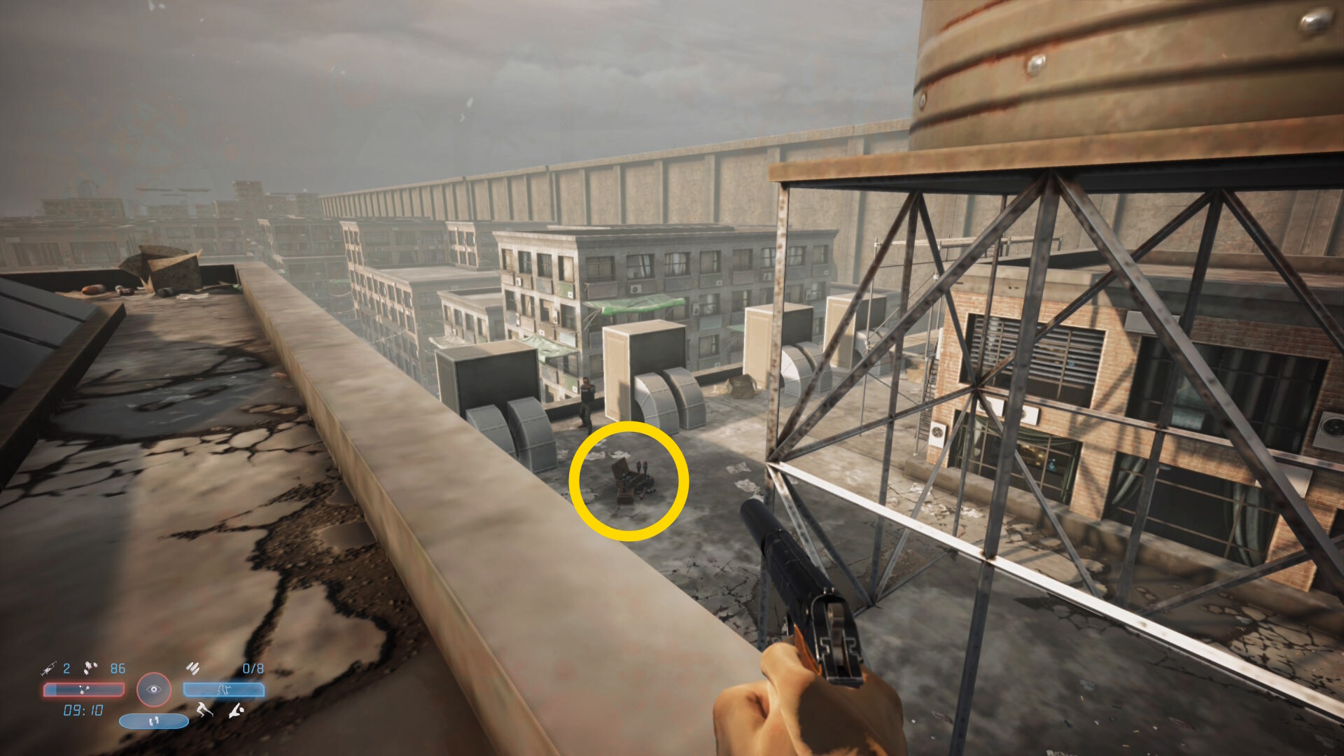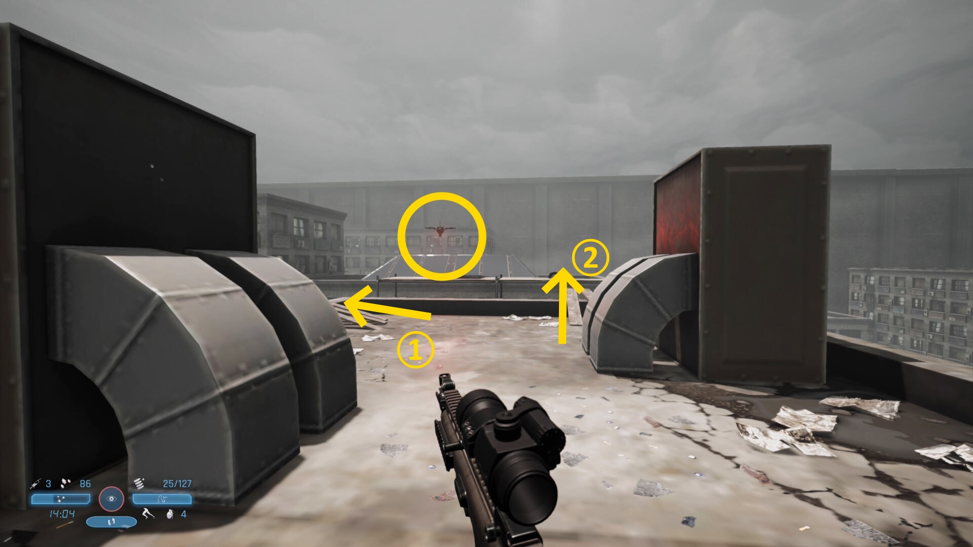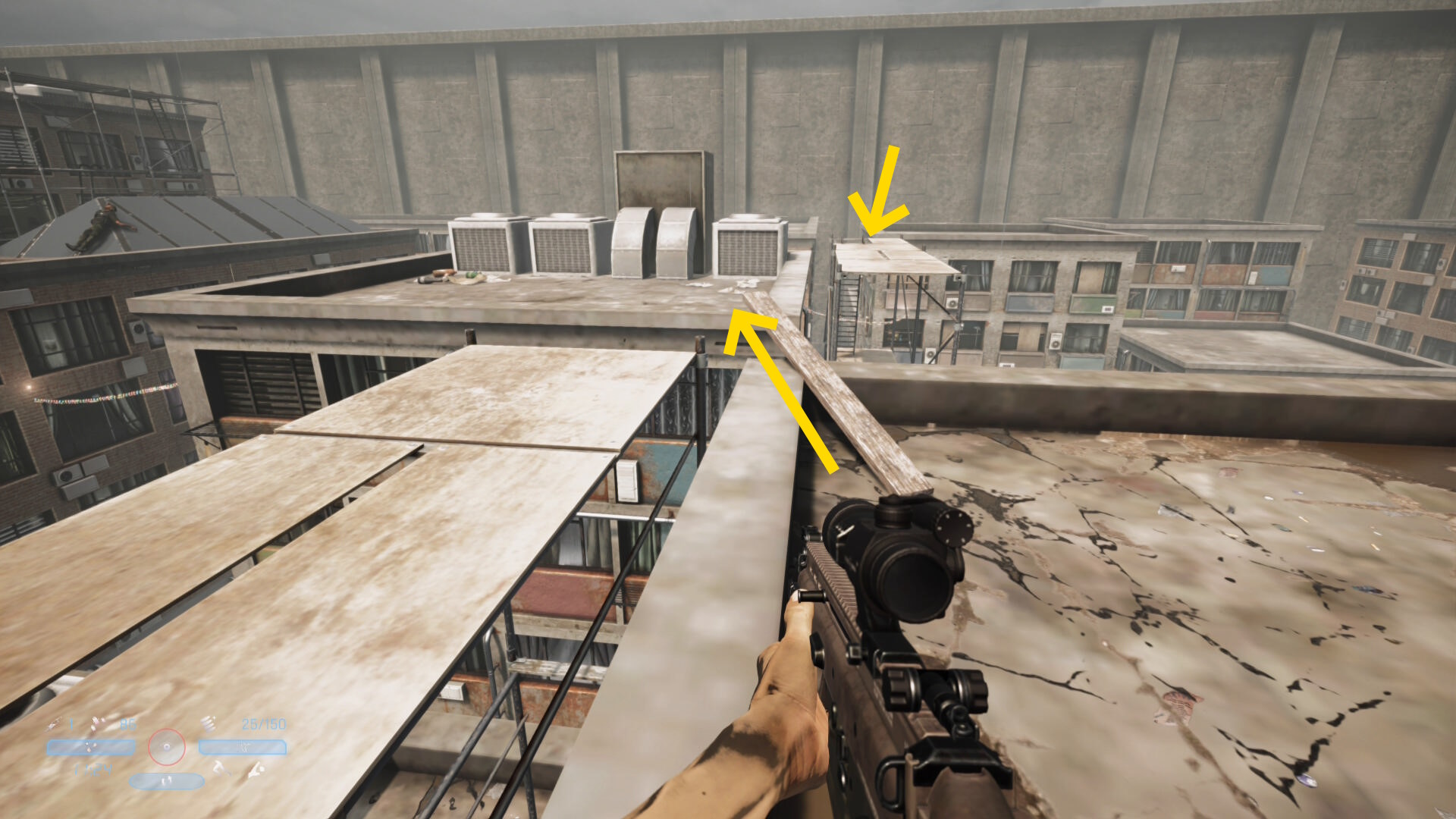 - 足場を登ると奥のビルの屋上に2人の敵が見える