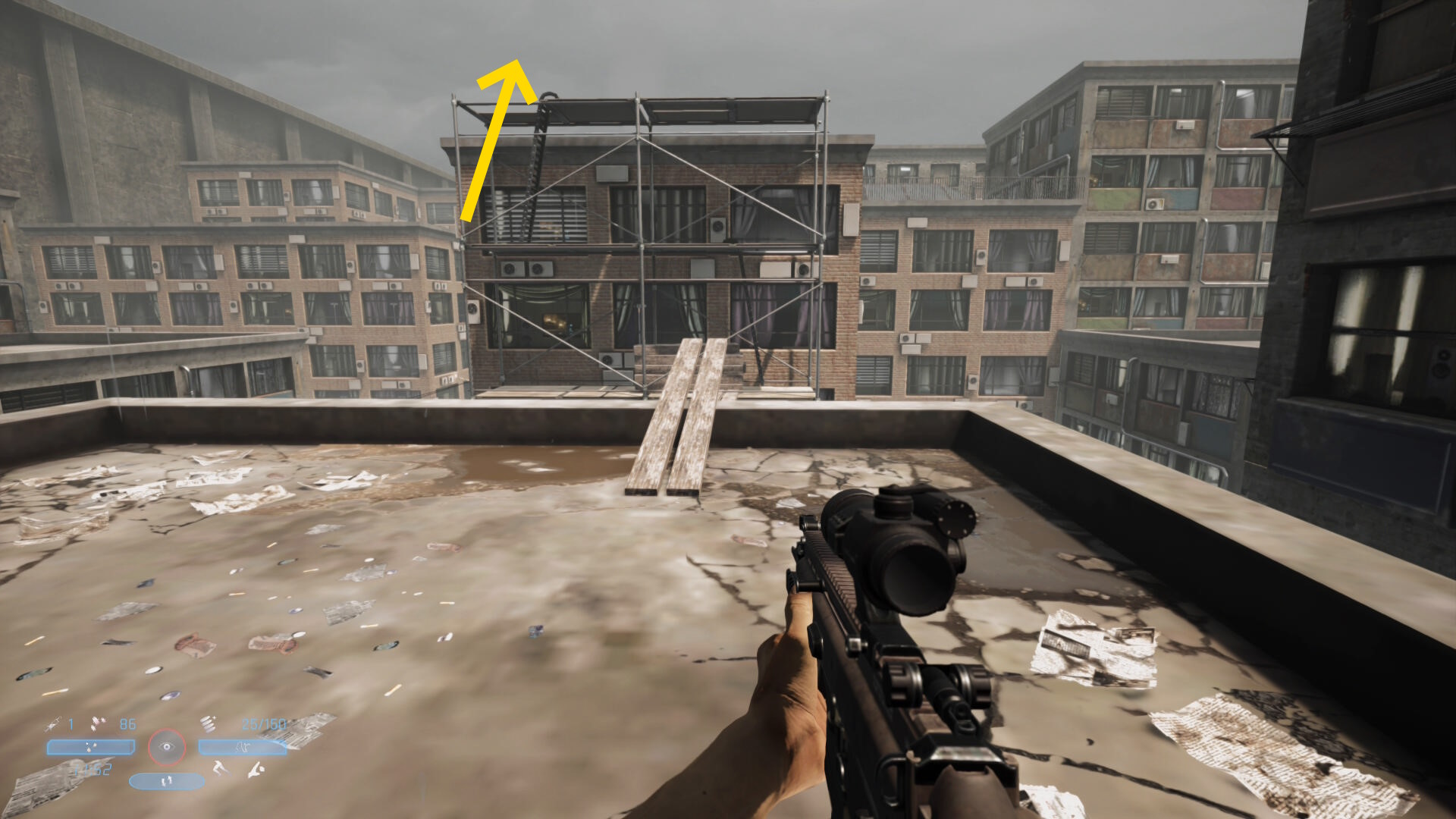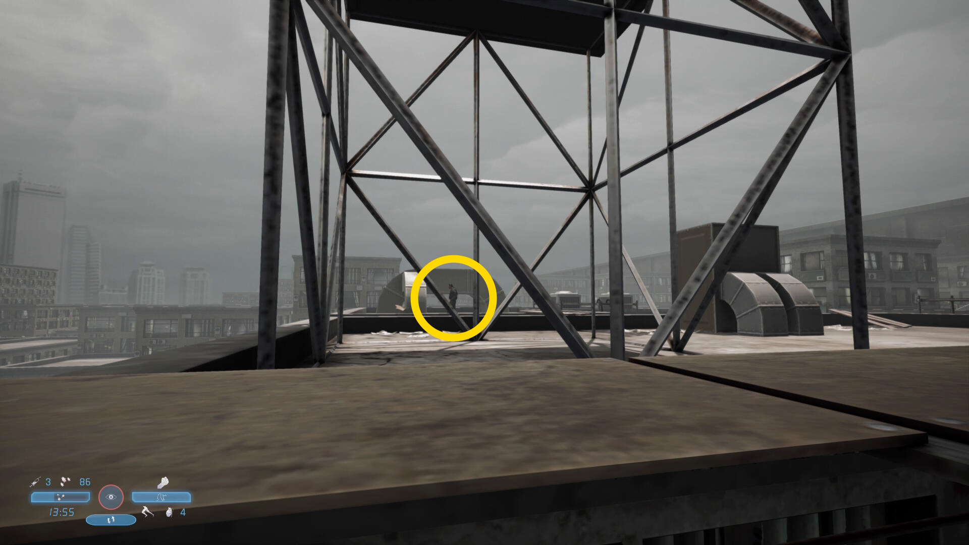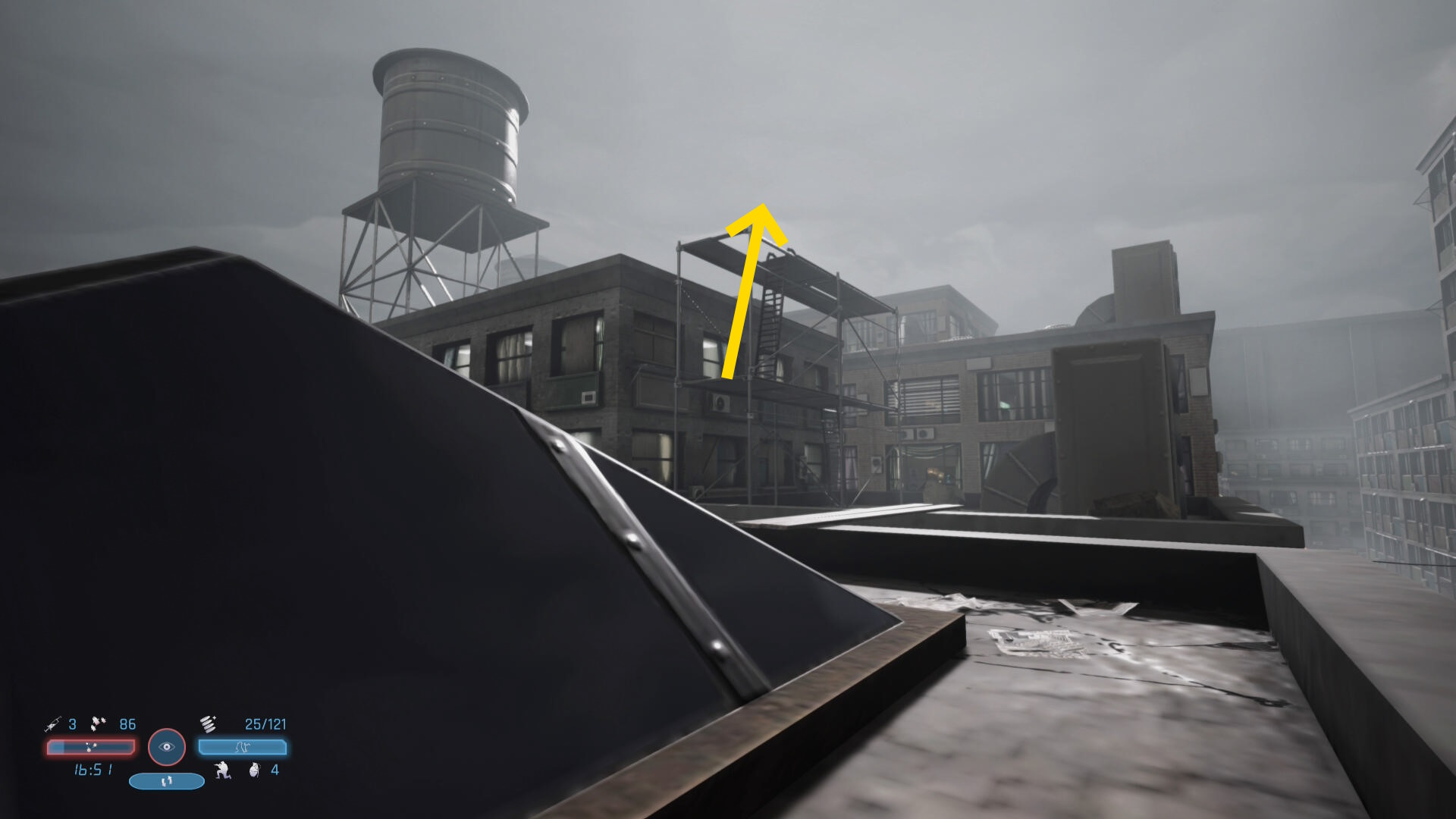 - 足場を登ると奥のビルの屋上に2人の敵が見える