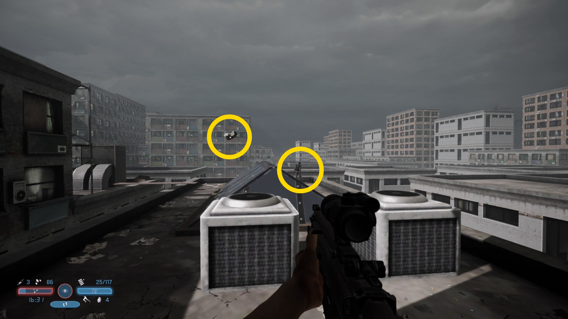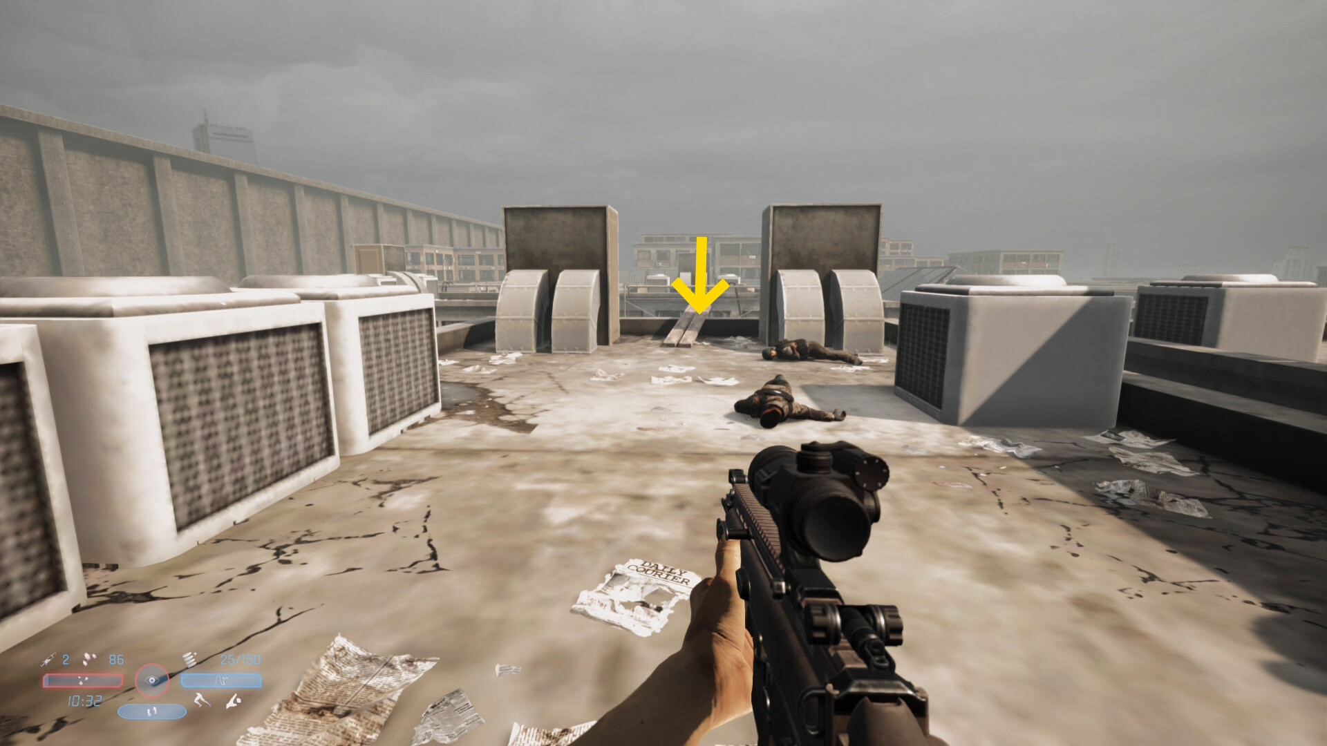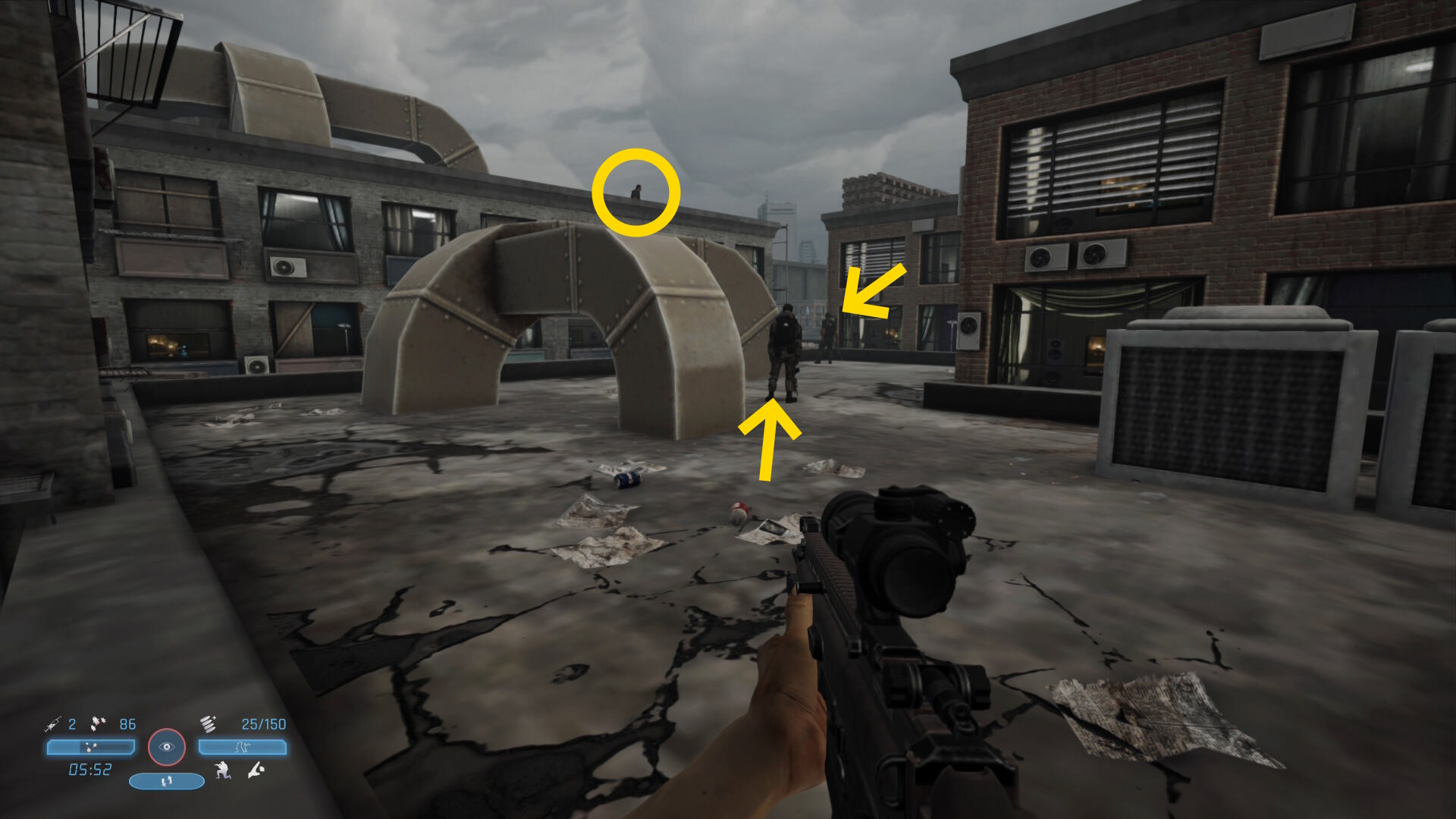 - 頭上のビル上にも敵が1人いるので注意(あとでキルすることになる)