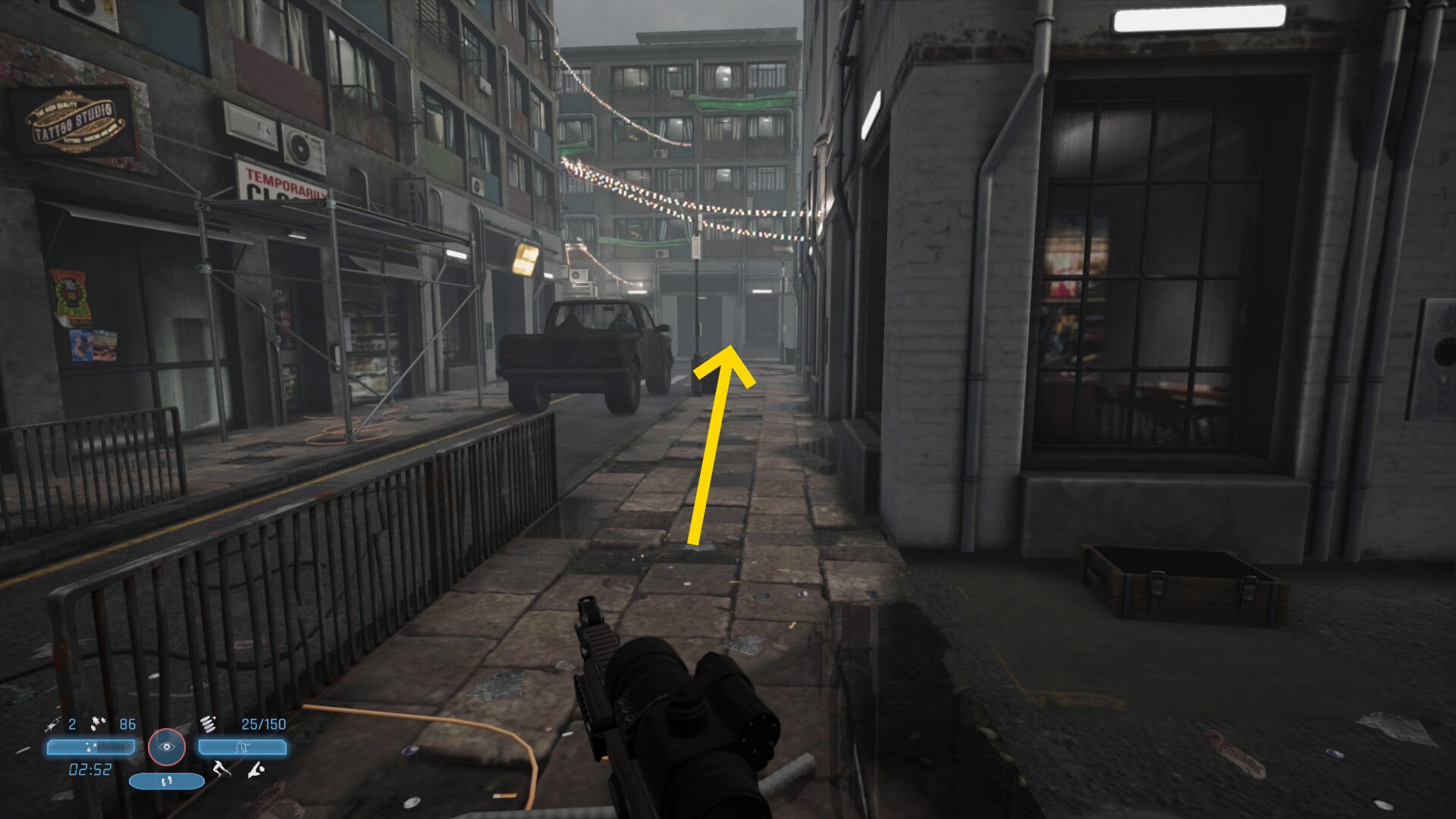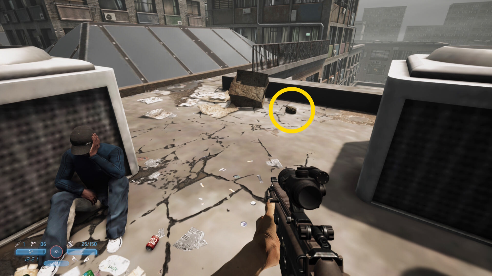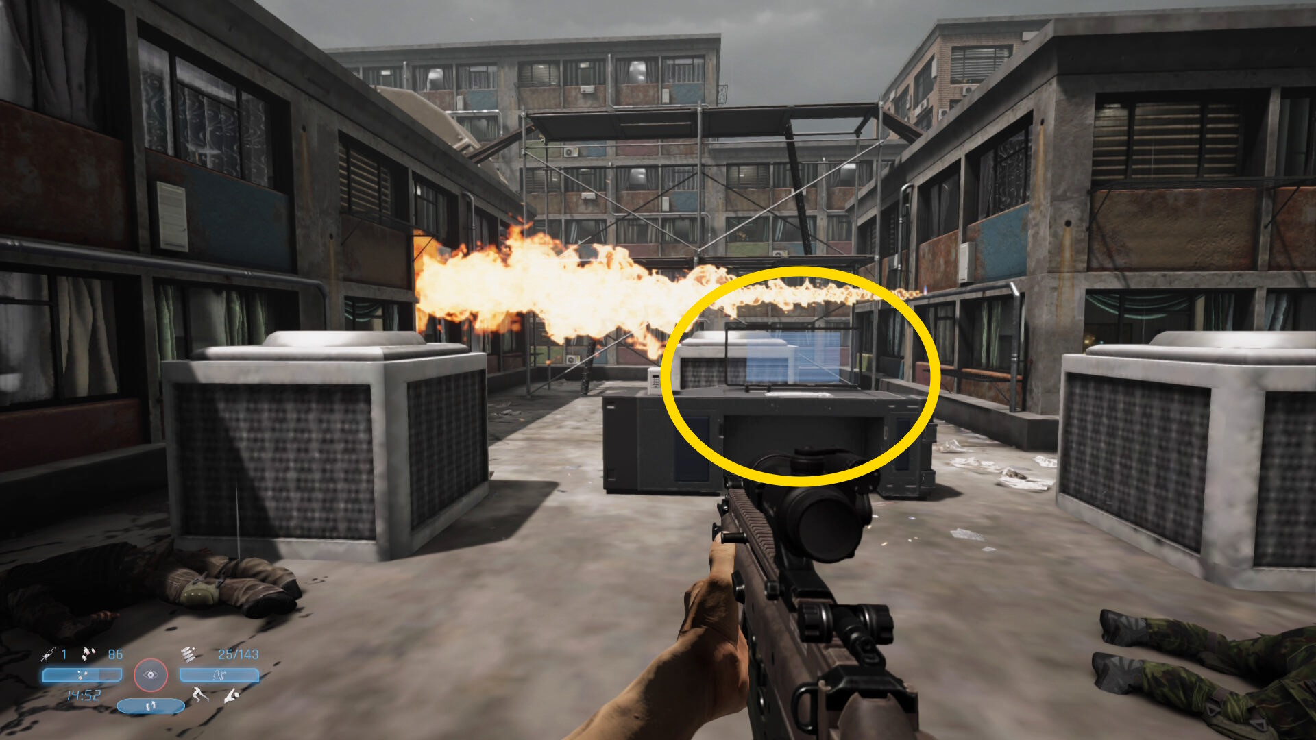 - 頭上のビル上にも敵が1人いるので注意(あとでキルすることになる)