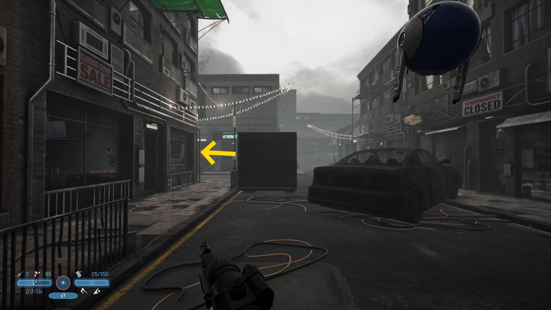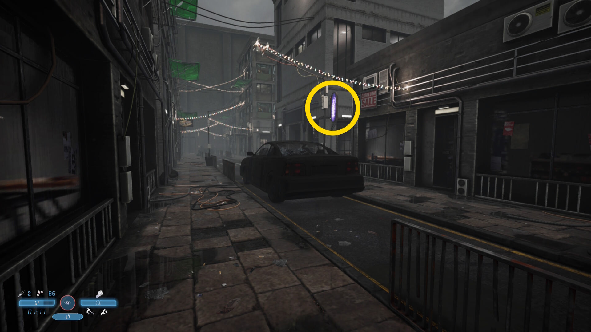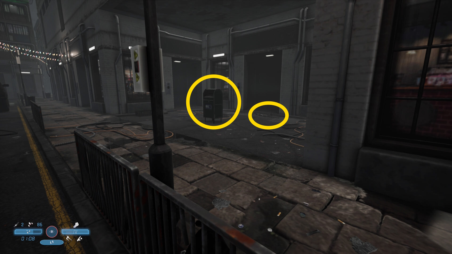 - おそらく早い段階で見つかり、攻撃されるので近くの室外機に隠れるなどして被ダメージを減らそう