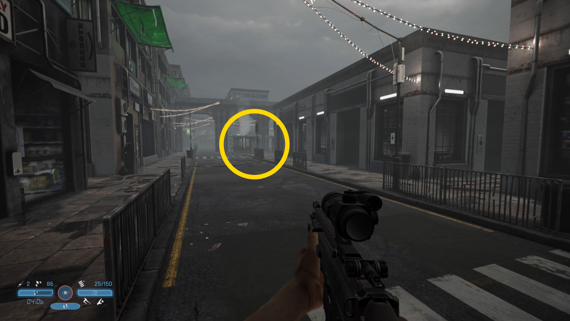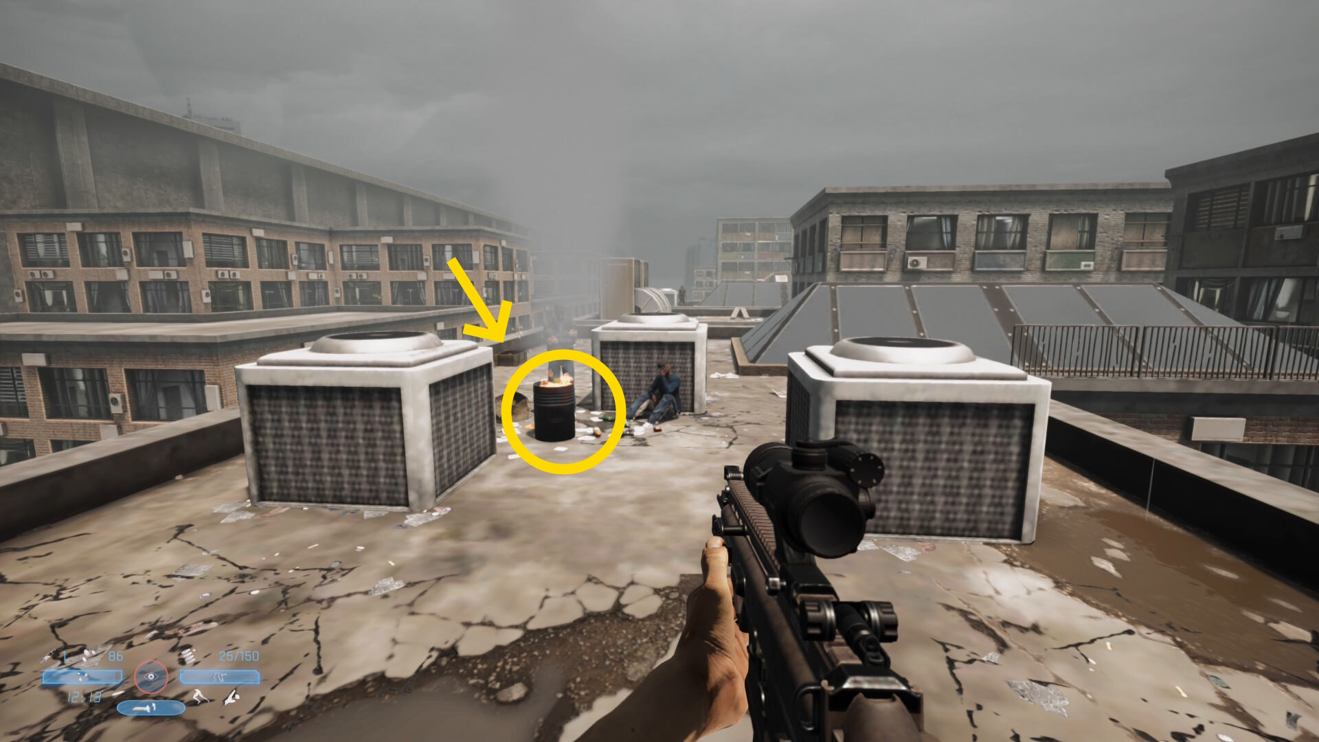 - 中央の天窓から奥のビルのドラム缶を撃って爆破キルを狙う