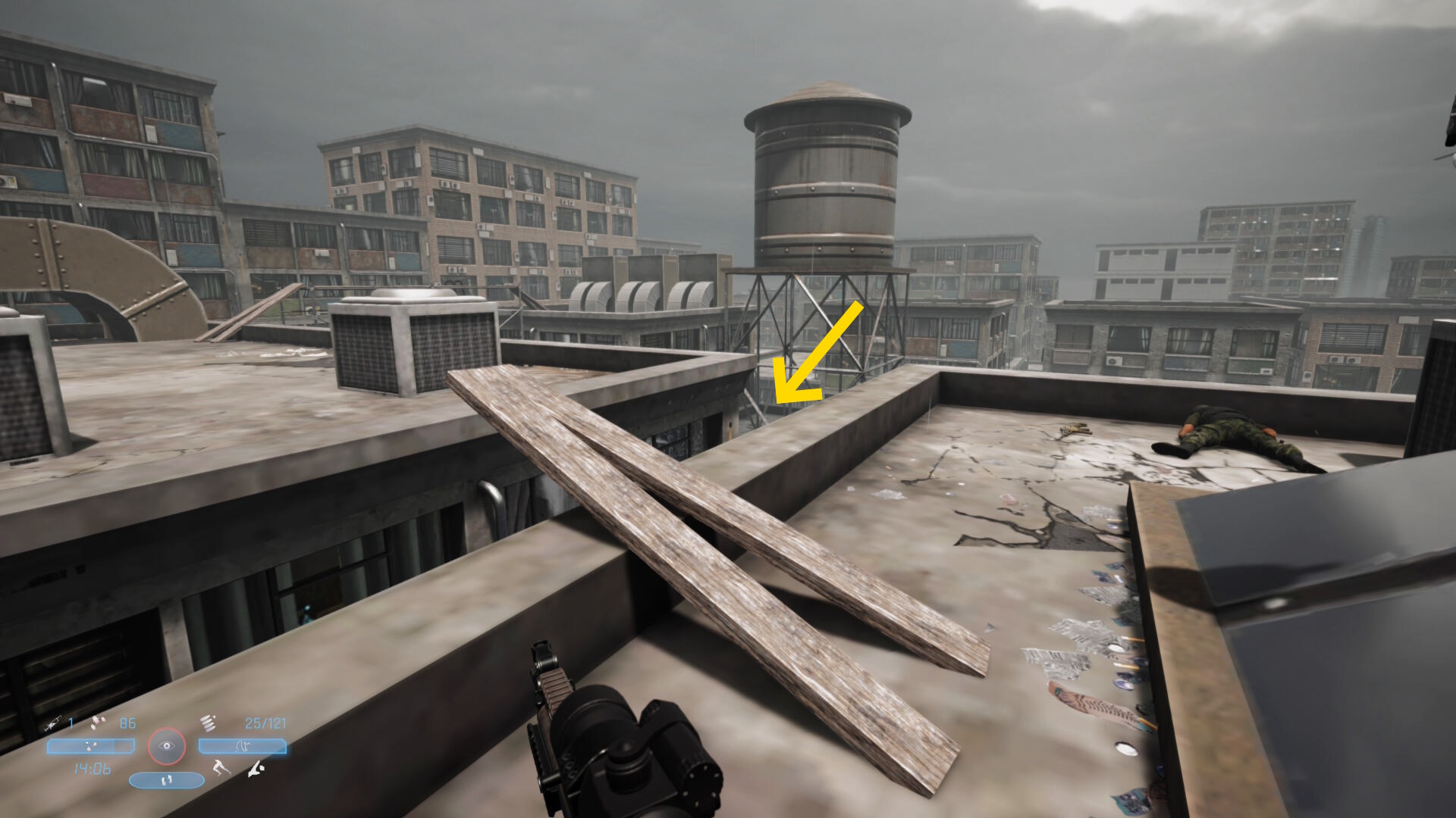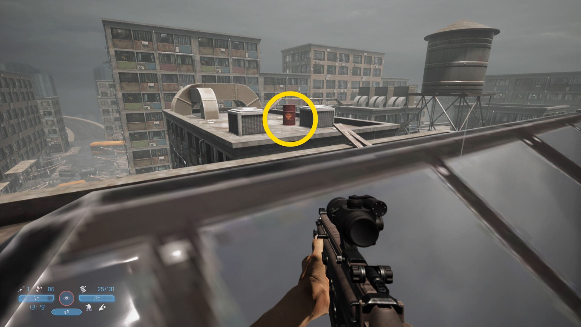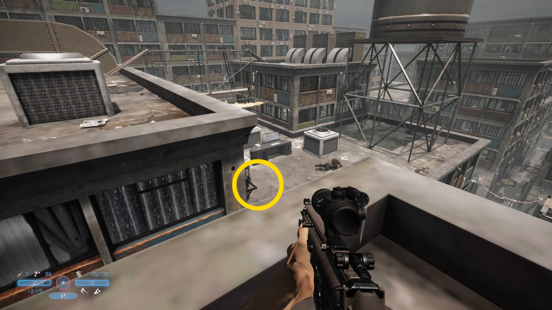 - ビルの屋上に着いたら2人の敵をキルし、左前方のビル屋上へ(給水塔のほうへ)