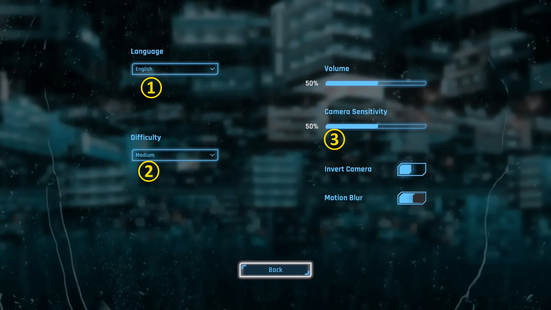 - タイトル画面 ⇒ Settings ⇒ General と進み、以下の項目を変更する