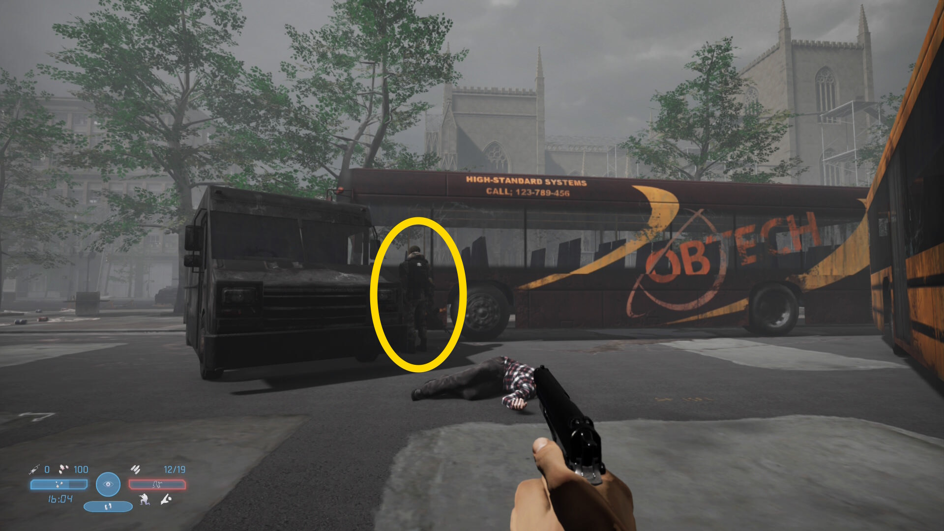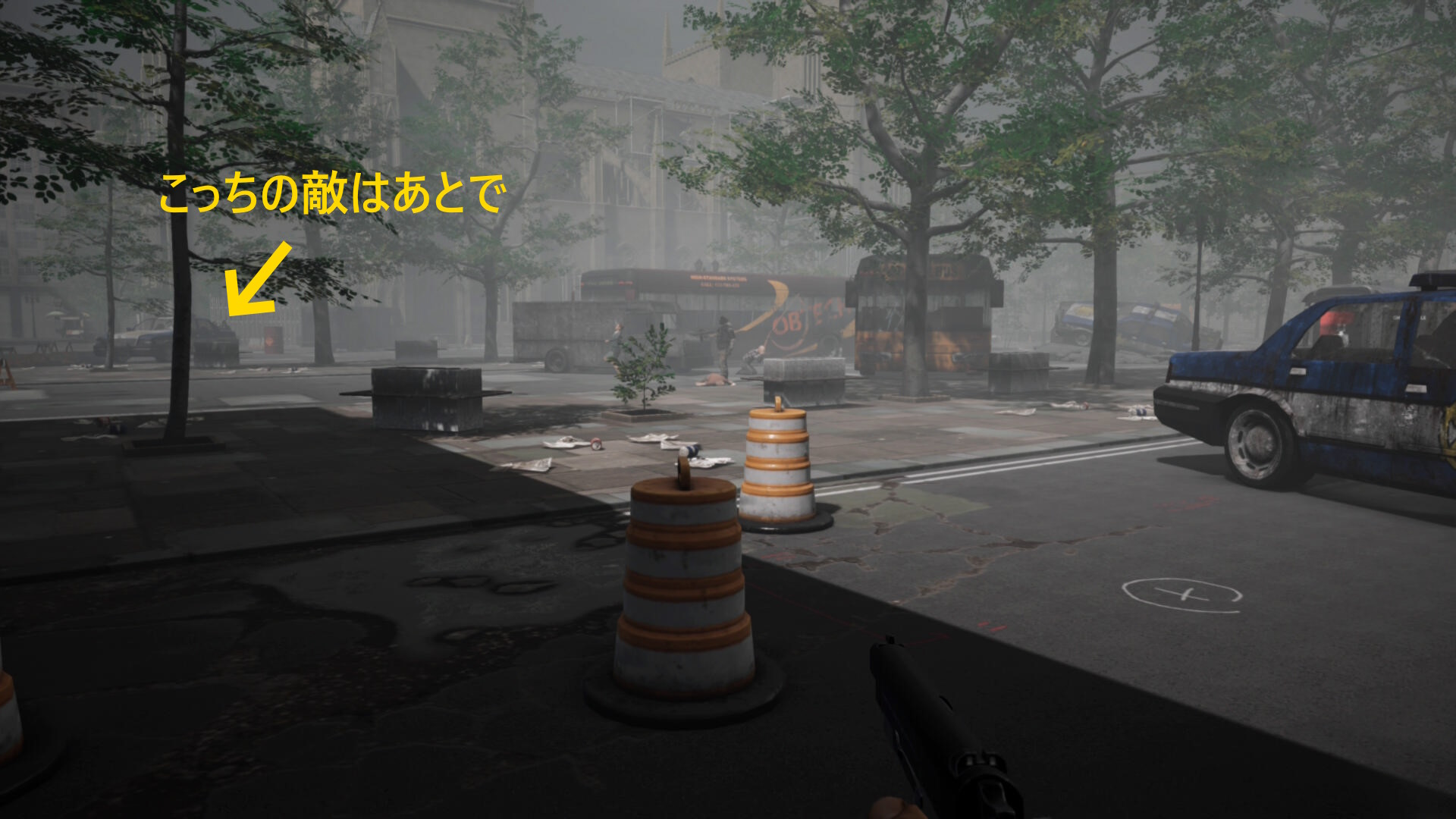 - スクールバスまで戻ったら、今ほど感づいた敵(上画像1枚目、左奥の敵)のところへ