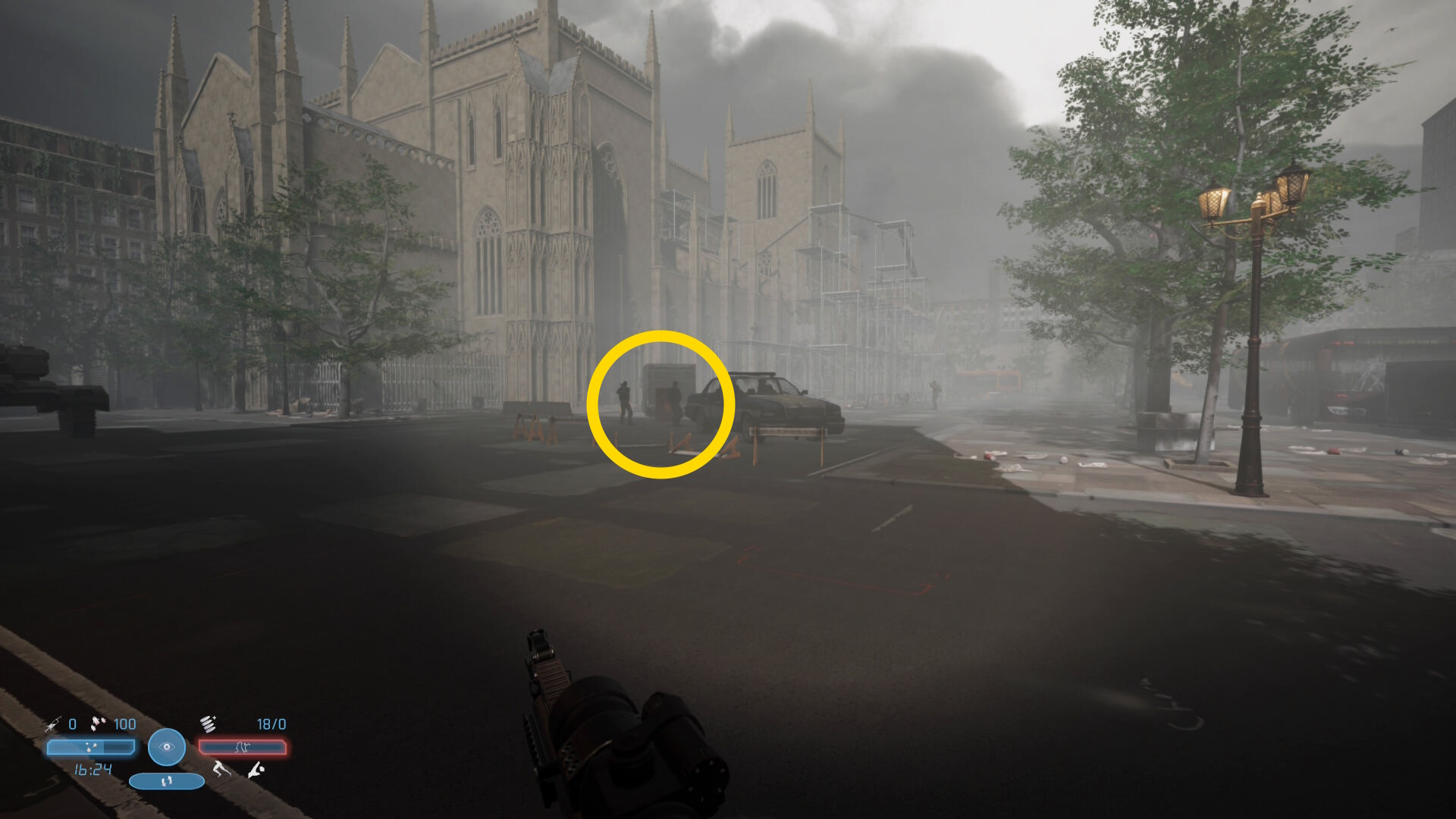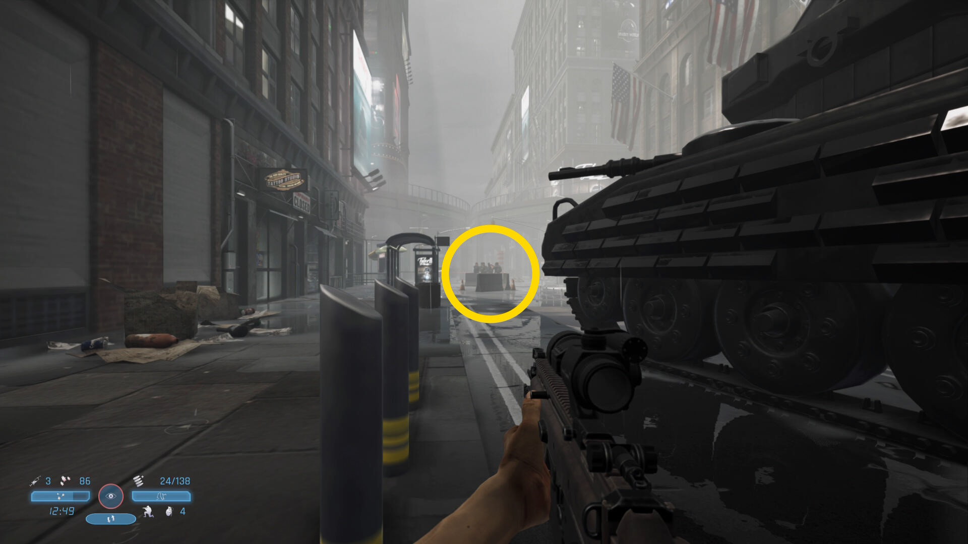 - 道路の真ん中に戦車が停まっており、その奥の交差点に敵が6人いる