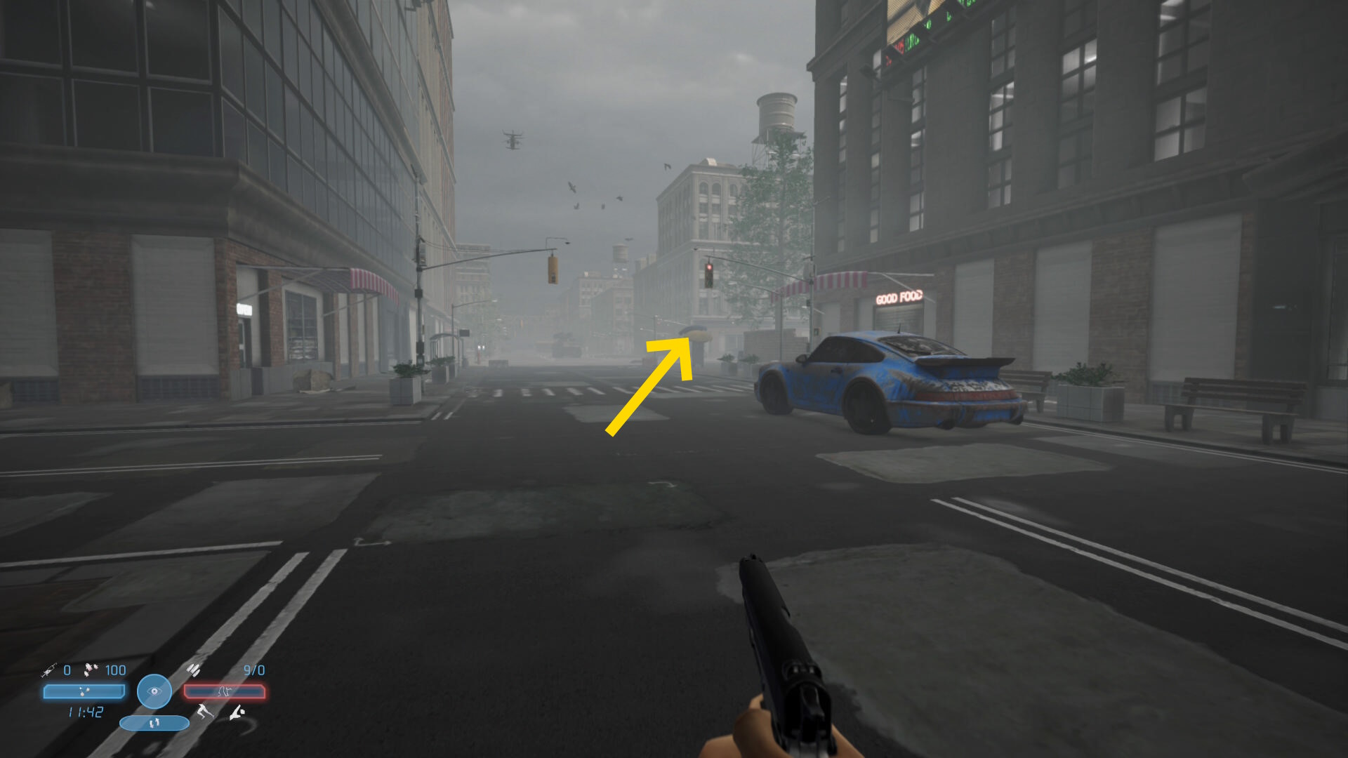 - 交差点に入るが、右側の車と角の露店のところにそれぞれ敵がいる場合がある