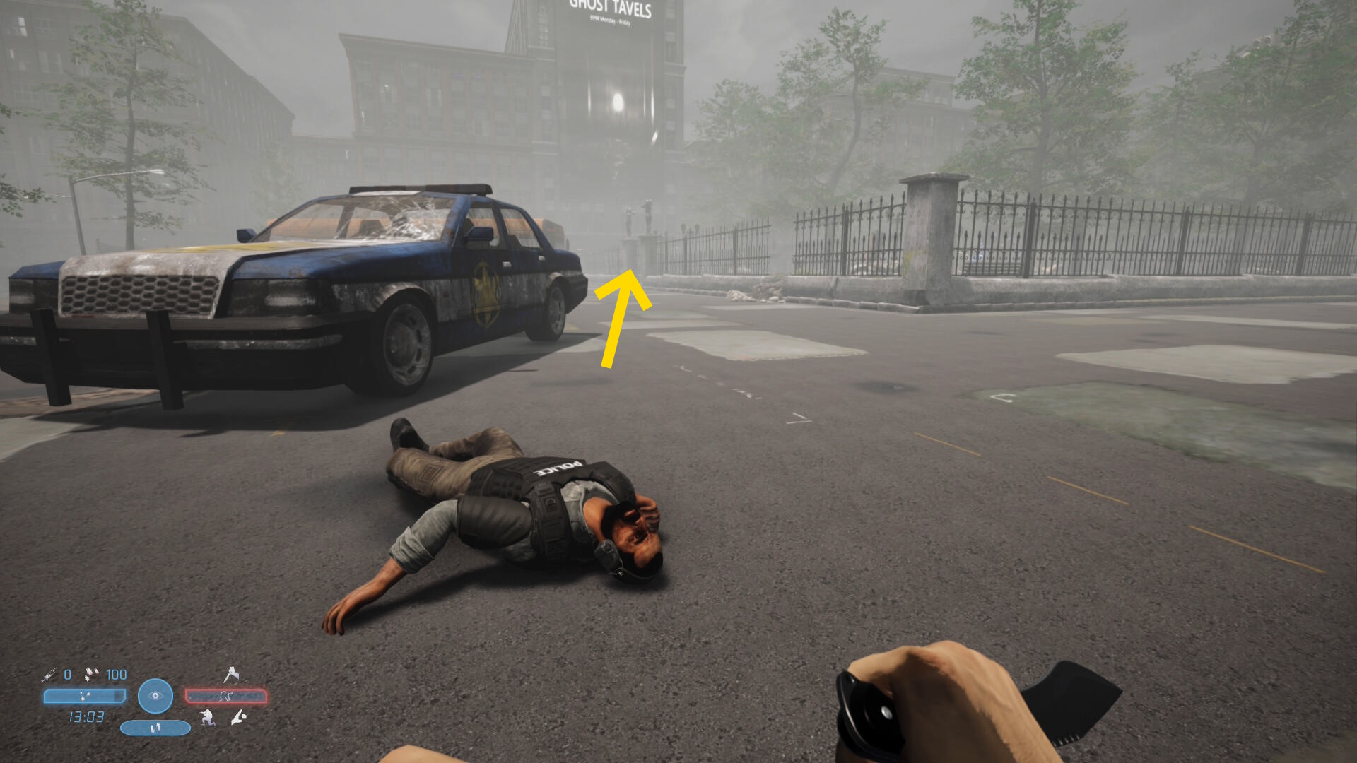 - 右前方に車が停まっており、この車の裏側に コンピューター(80年代のアイテム:3/5)があるので回収
