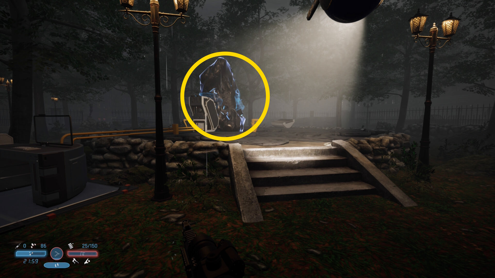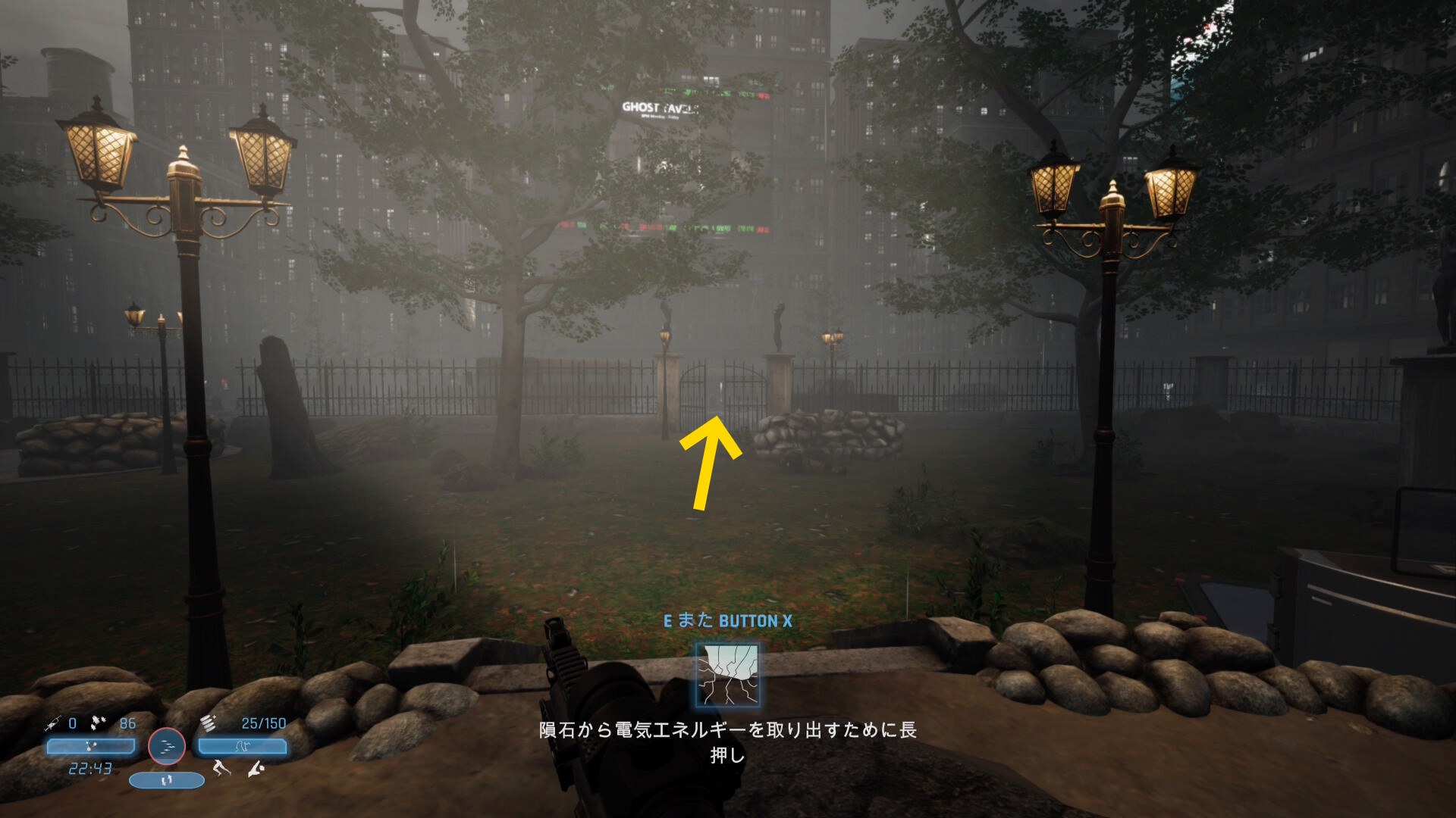 - 警報音は気にせず ”コの字” に進んでいくと左前方に石(電気エネルギーが補充できる)が見え、また右側の敷地から2人の敵が出てくるのでキル
