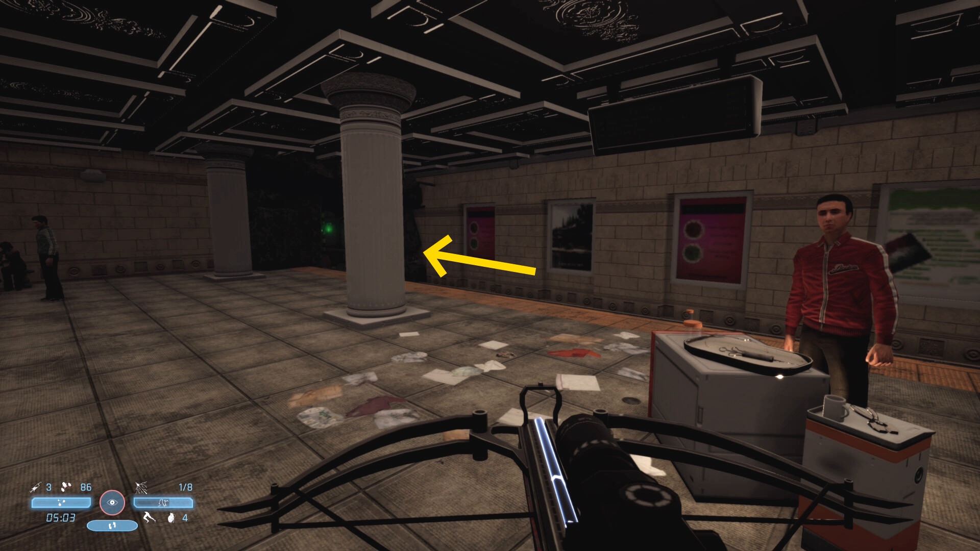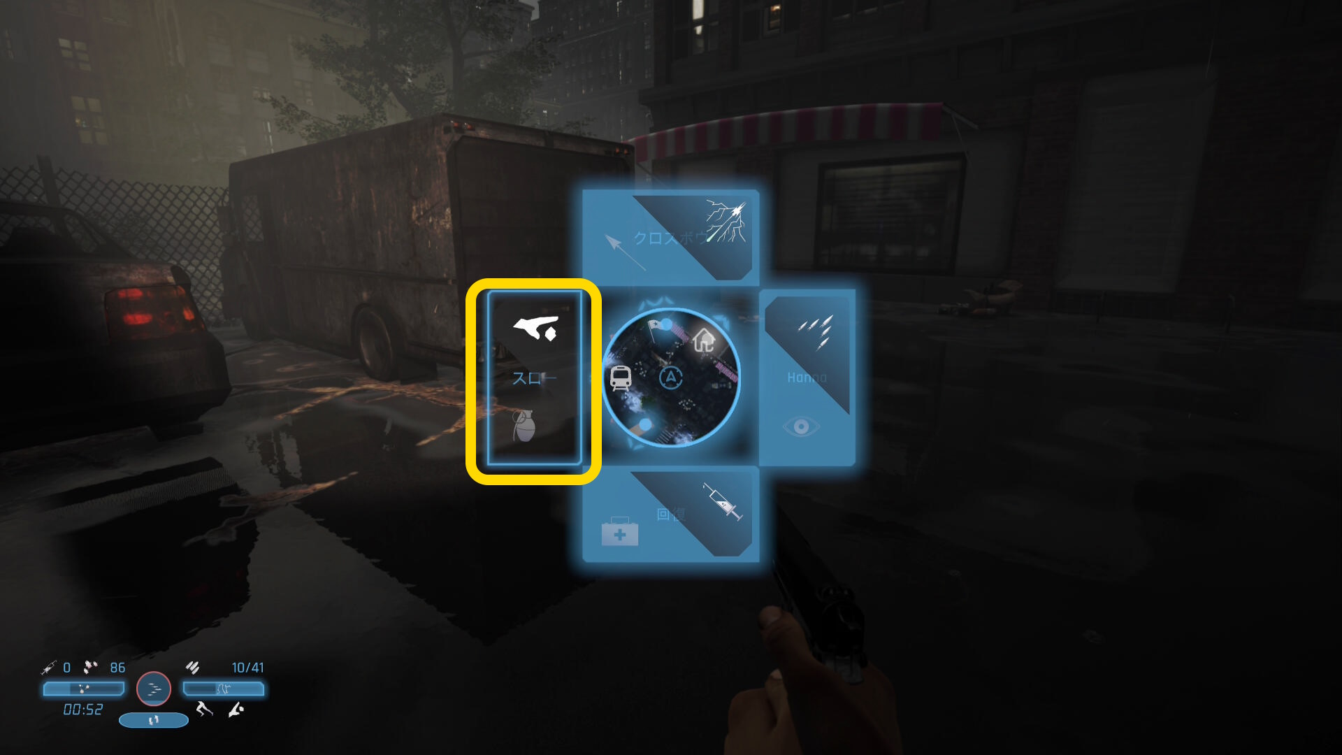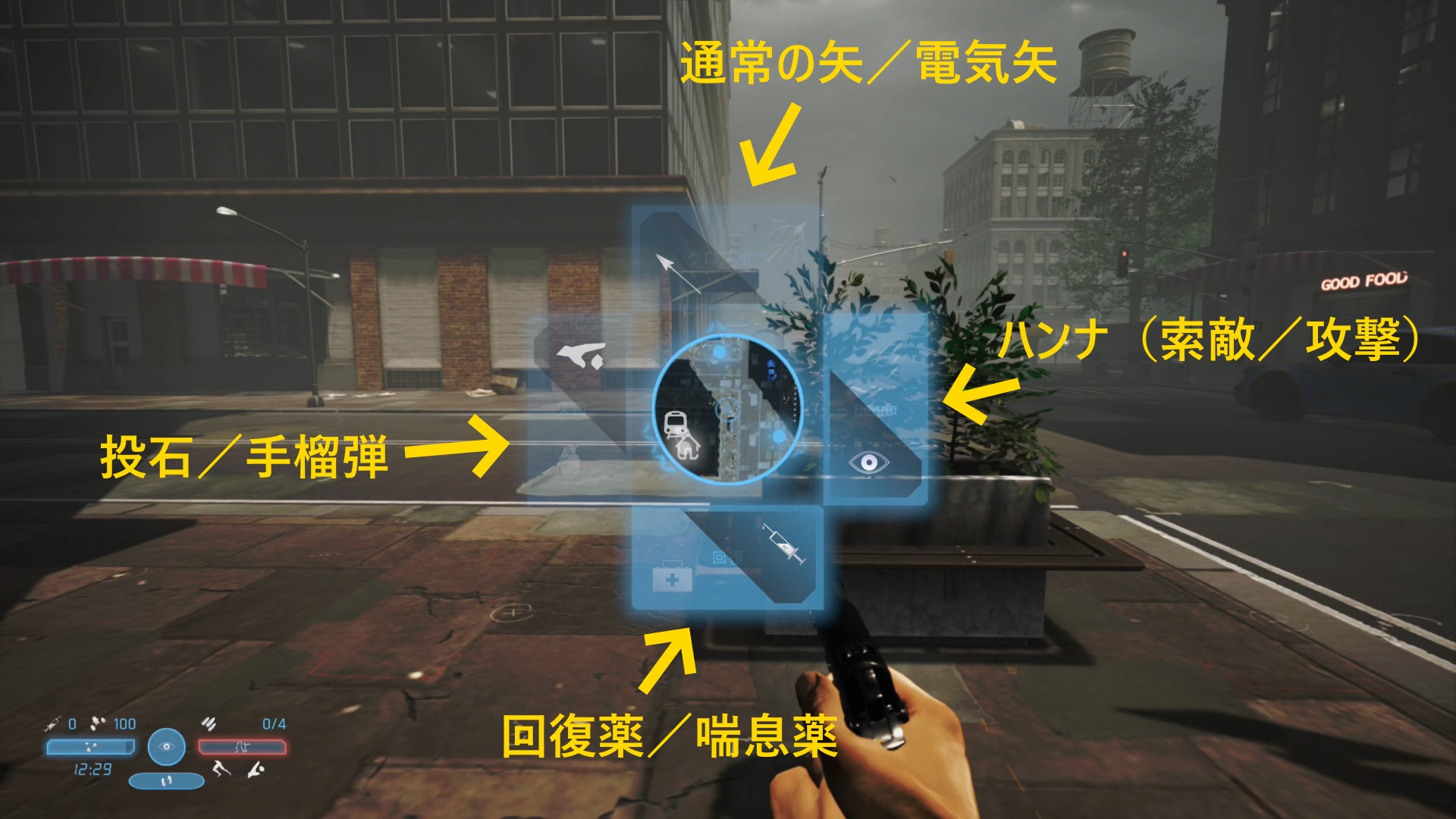 - 主人公が装備しているクロスボウの矢はアパートでのみ補給できる