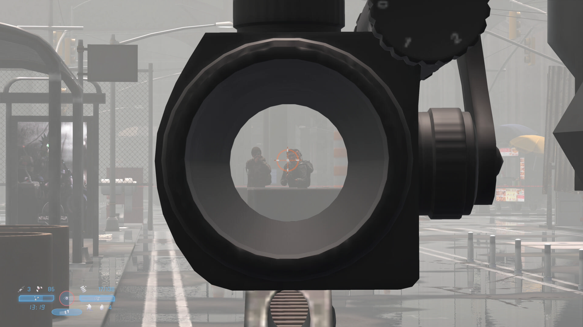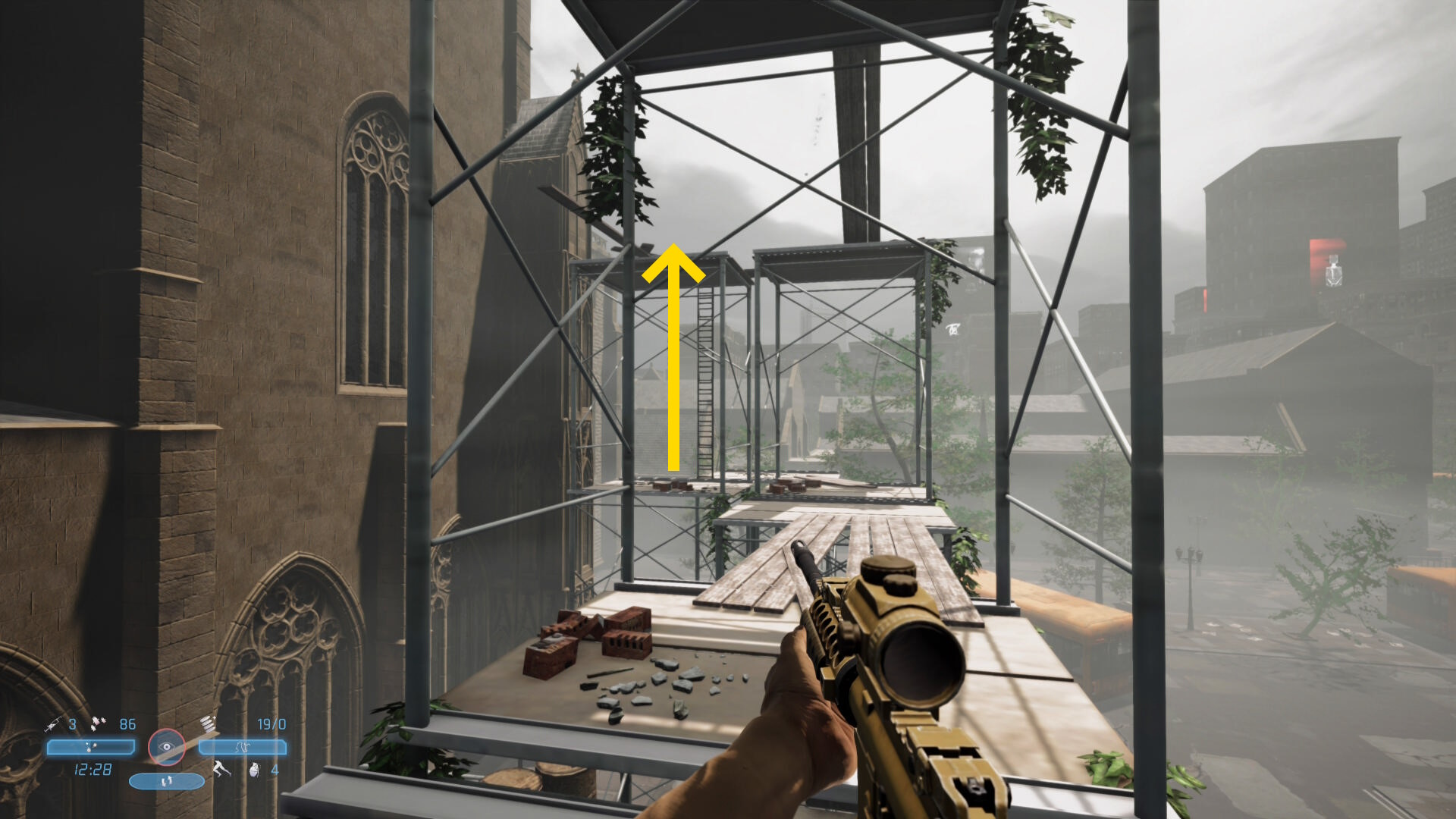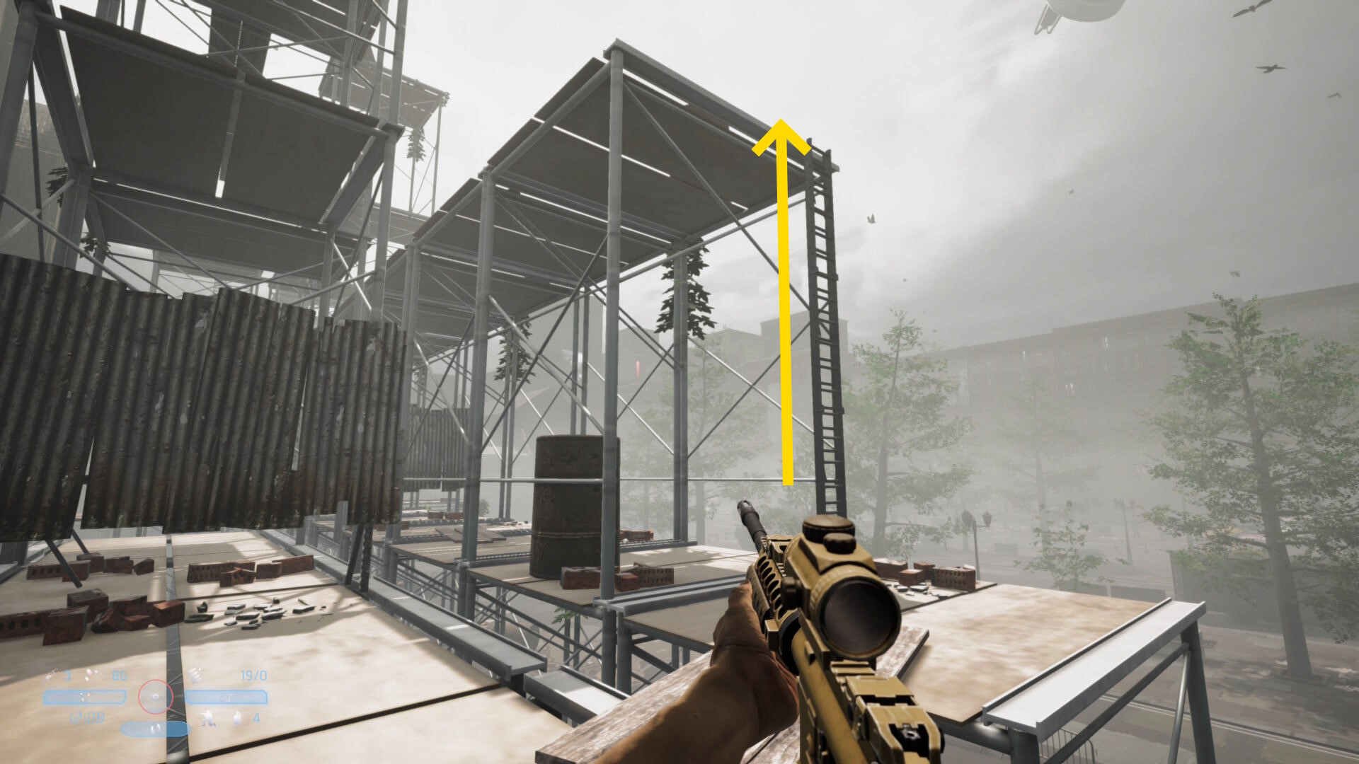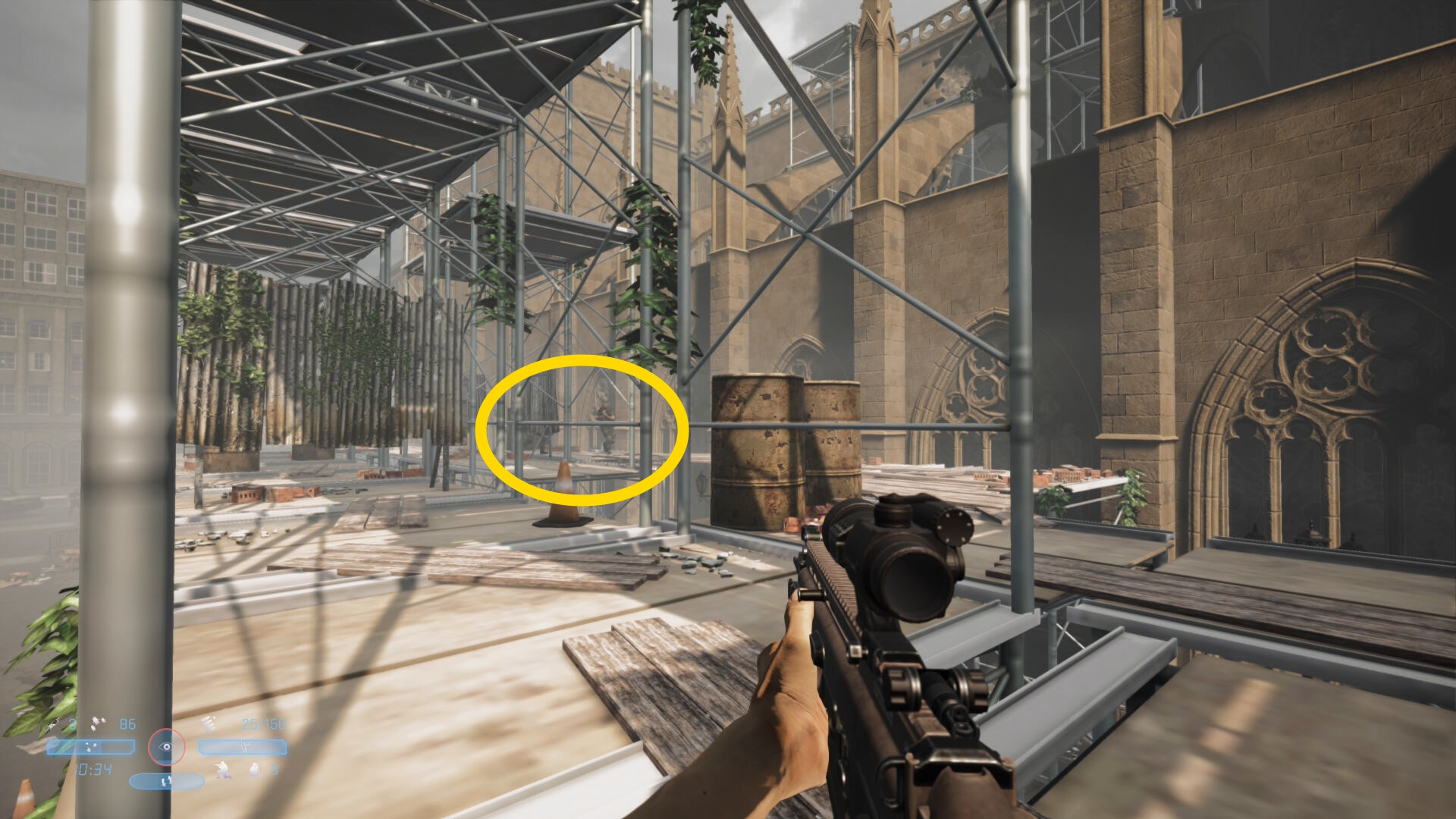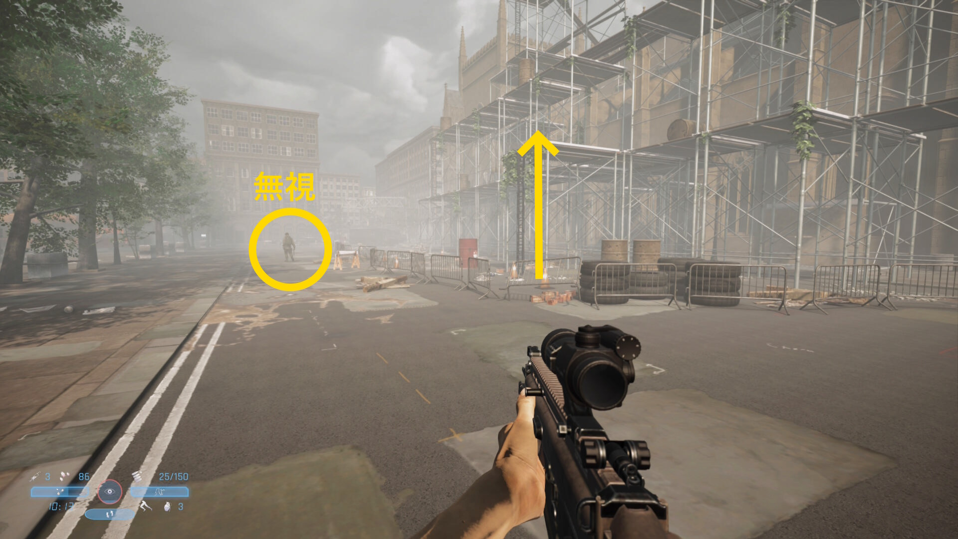 - 通常で3,4人、多ければ5人の敵がこちらに気づいて戦闘態勢に入るが、バリケードのところで立ち止まるので戦車のあたりから狙撃していくだけでキルできる
