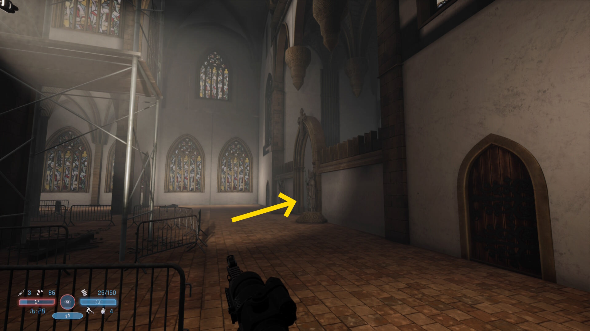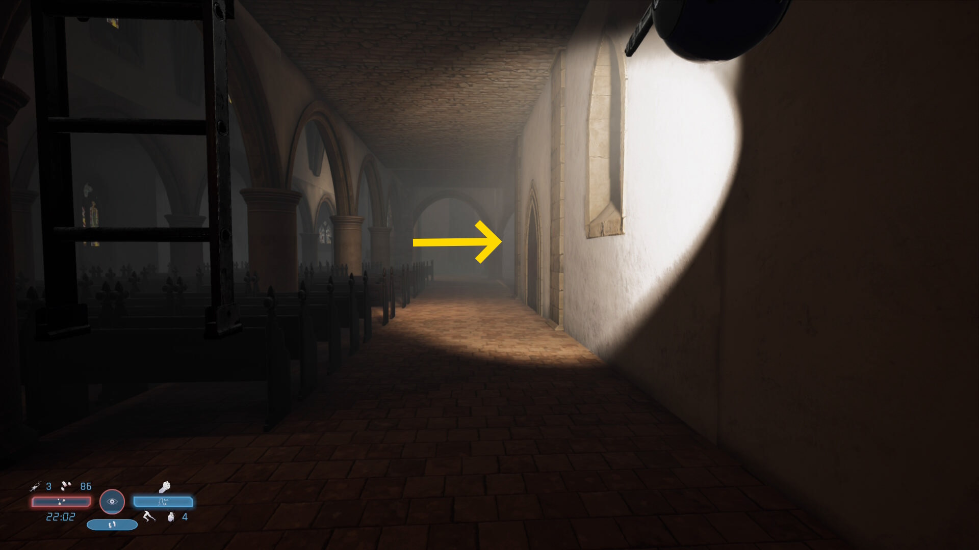 - 左に進み、礼拝堂に戻る