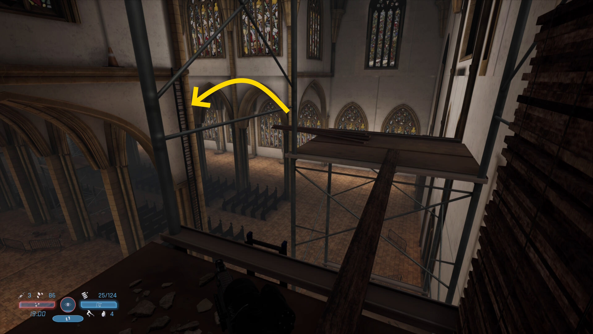 - 壁際のへりを移動してハシゴを登る