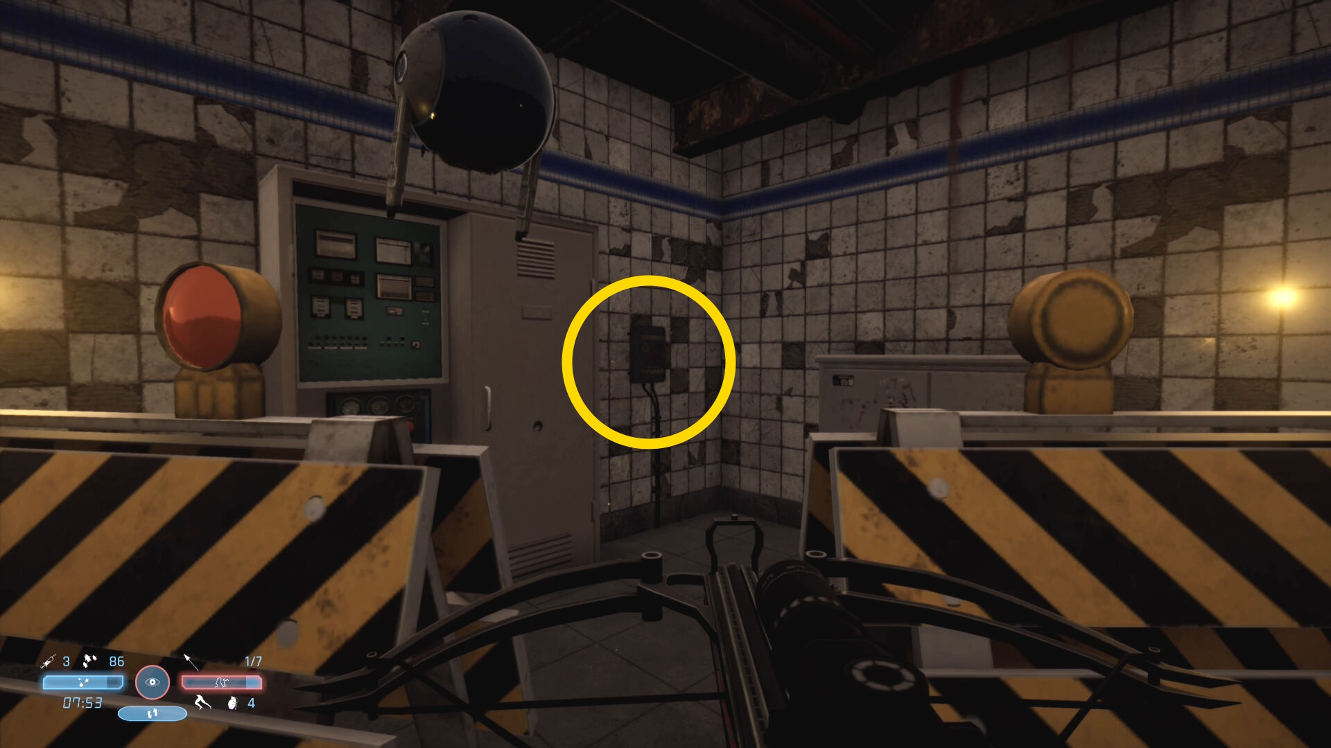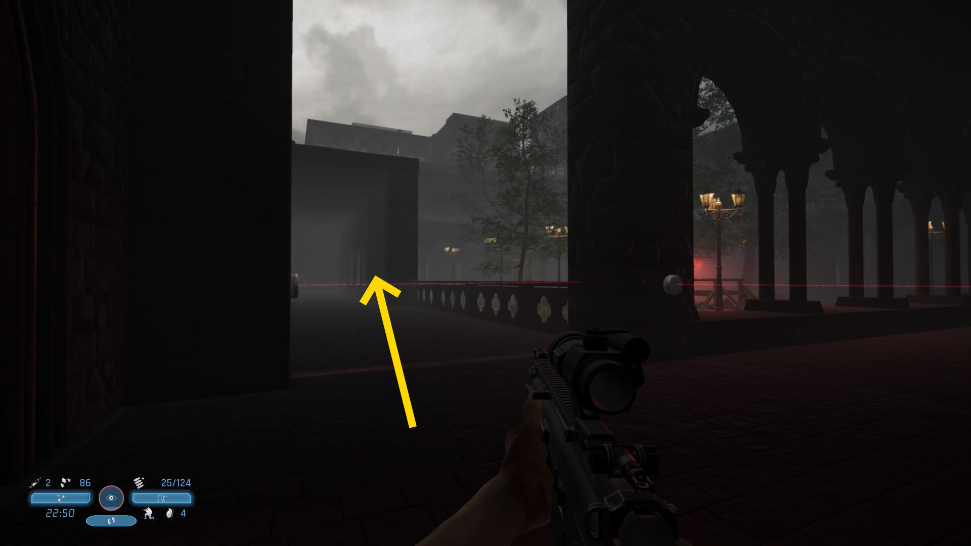 - 途中、数人の敵をキルしながら進むとレーザー式警報装置がある